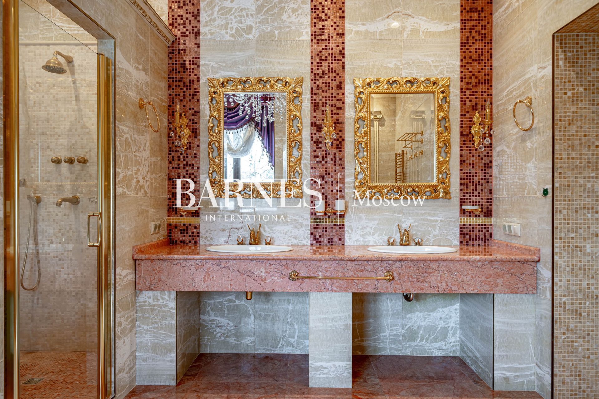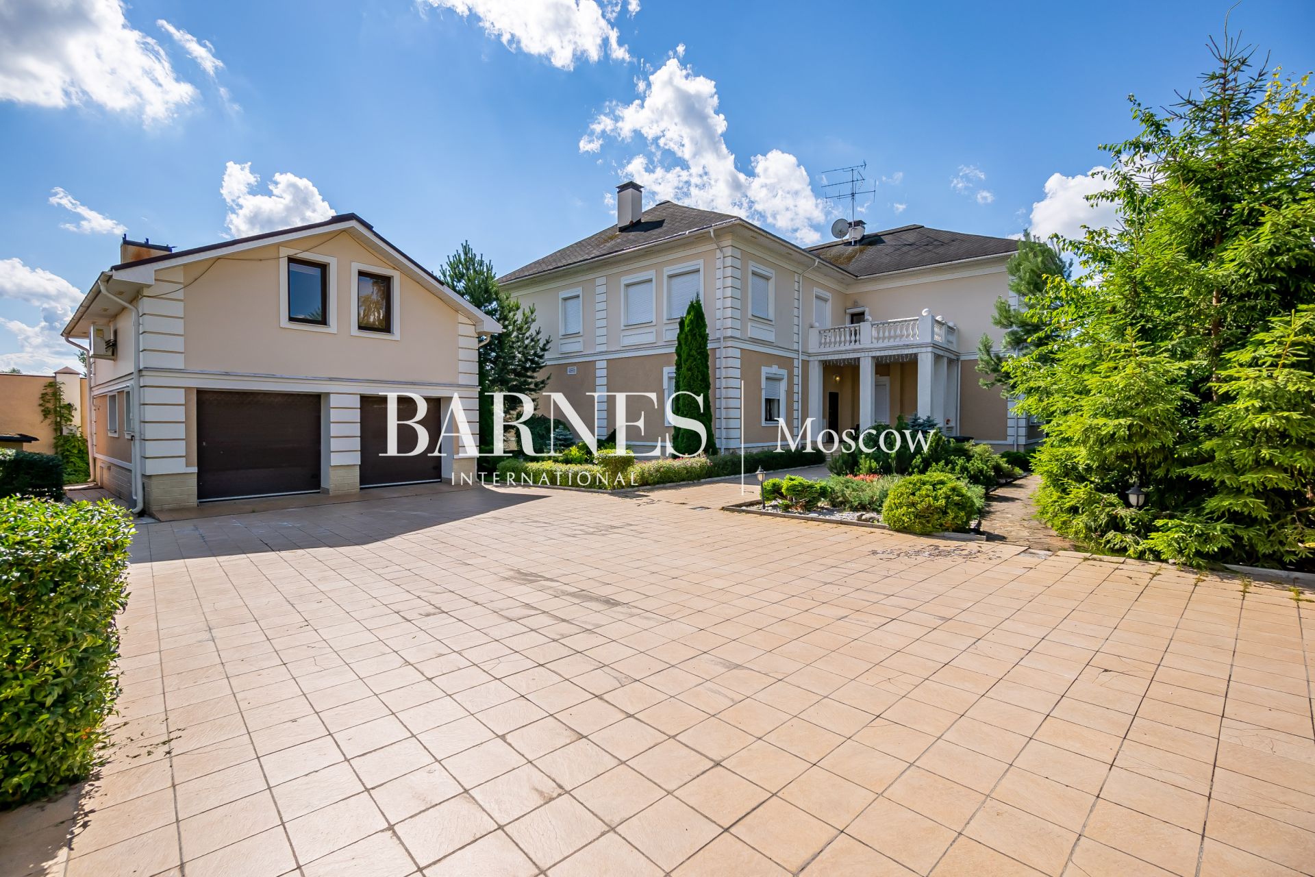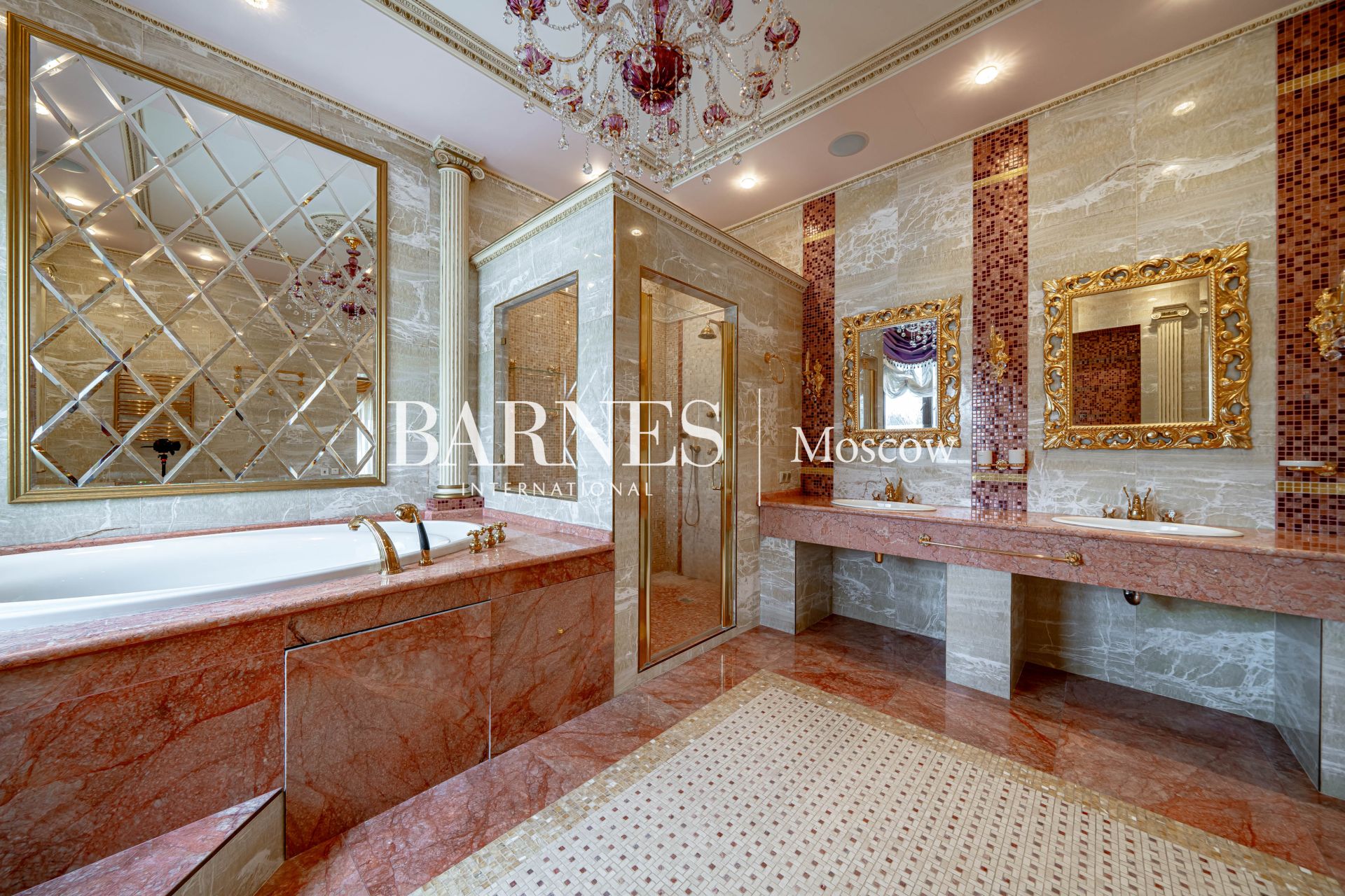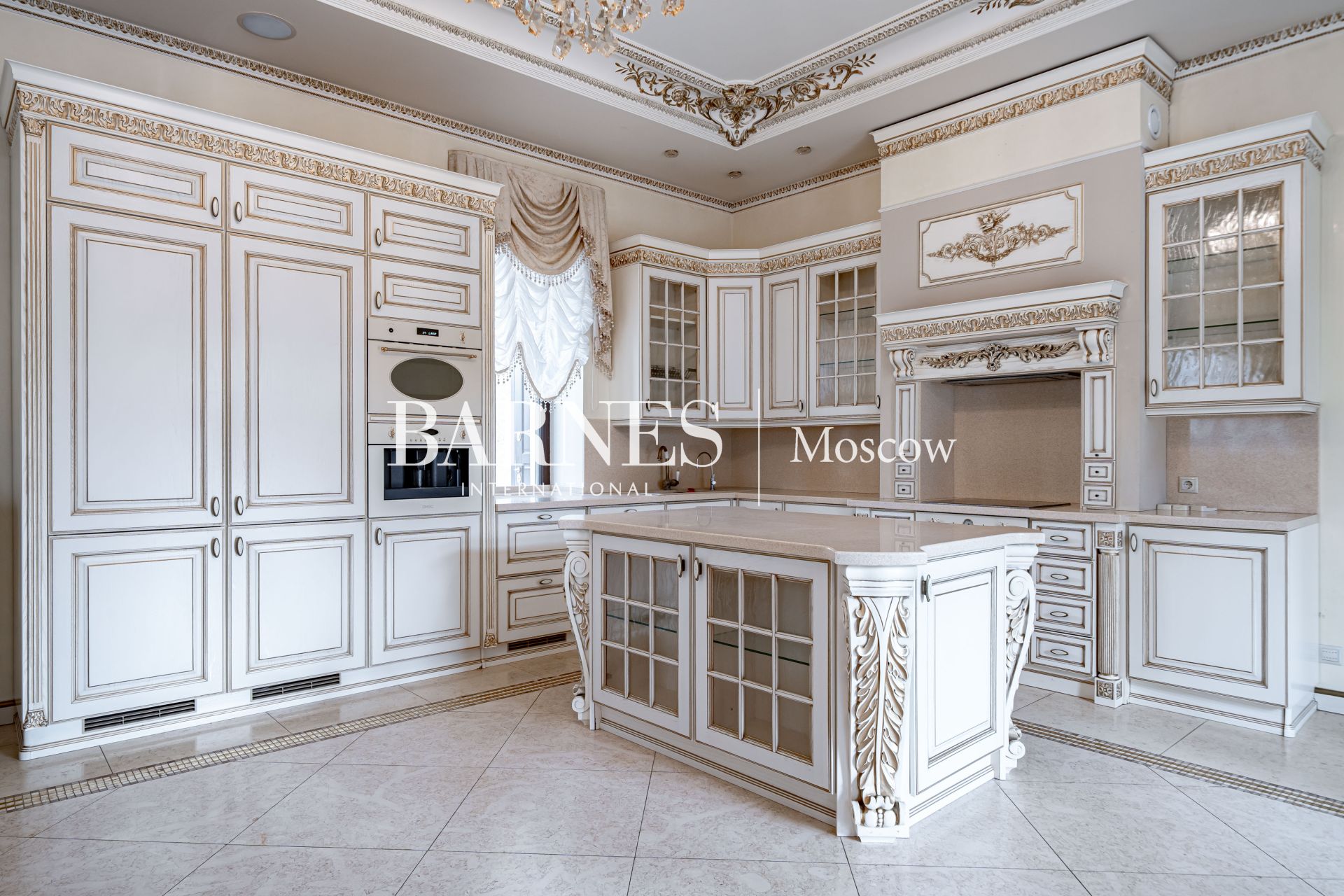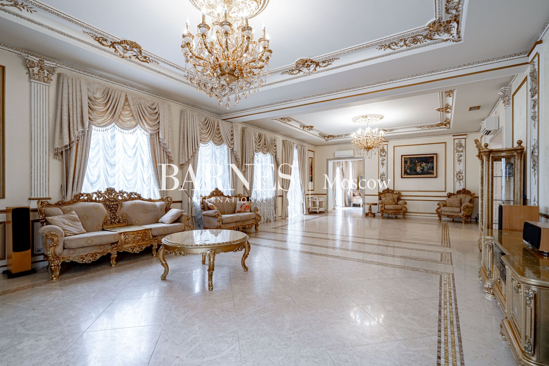 Внешний вид и интерьеры выполнены в классическом стиле. Удобная планировка включает в себя камин на дровах, полы из мрамора с золотой мозаикой и подогревом, кинозал, массажный кабинет, 4 ванные комнаты, 7 спальных комнат и гардеробную.