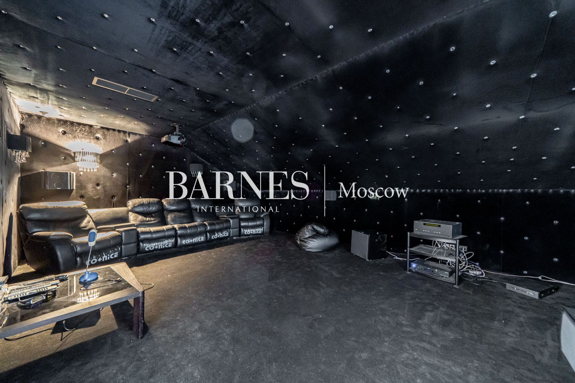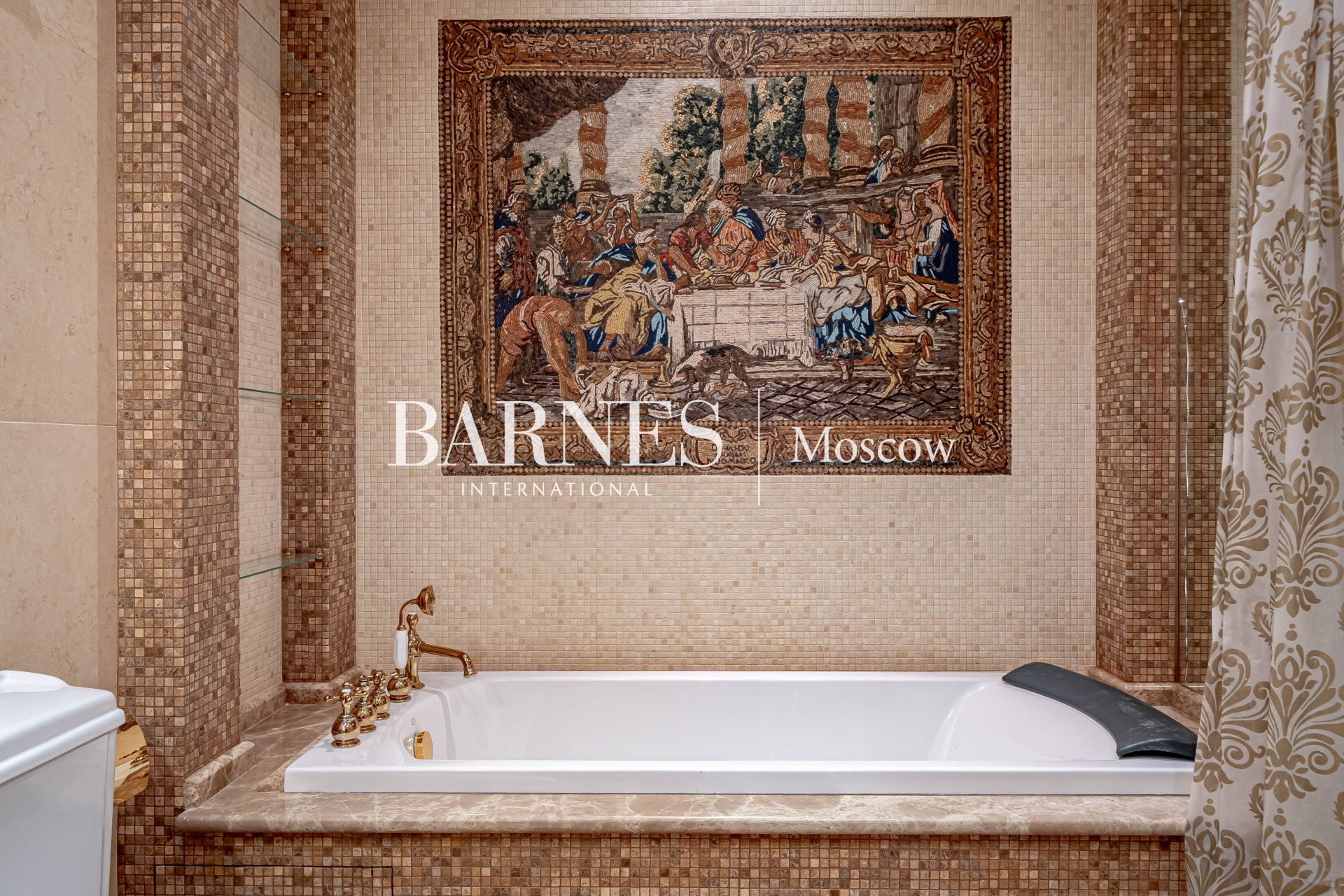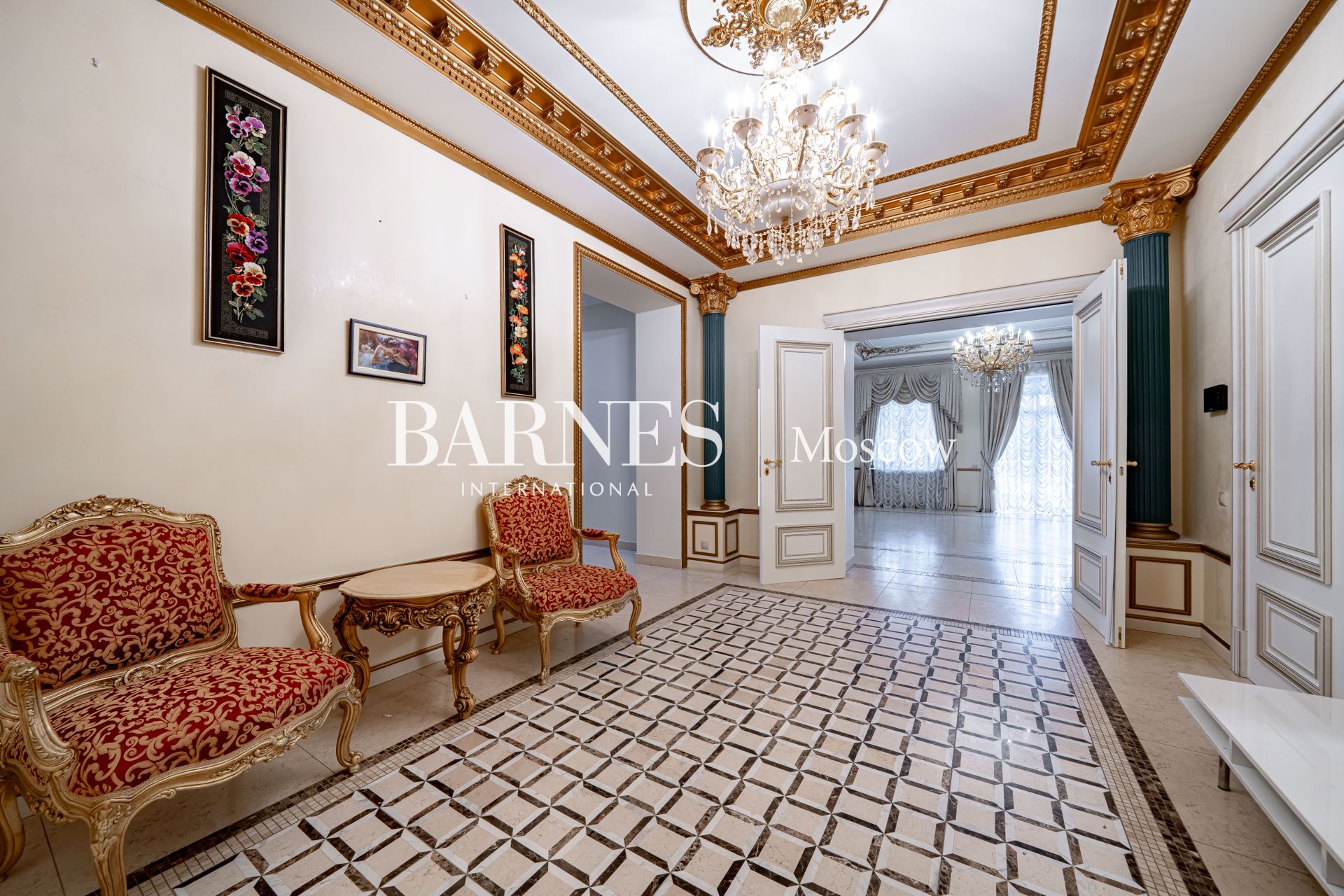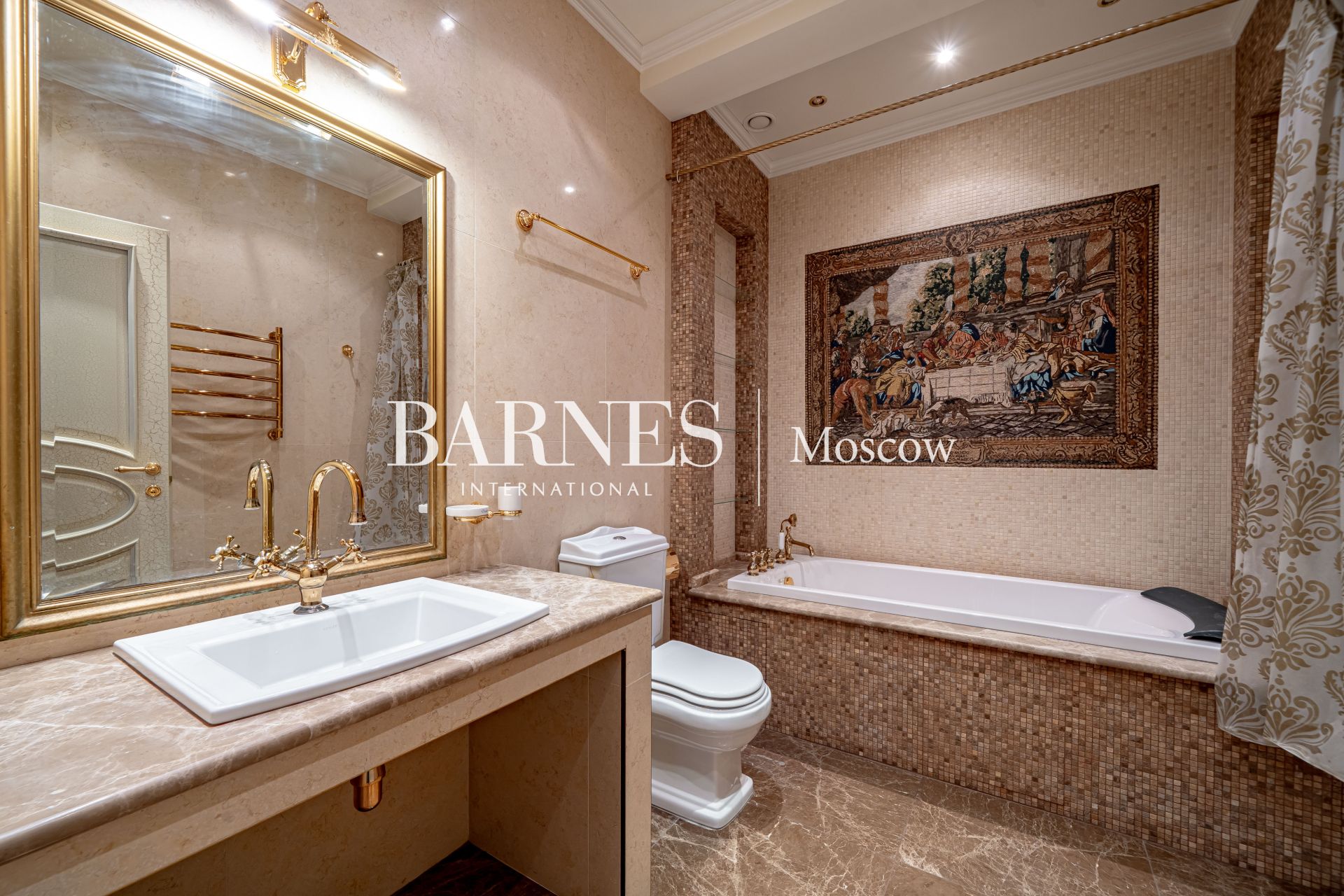 Внешний вид и интерьеры выполнены в классическом стиле. Удобная планировка включает в себя камин на дровах, полы из мрамора с золотой мозаикой и подогревом, кинозал, массажный кабинет, 4 ванные комнаты, 7 спальных комнат и гардеробную.