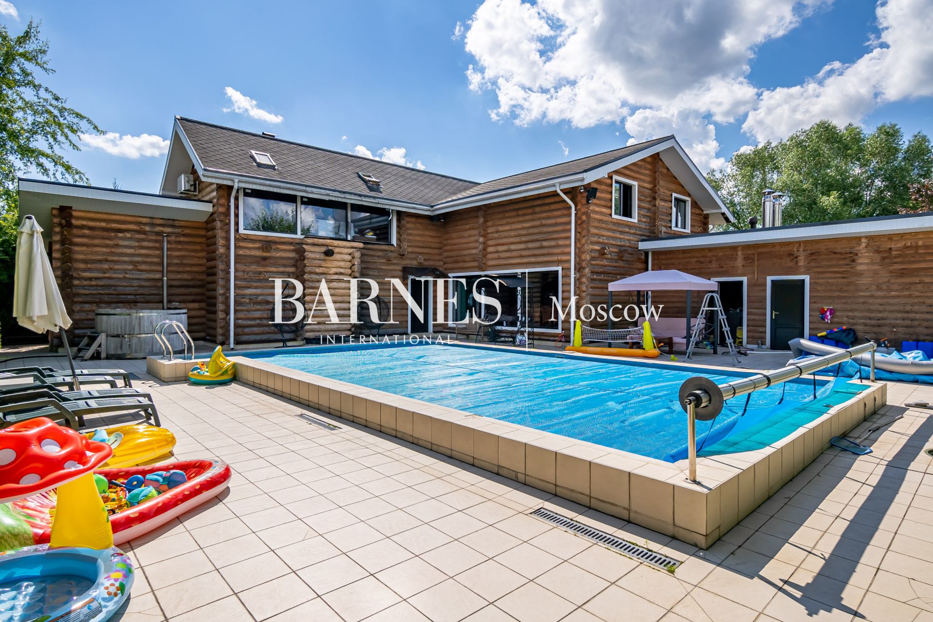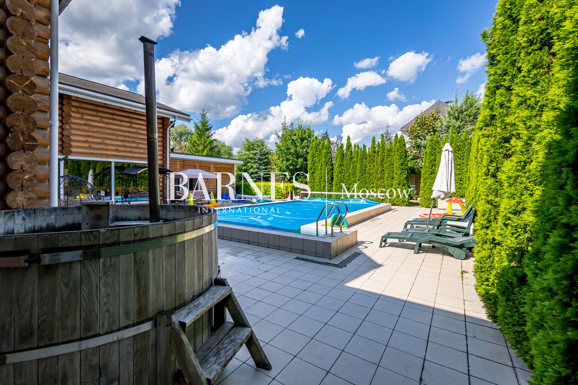 Открытый бассейн с противотоком и подогревом окружающей территории обеспечивает прекрасный отдых на свежем воздухе. Шезлонги, качели и музыкальное освещение создают атмосферу релаксации и комфорта.