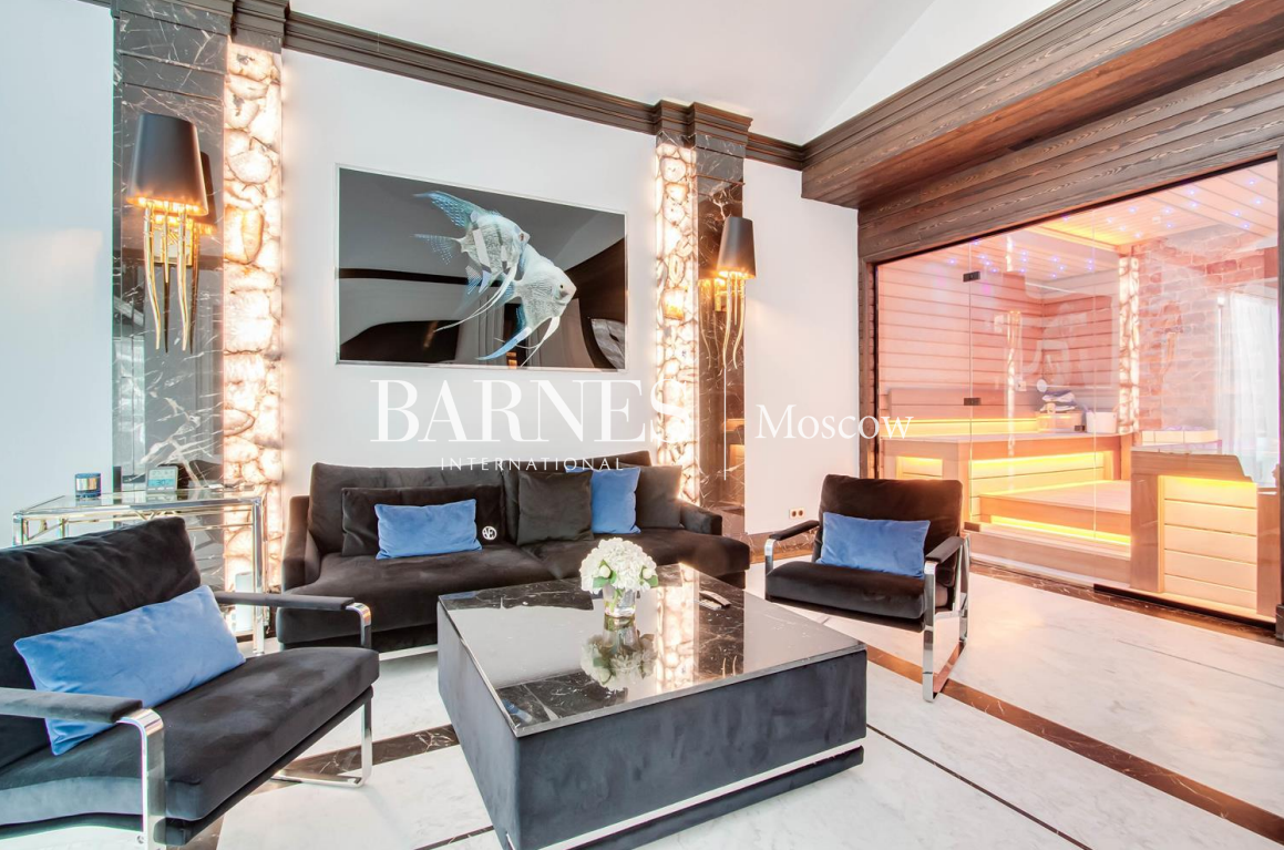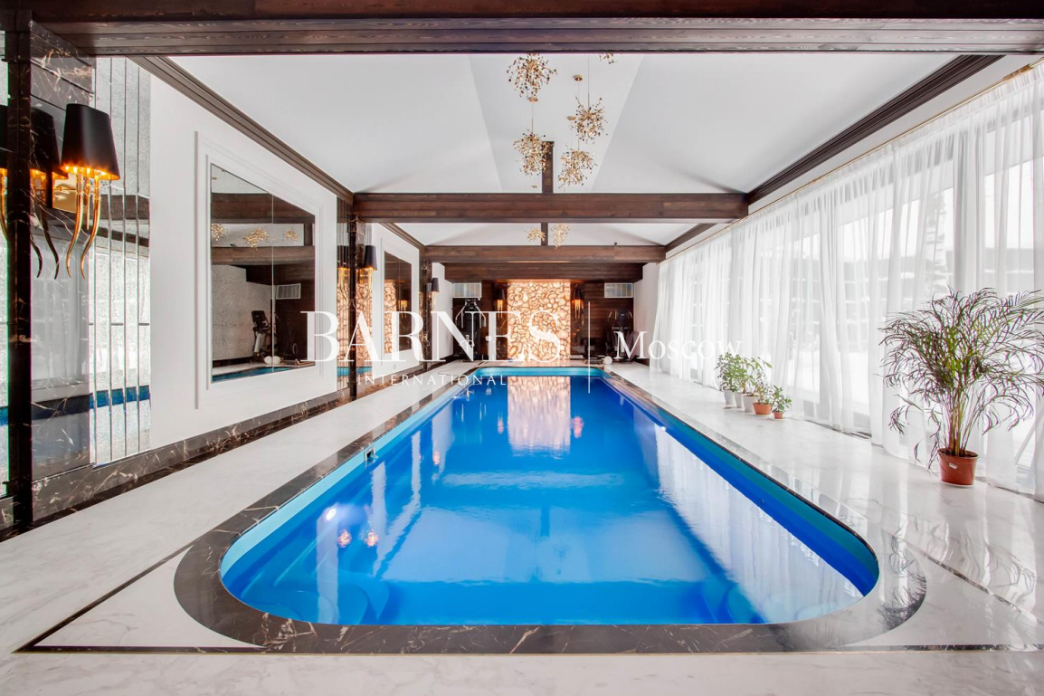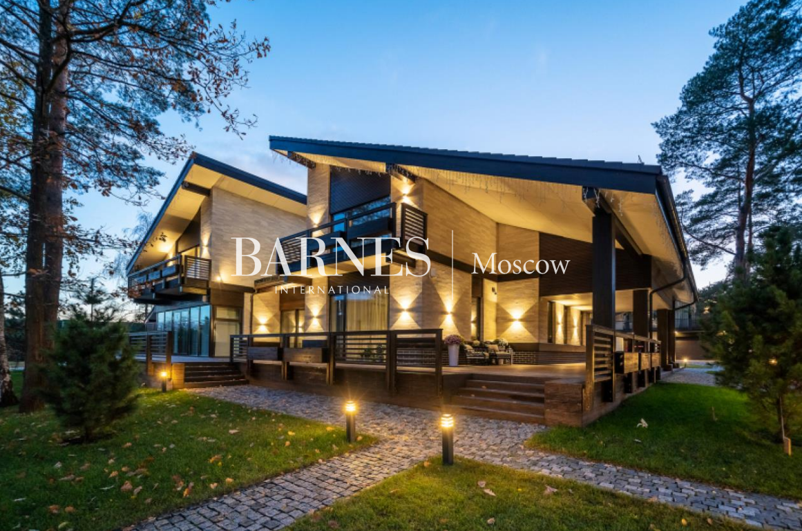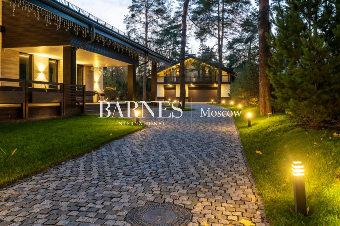 Дом площадью 1000 кв.м расположен на участке площадью 34 сотки и снабжен всем необходимым для комфортного проживания. На территории участка расположен гостевой дом с гаражом на два машиноместа, отдельной квартирой для персонала и беседка для барбекю. Панорамное остекление, просторные террасы и балконы позволяют наслаждаться живописными видами природы и озером.