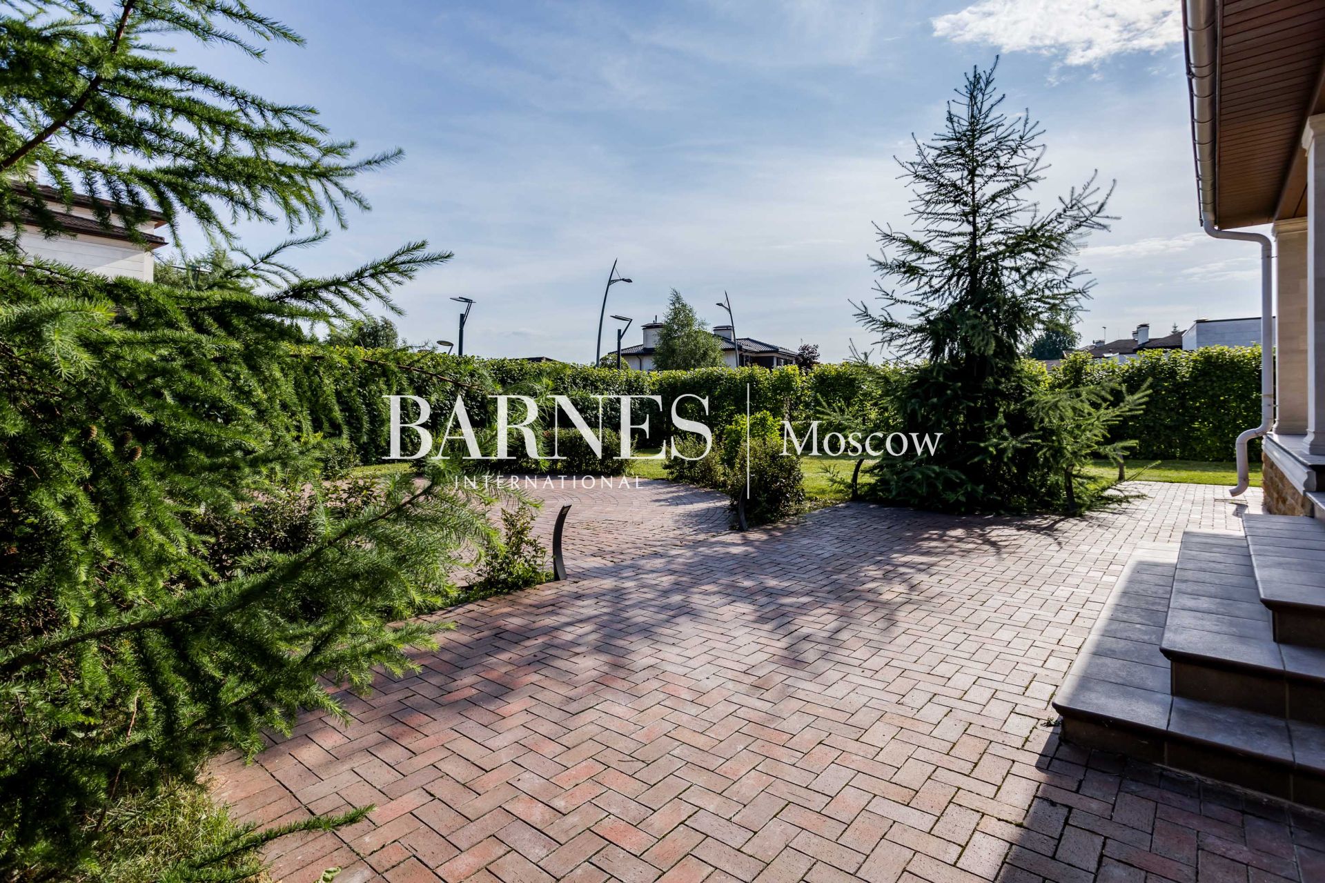 Участок ровный, с ландшафтными работами: газоны, дорожки, освещение, декоративные насаждения, система полива и автополива.