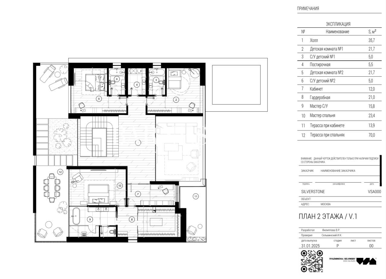 2 этаж: мастер-спальня с с/у, гардеробной и балконом, кабинет с балконом, 2 спальни с с/у и гардеробными.