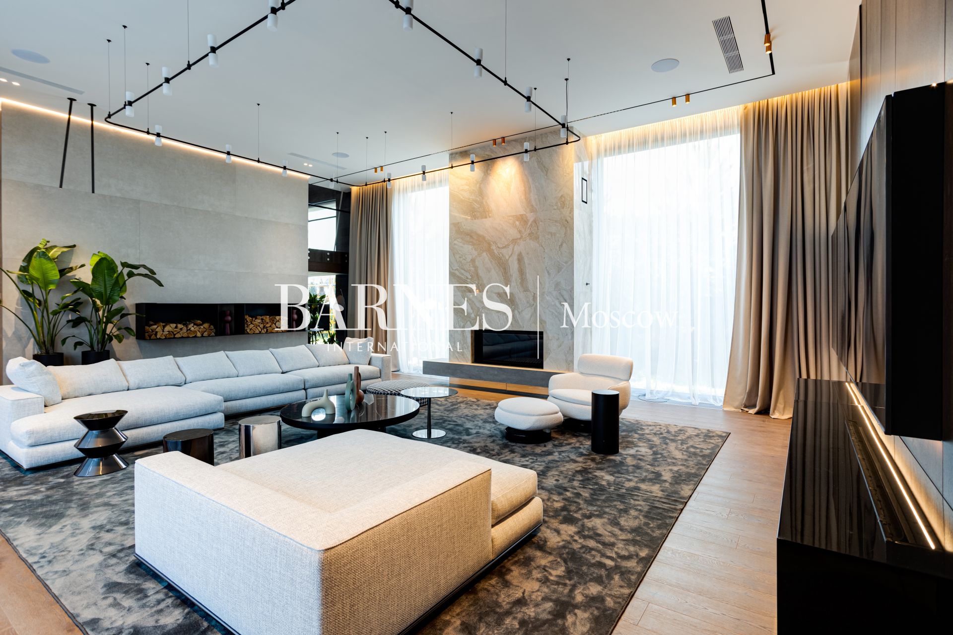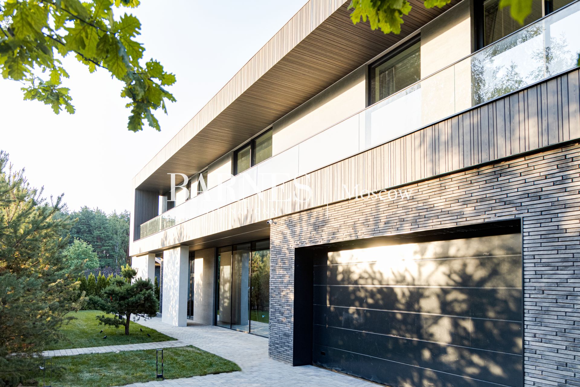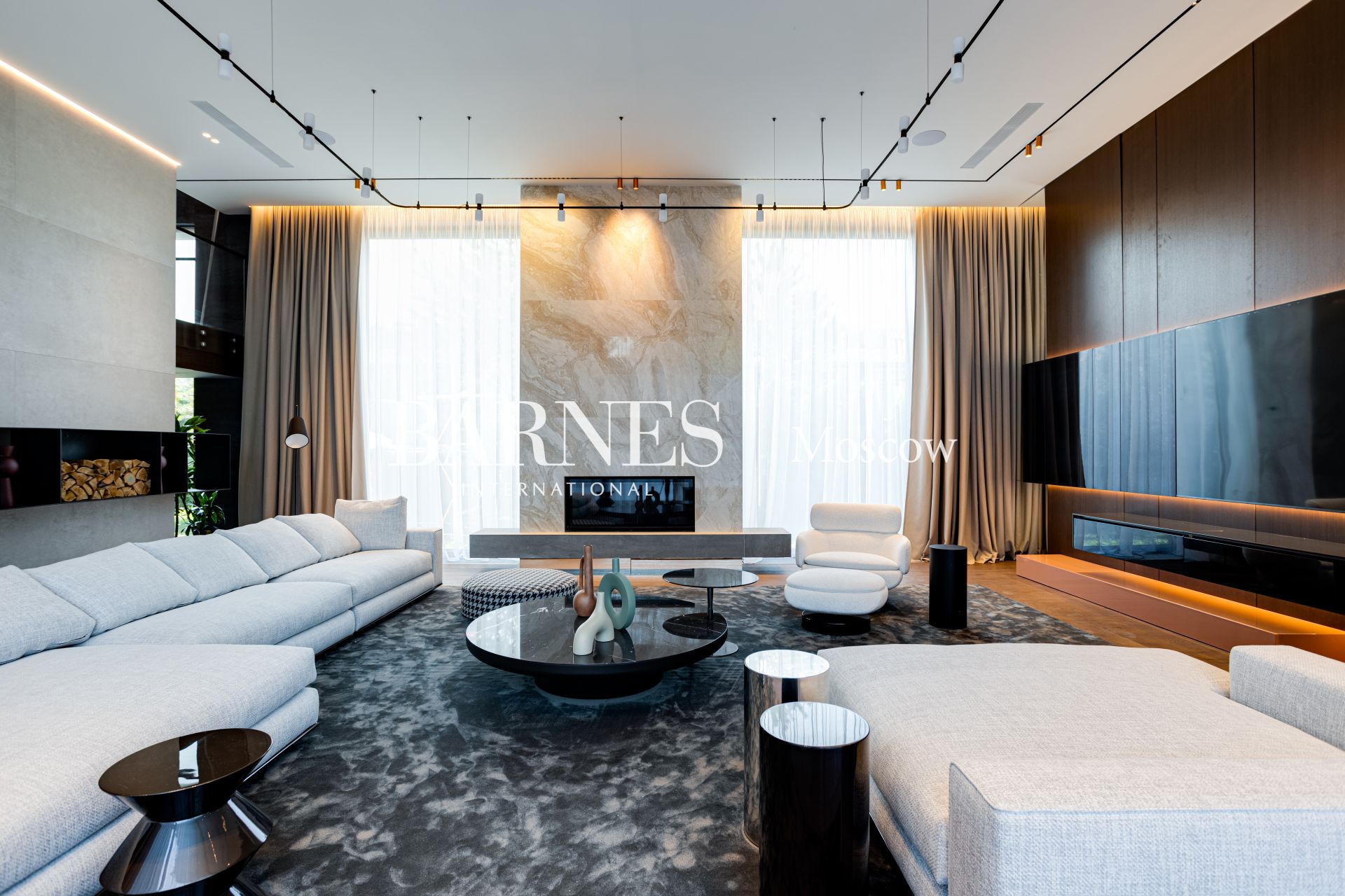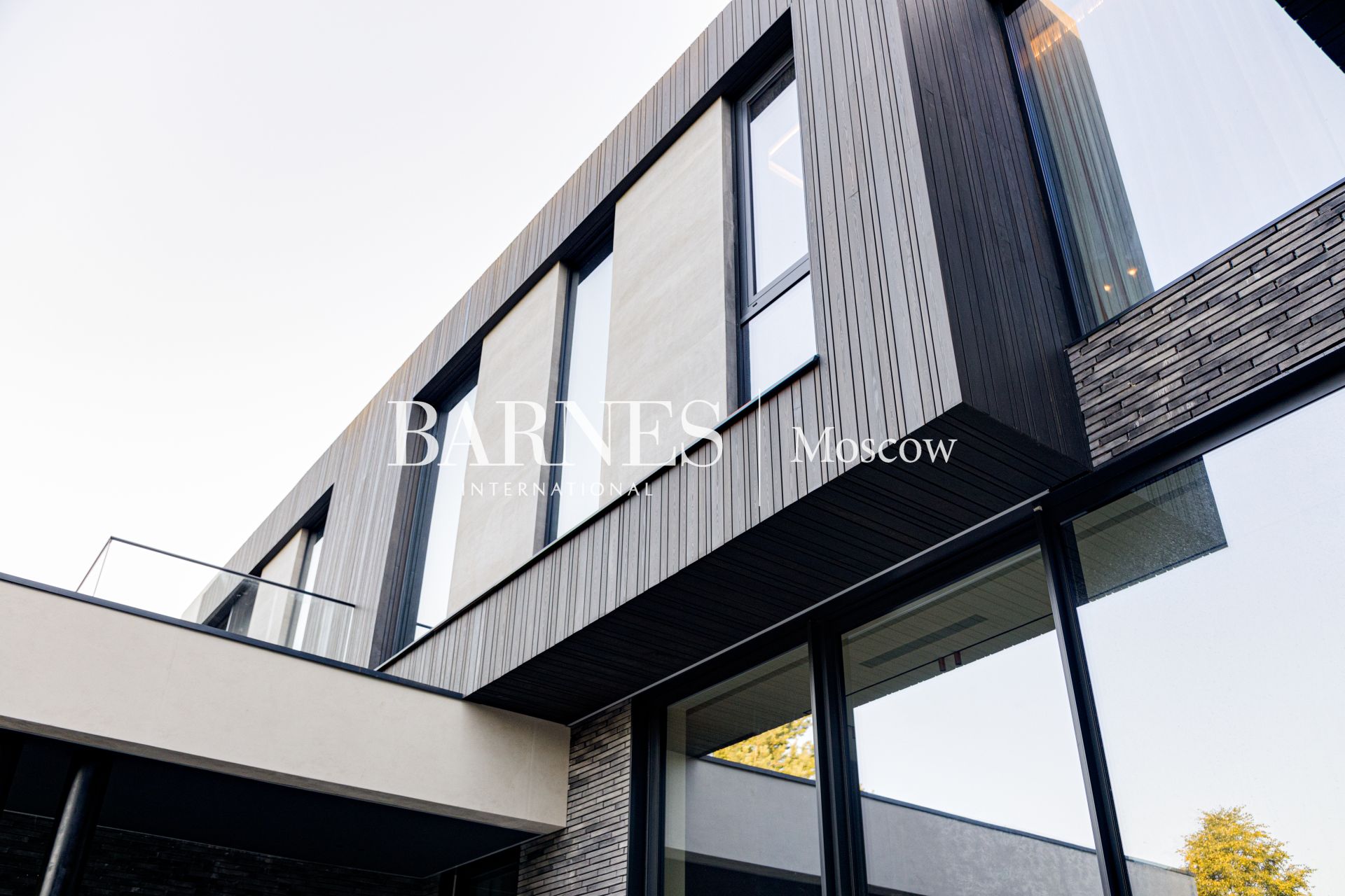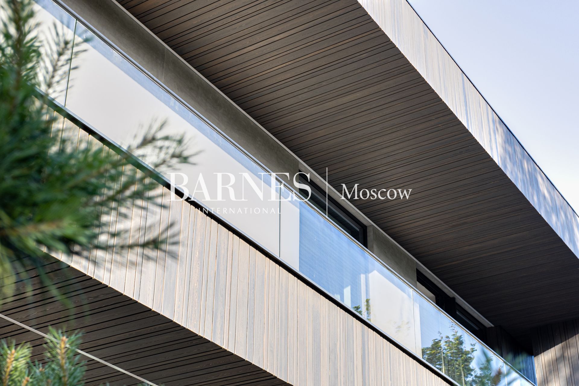 В отделке фасадов применена крупноформатная керамика LAMINAM контрастных цветов и разноширокий термированный планкен. Большие площади остекления визуально связывают внутреннее пространство дома с улицей. Во внутренней отделке дома применяются качественные отделочные материалы - инженерная доска FINEX, керамика LAMINAM, натуральный камень, столярные изделия и панели, двери UNION. Дом оборудован приточно-вытяжной системой с канальным кондиционированием воздуха. В котельной установлены котлы Viessman. Мебель - MINOTTI, POLIFORM, MERIDIANI, Cattelan Italia. Освещение - CENTRSVET, Flos, Vibia. Сантехника - HANSGROHE, Villeroy&Boch, Salini. Бытовая техника - Miele, ASKO.