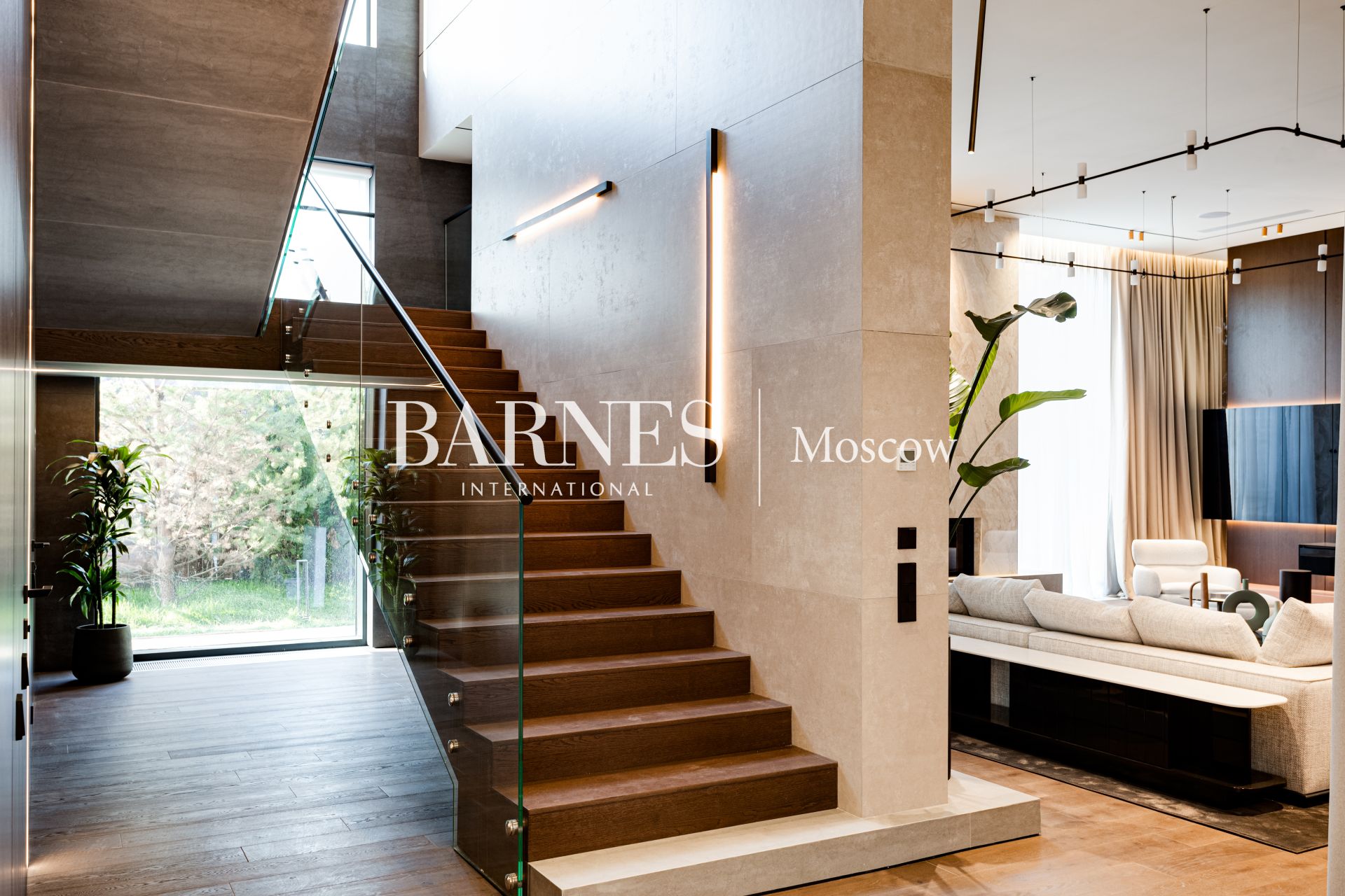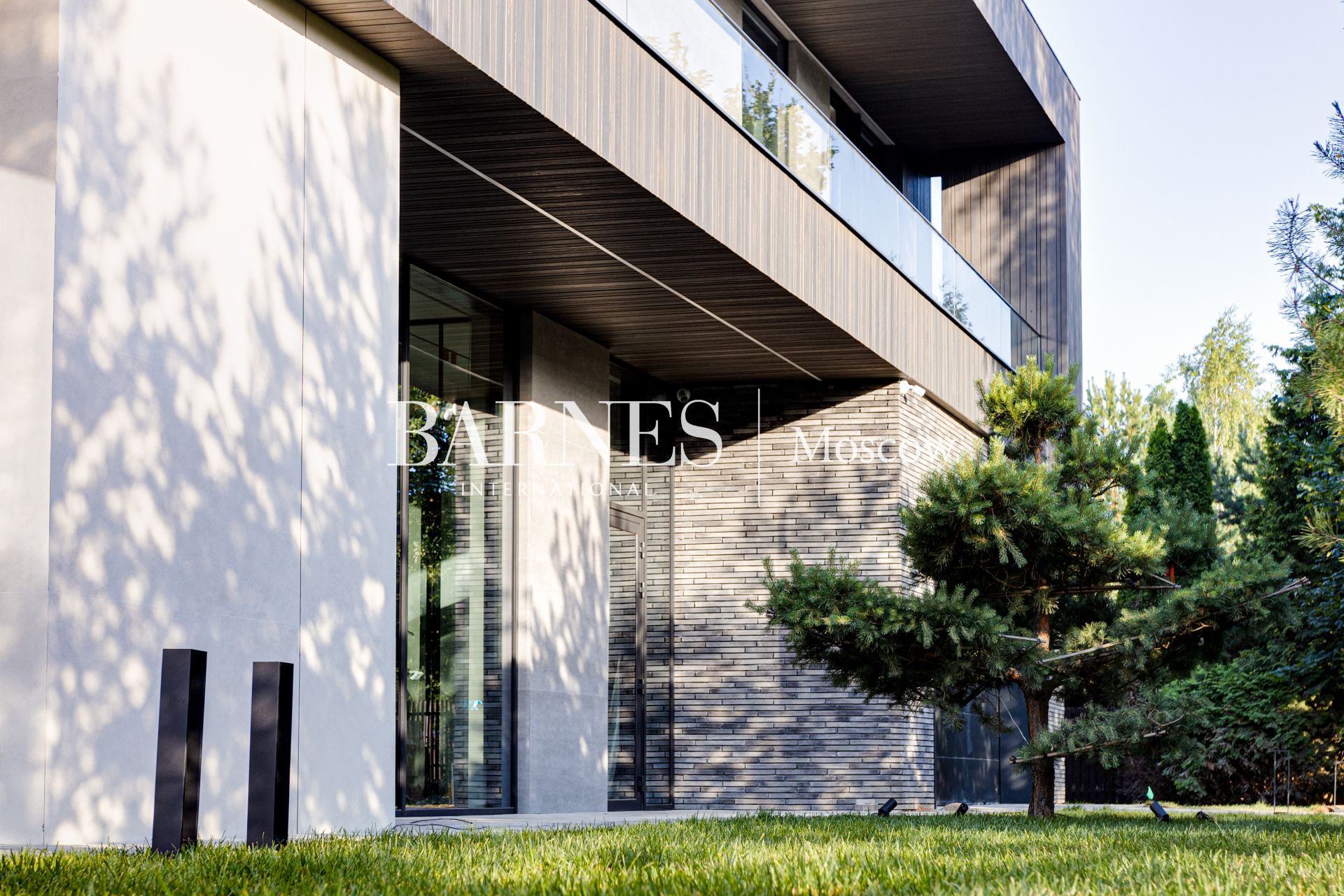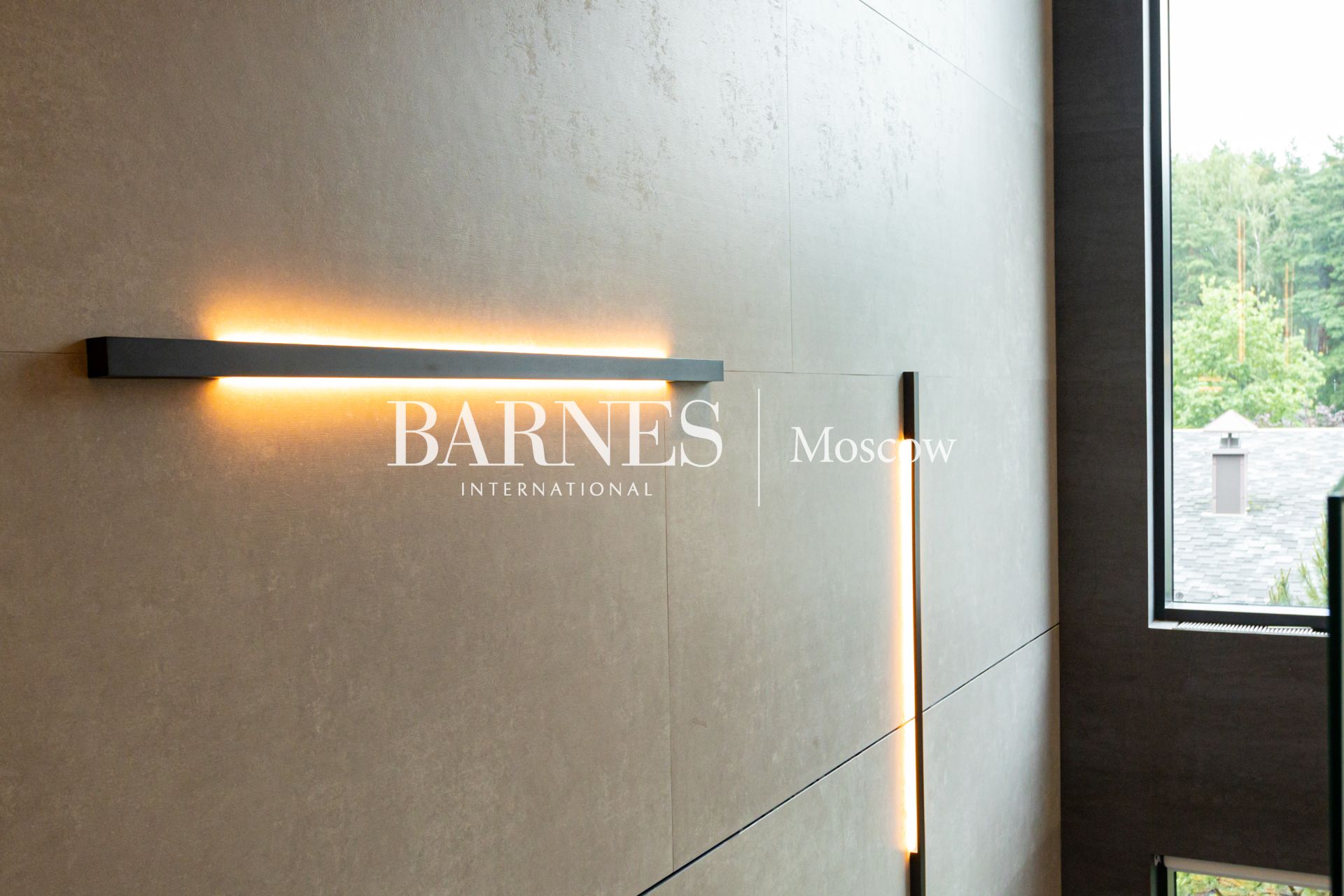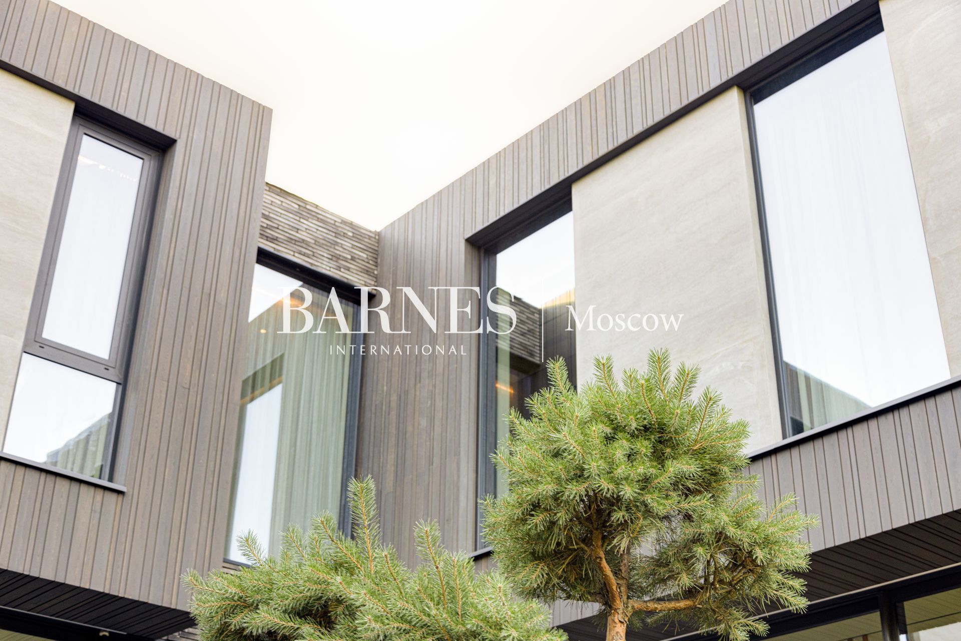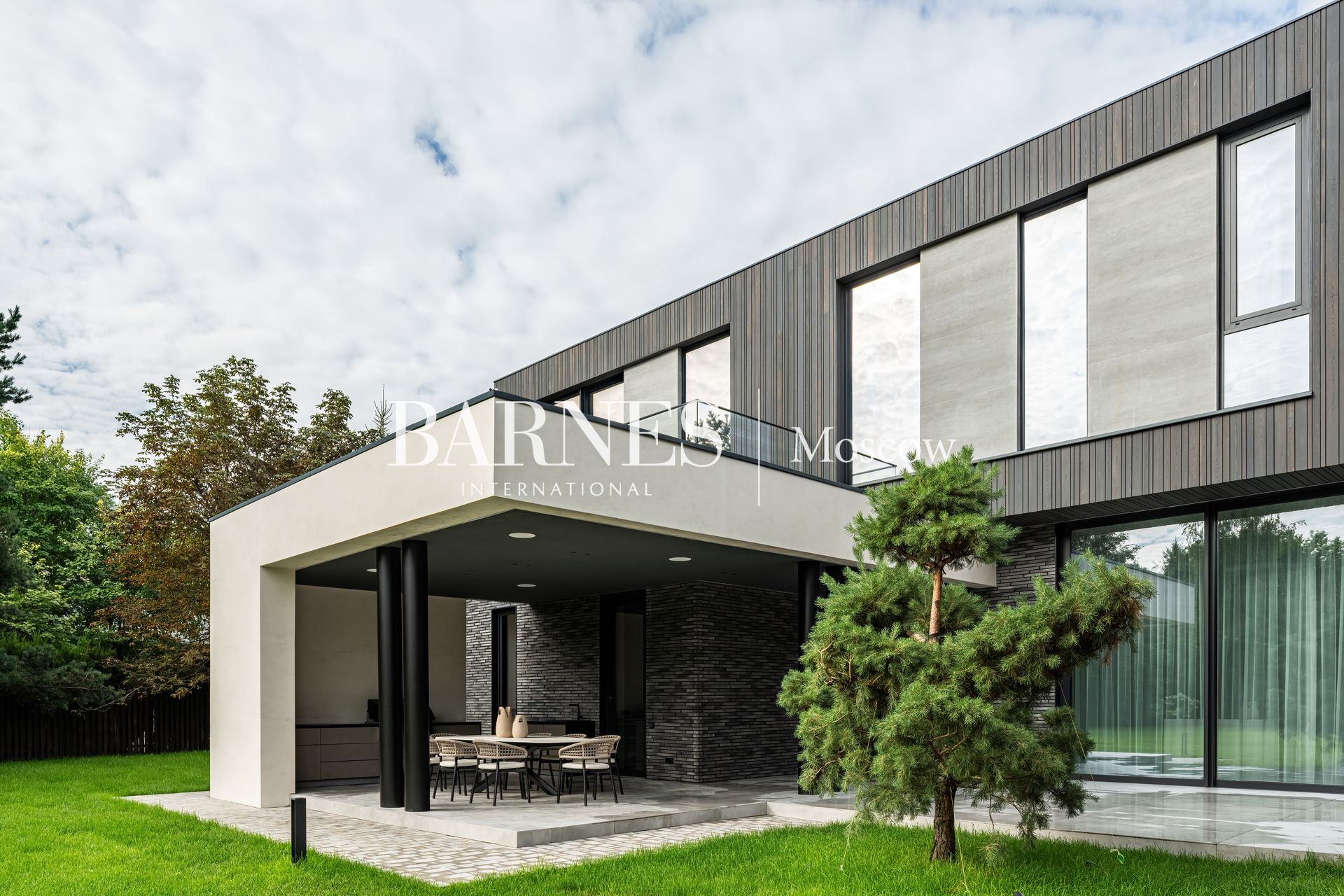 В отделке фасадов применена крупноформатная керамика LAMINAM контрастных цветов и разноширокий термированный планкен. Большие площади остекления визуально связывают внутреннее пространство дома с улицей. Во внутренней отделке дома применяются качественные отделочные материалы - инженерная доска FINEX, керамика LAMINAM, натуральный камень, столярные изделия и панели, двери UNION. Дом оборудован приточно-вытяжной системой с канальным кондиционированием воздуха. В котельной установлены котлы Viessman. Мебель - MINOTTI, POLIFORM, MERIDIANI, Cattelan Italia. Освещение - CENTRSVET, Flos, Vibia. Сантехника - HANSGROHE, Villeroy&Boch, Salini. Бытовая техника - Miele, ASKO.