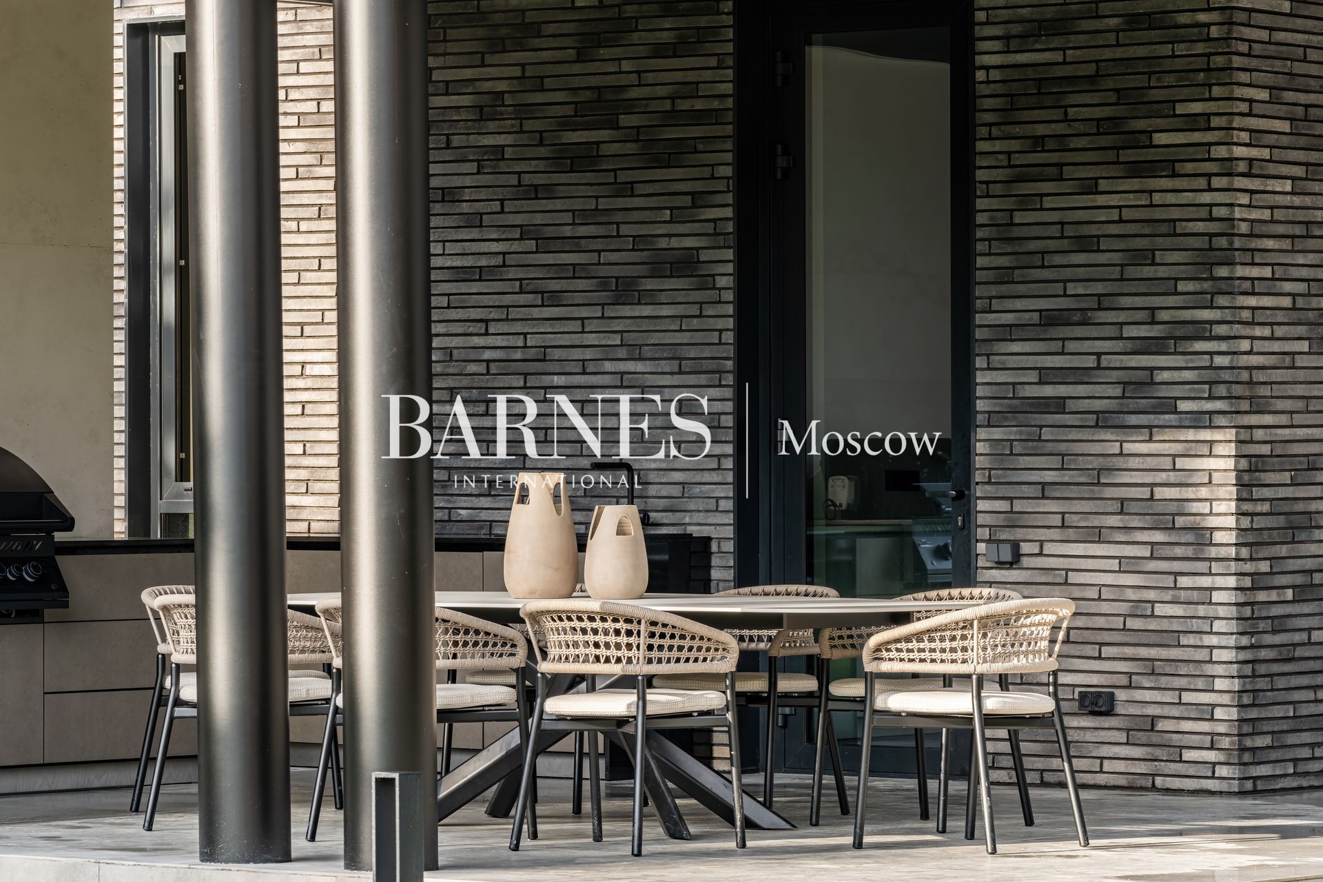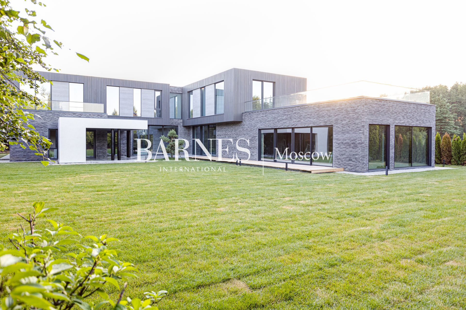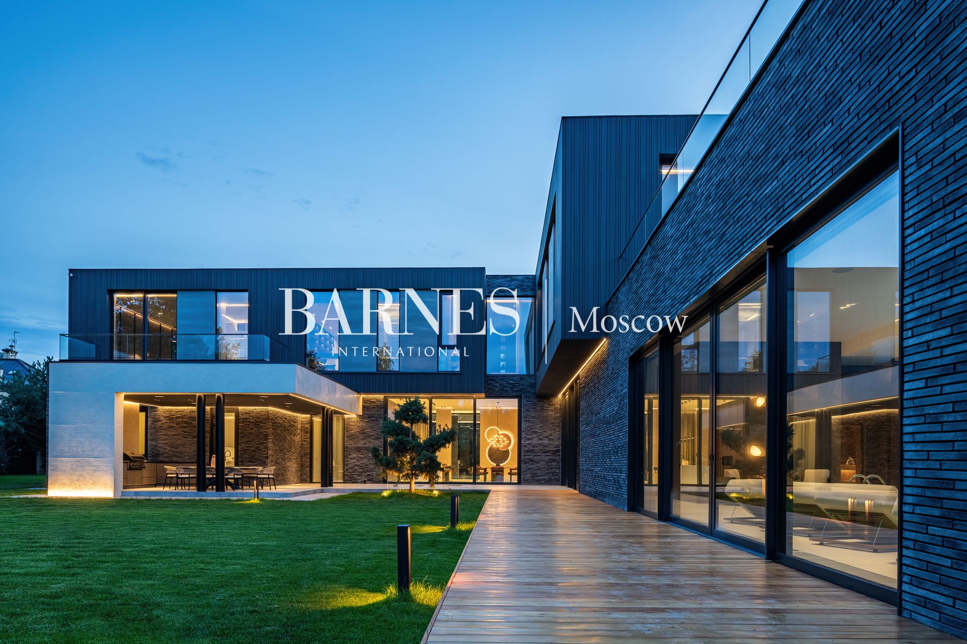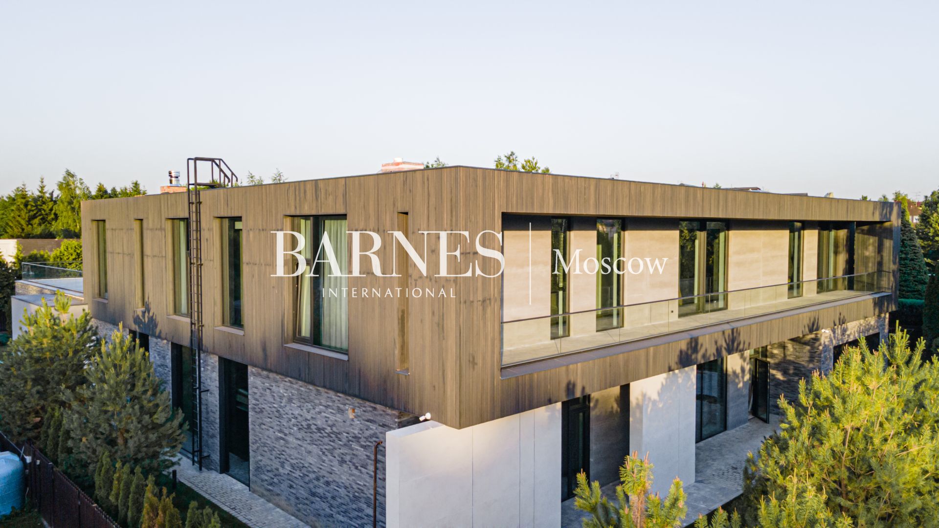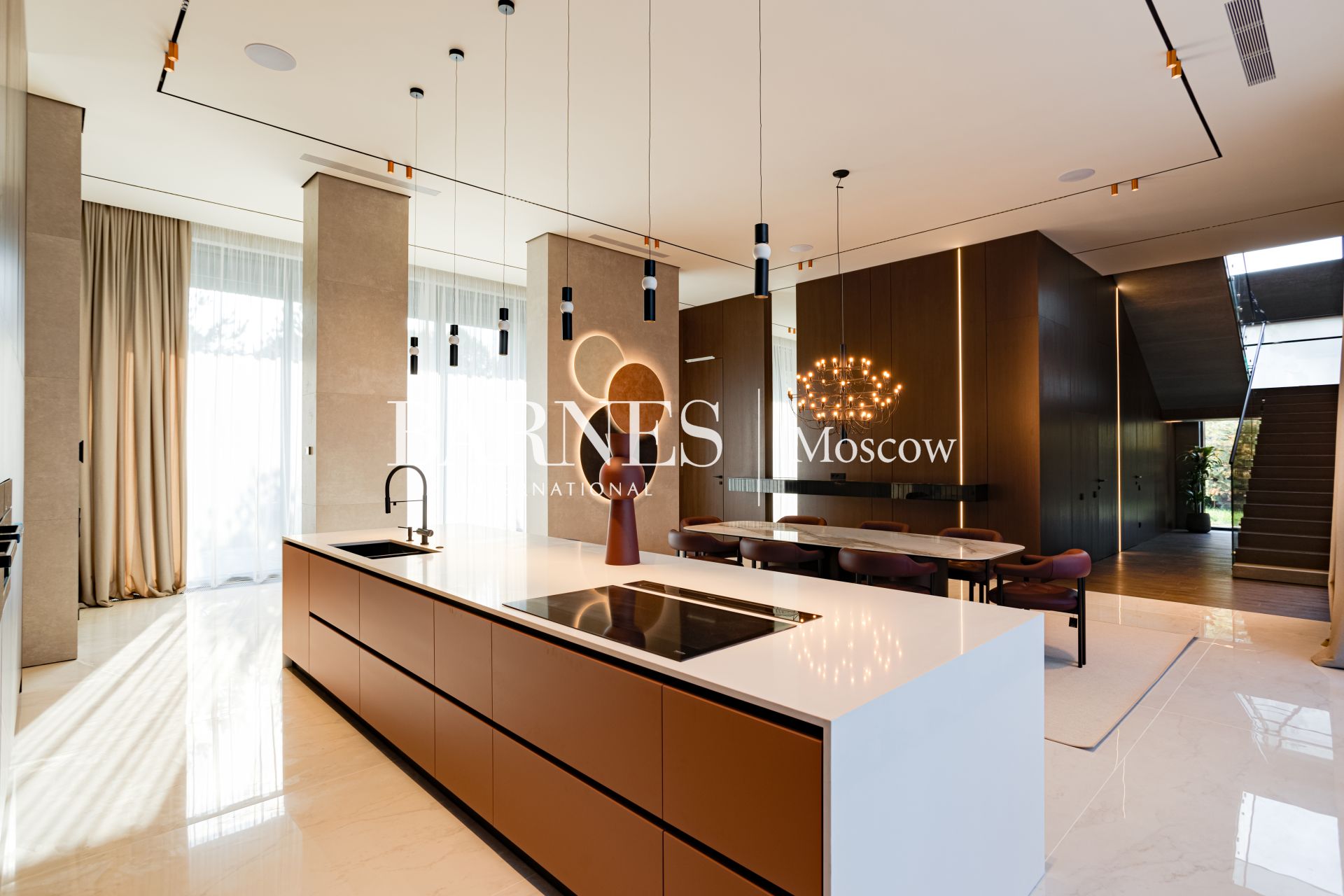 В отделке фасадов применена крупноформатная керамика LAMINAM контрастных цветов и разноширокий термированный планкен. Большие площади остекления визуально связывают внутреннее пространство дома с улицей. Во внутренней отделке дома применяются качественные отделочные материалы - инженерная доска FINEX, керамика LAMINAM, натуральный камень, столярные изделия и панели, двери UNION. Дом оборудован приточно-вытяжной системой с канальным кондиционированием воздуха. В котельной установлены котлы Viessman. Мебель - MINOTTI, POLIFORM, MERIDIANI, Cattelan Italia. Освещение - CENTRSVET, Flos, Vibia. Сантехника - HANSGROHE, Villeroy&Boch, Salini. Бытовая техника - Miele, ASKO.