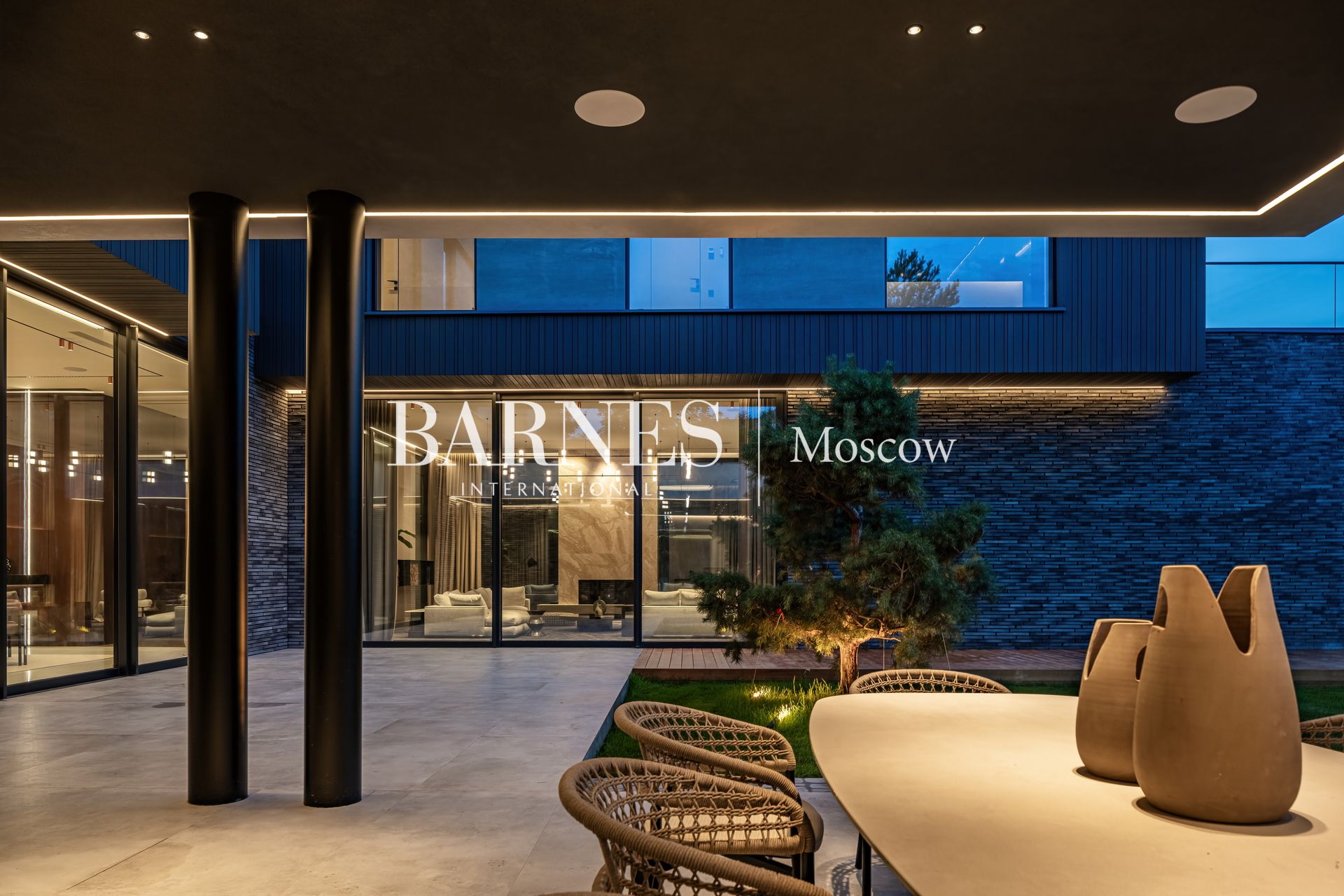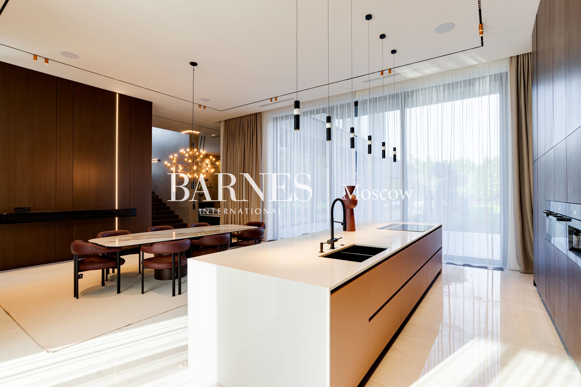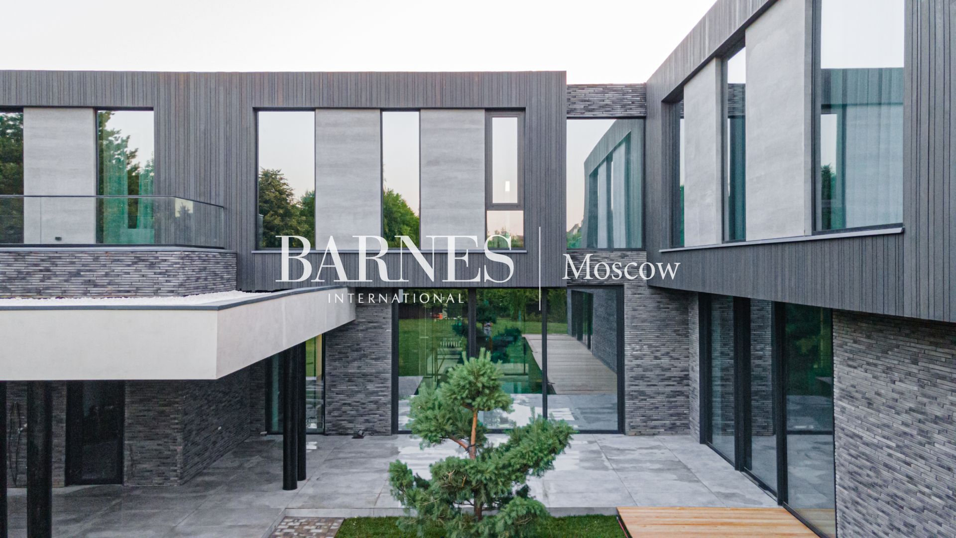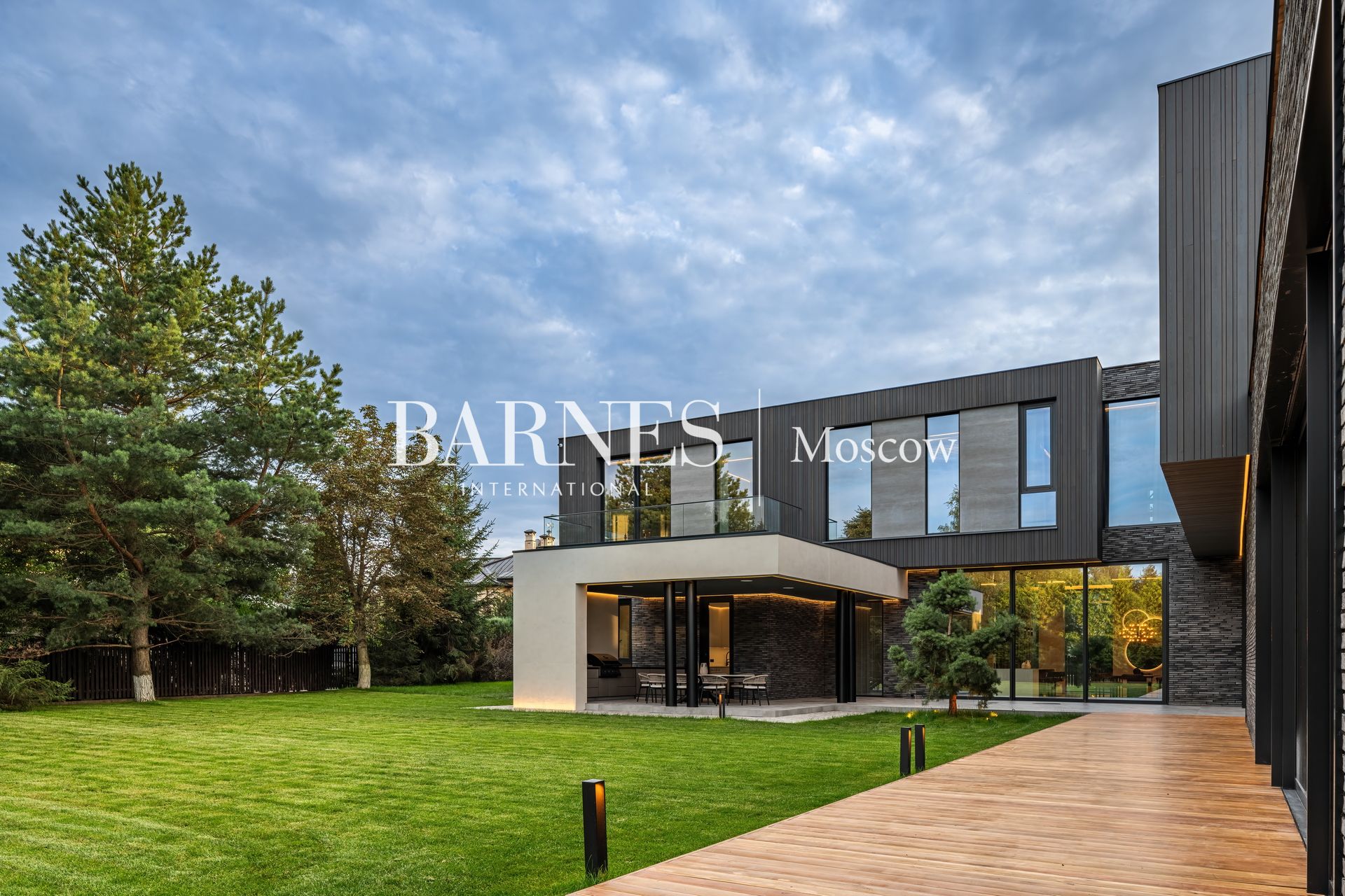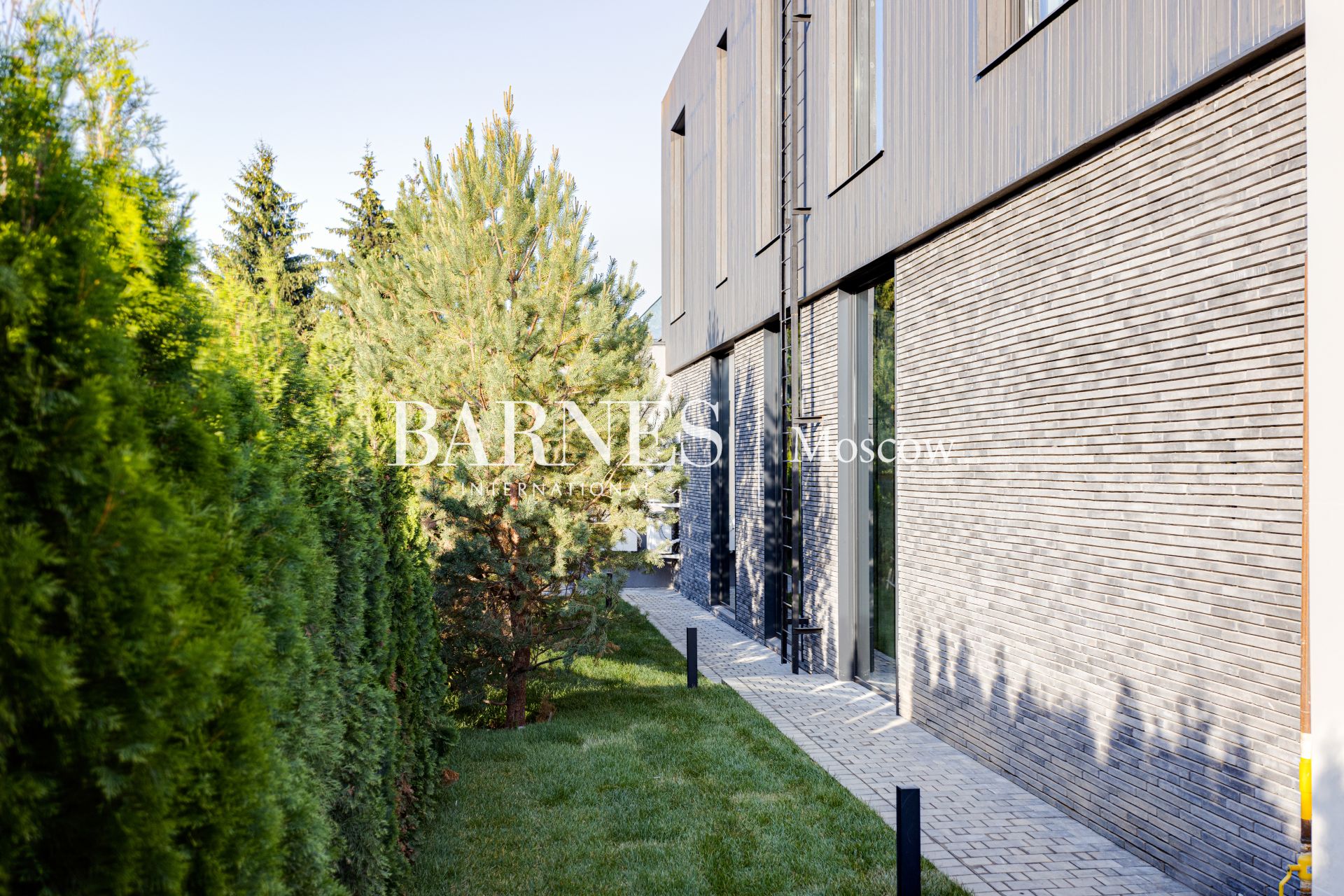 В отделке фасадов применена крупноформатная керамика LAMINAM контрастных цветов и разноширокий термированный планкен. Большие площади остекления визуально связывают внутреннее пространство дома с улицей. Во внутренней отделке дома применяются качественные отделочные материалы - инженерная доска FINEX, керамика LAMINAM, натуральный камень, столярные изделия и панели, двери UNION. Дом оборудован приточно-вытяжной системой с канальным кондиционированием воздуха. В котельной установлены котлы Viessman. Мебель - MINOTTI, POLIFORM, MERIDIANI, Cattelan Italia. Освещение - CENTRSVET, Flos, Vibia. Сантехника - HANSGROHE, Villeroy&Boch, Salini. Бытовая техника - Miele, ASKO.
