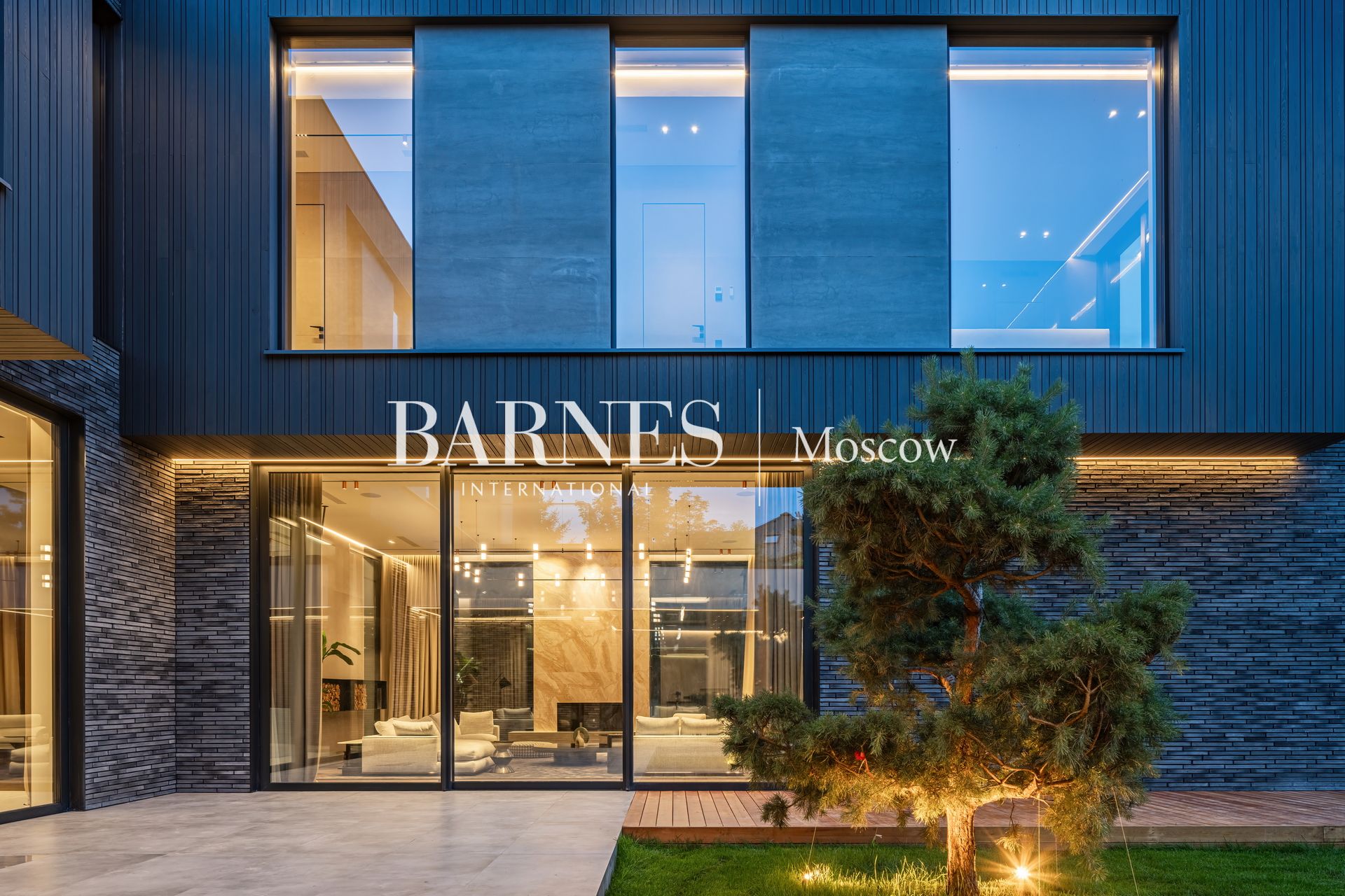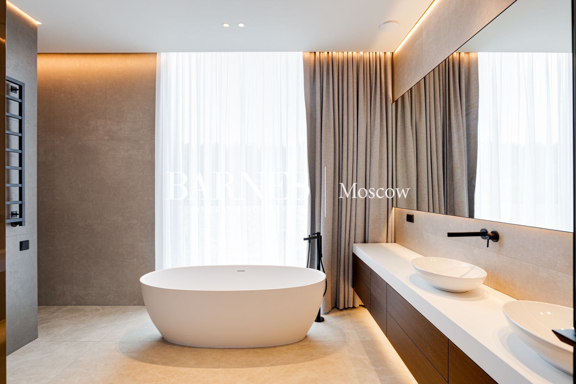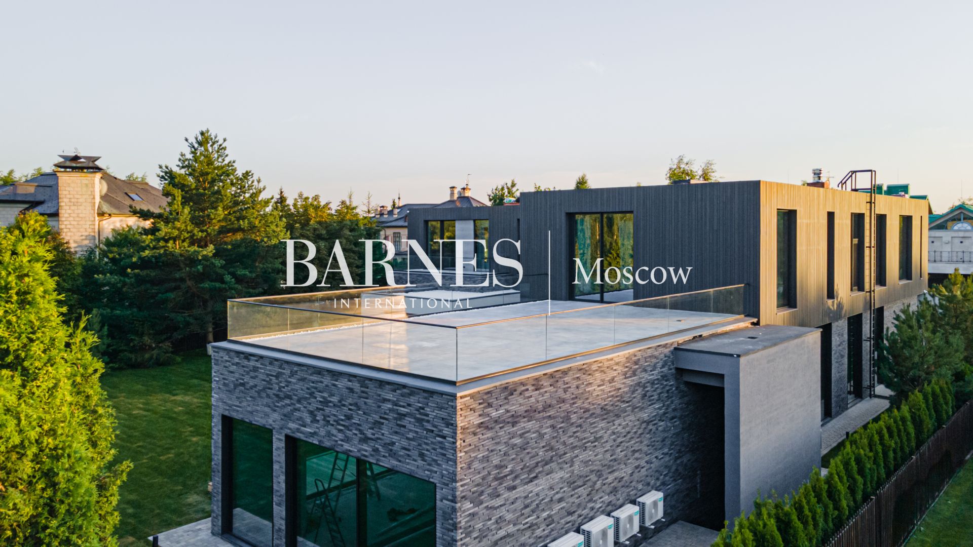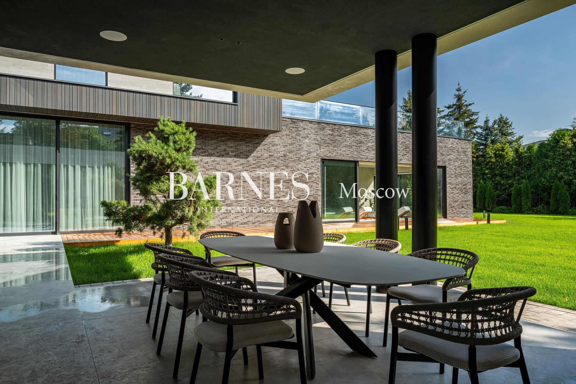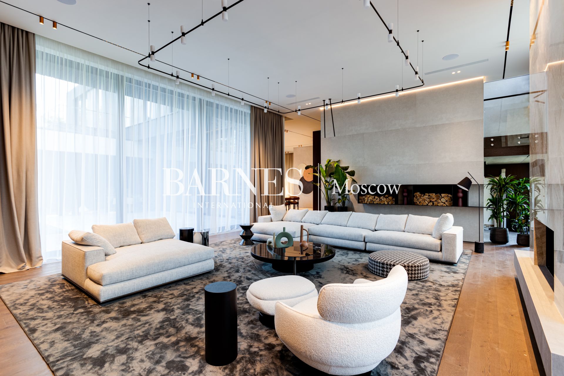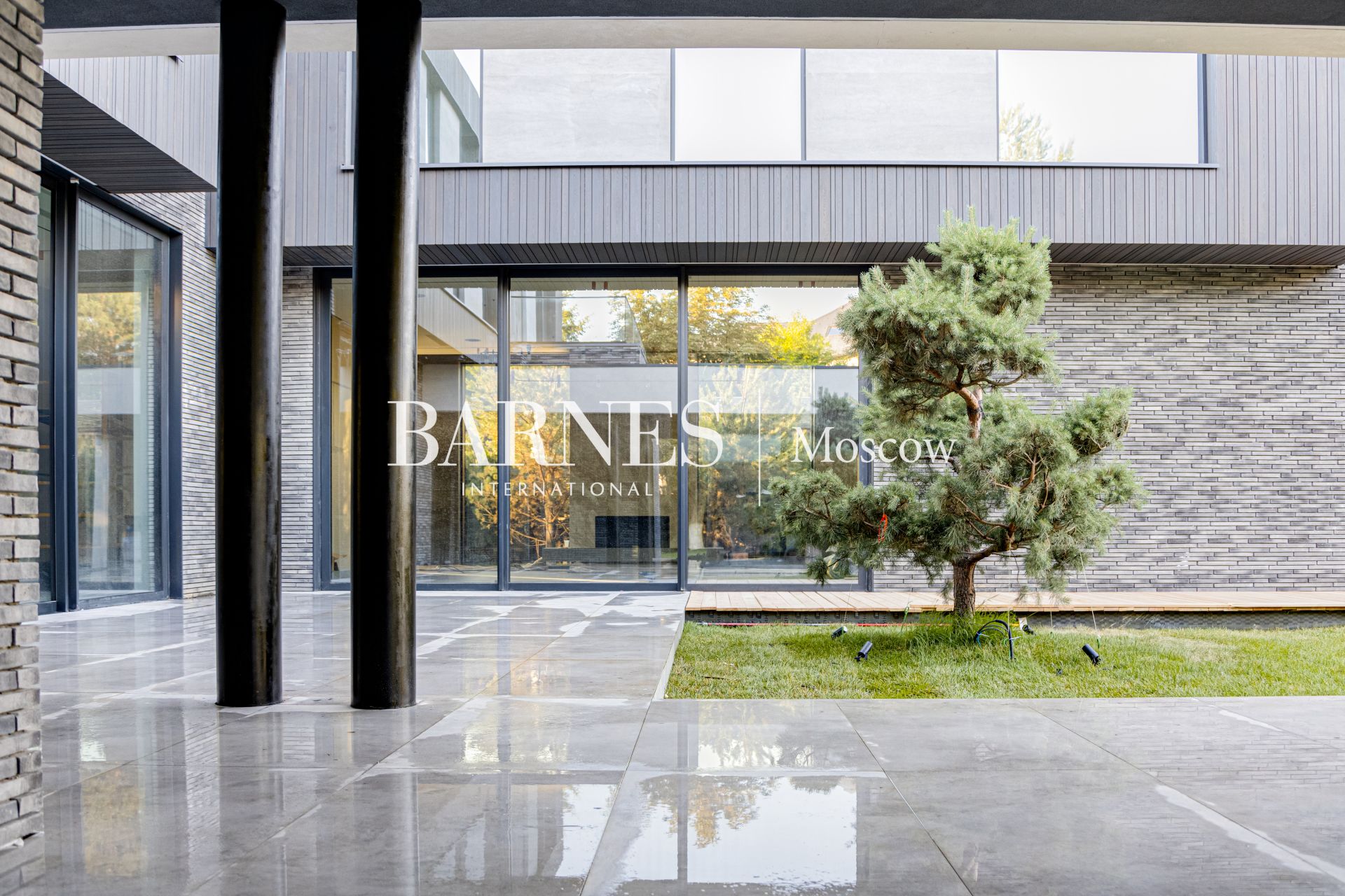 В отделке фасадов применена крупноформатная керамика LAMINAM контрастных цветов и разноширокий термированный планкен. Большие площади остекления визуально связывают внутреннее пространство дома с улицей. Во внутренней отделке дома применяются качественные отделочные материалы - инженерная доска FINEX, керамика LAMINAM, натуральный камень, столярные изделия и панели, двери UNION. Дом оборудован приточно-вытяжной системой с канальным кондиционированием воздуха. В котельной установлены котлы Viessman. Мебель - MINOTTI, POLIFORM, MERIDIANI, Cattelan Italia. Освещение - CENTRSVET, Flos, Vibia. Сантехника - HANSGROHE, Villeroy&Boch, Salini. Бытовая техника - Miele, ASKO.