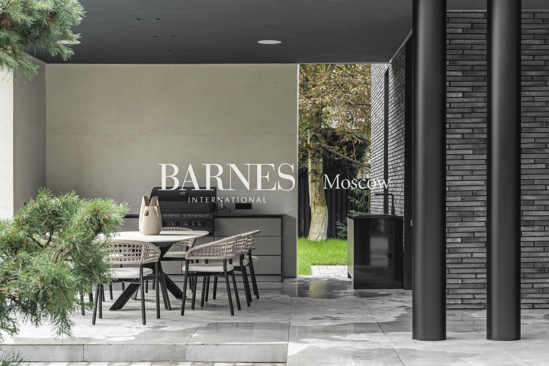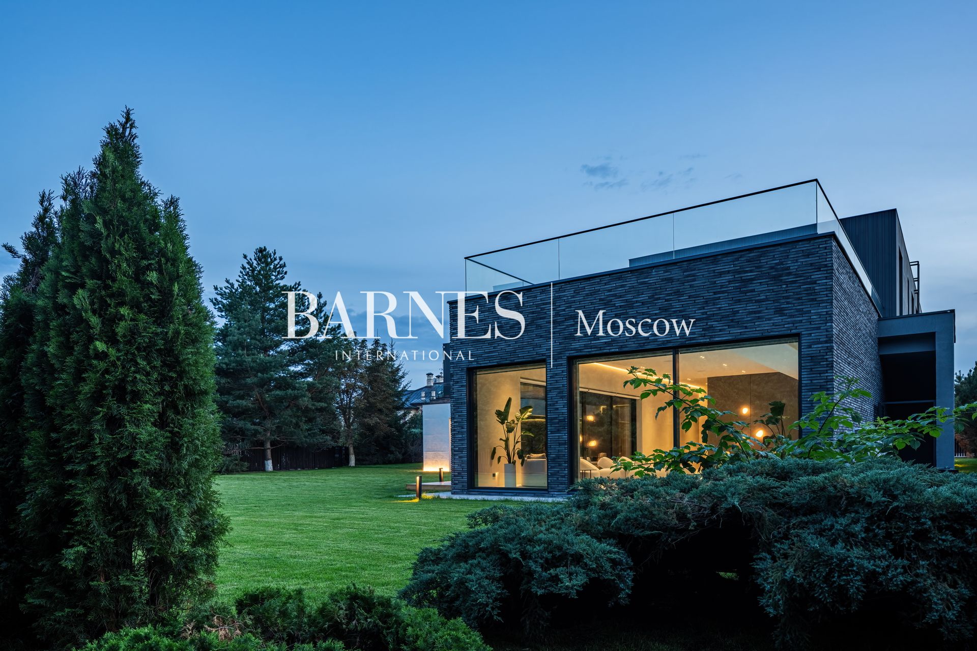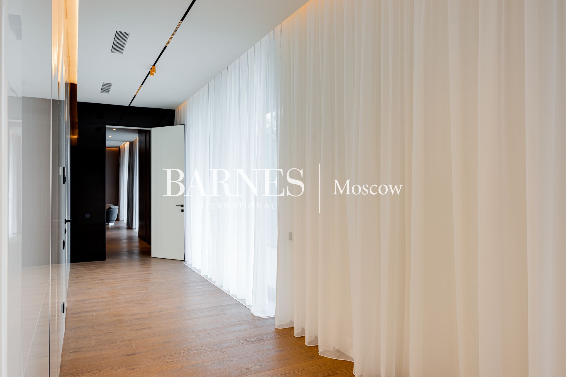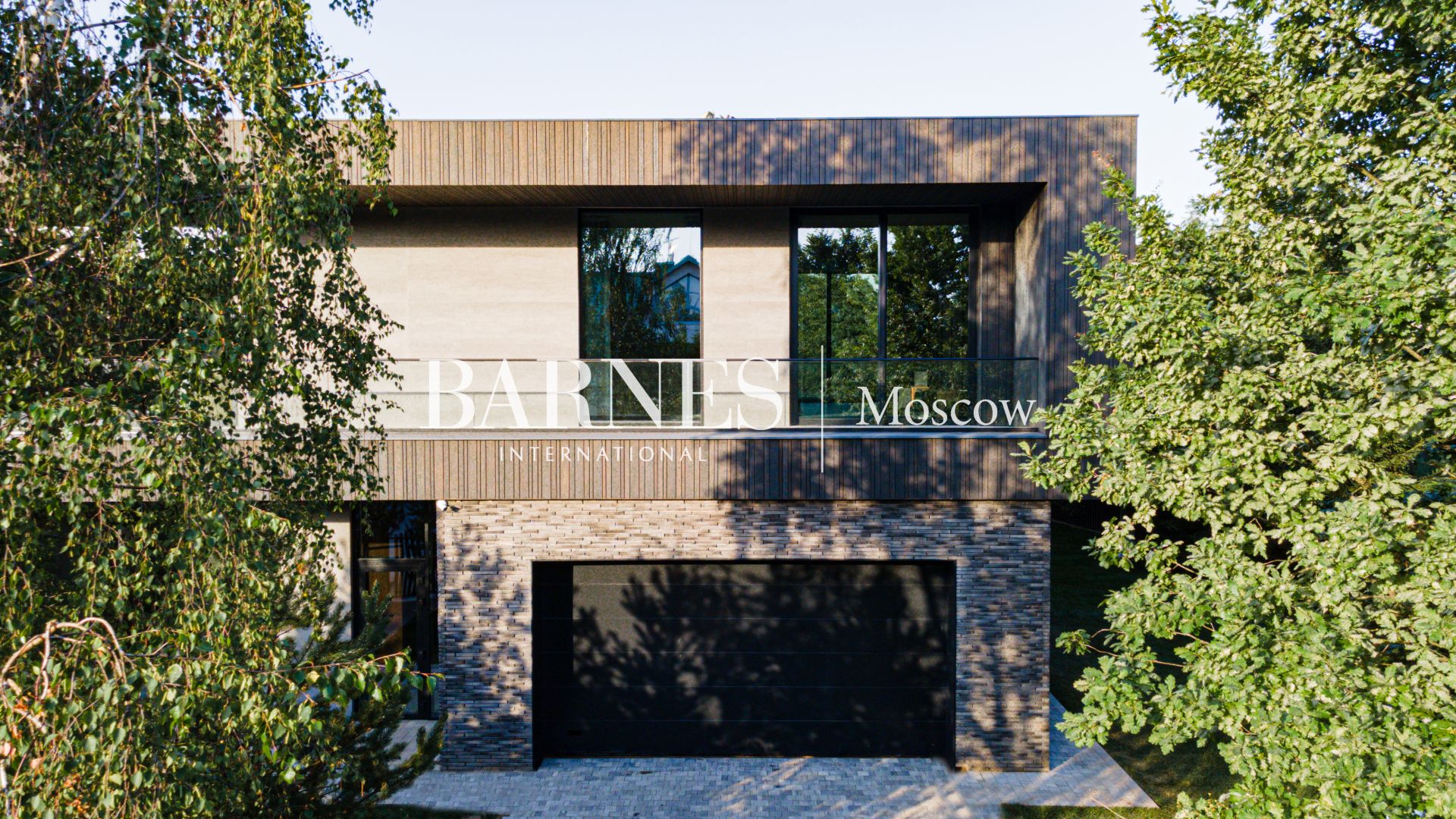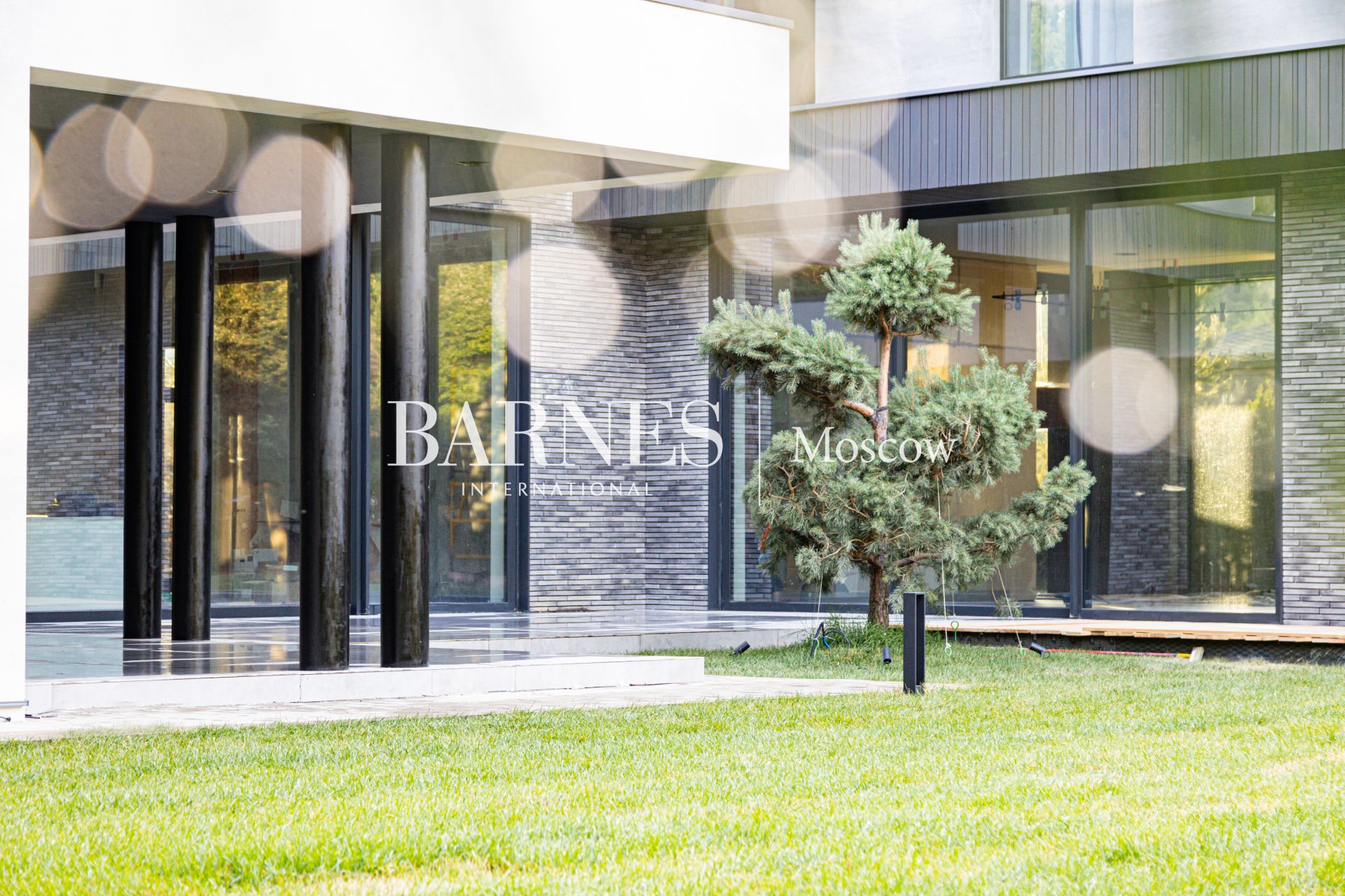 В отделке фасадов применена крупноформатная керамика LAMINAM контрастных цветов и разноширокий термированный планкен. Большие площади остекления визуально связывают внутреннее пространство дома с улицей. Во внутренней отделке дома применяются качественные отделочные материалы - инженерная доска FINEX, керамика LAMINAM, натуральный камень, столярные изделия и панели, двери UNION. Дом оборудован приточно-вытяжной системой с канальным кондиционированием воздуха. В котельной установлены котлы Viessman. Мебель - MINOTTI, POLIFORM, MERIDIANI, Cattelan Italia. Освещение - CENTRSVET, Flos, Vibia. Сантехника - HANSGROHE, Villeroy&Boch, Salini. Бытовая техника - Miele, ASKO.