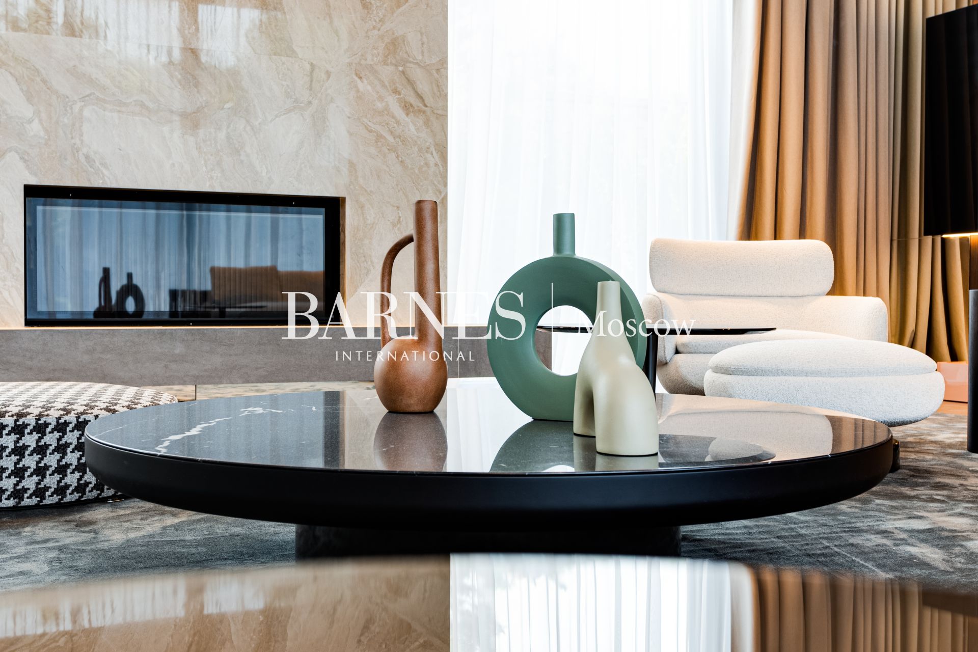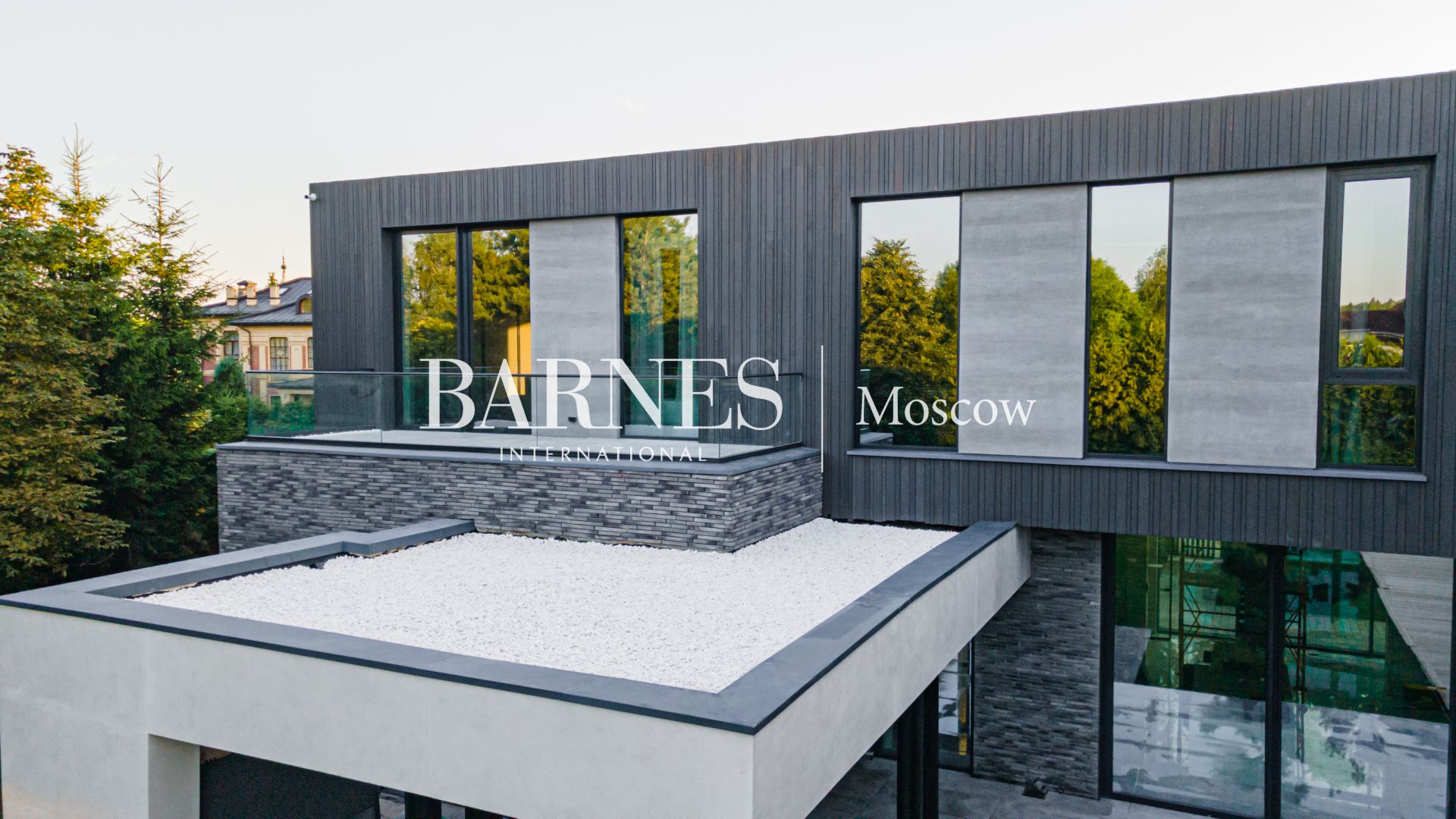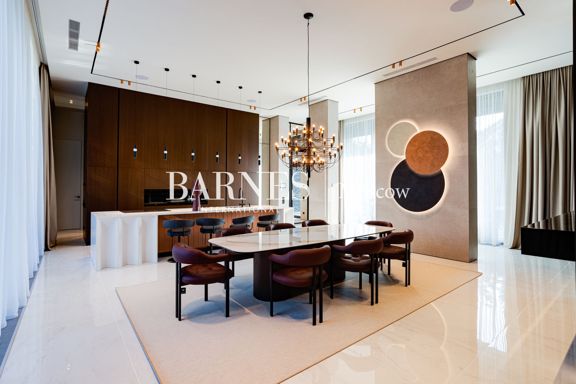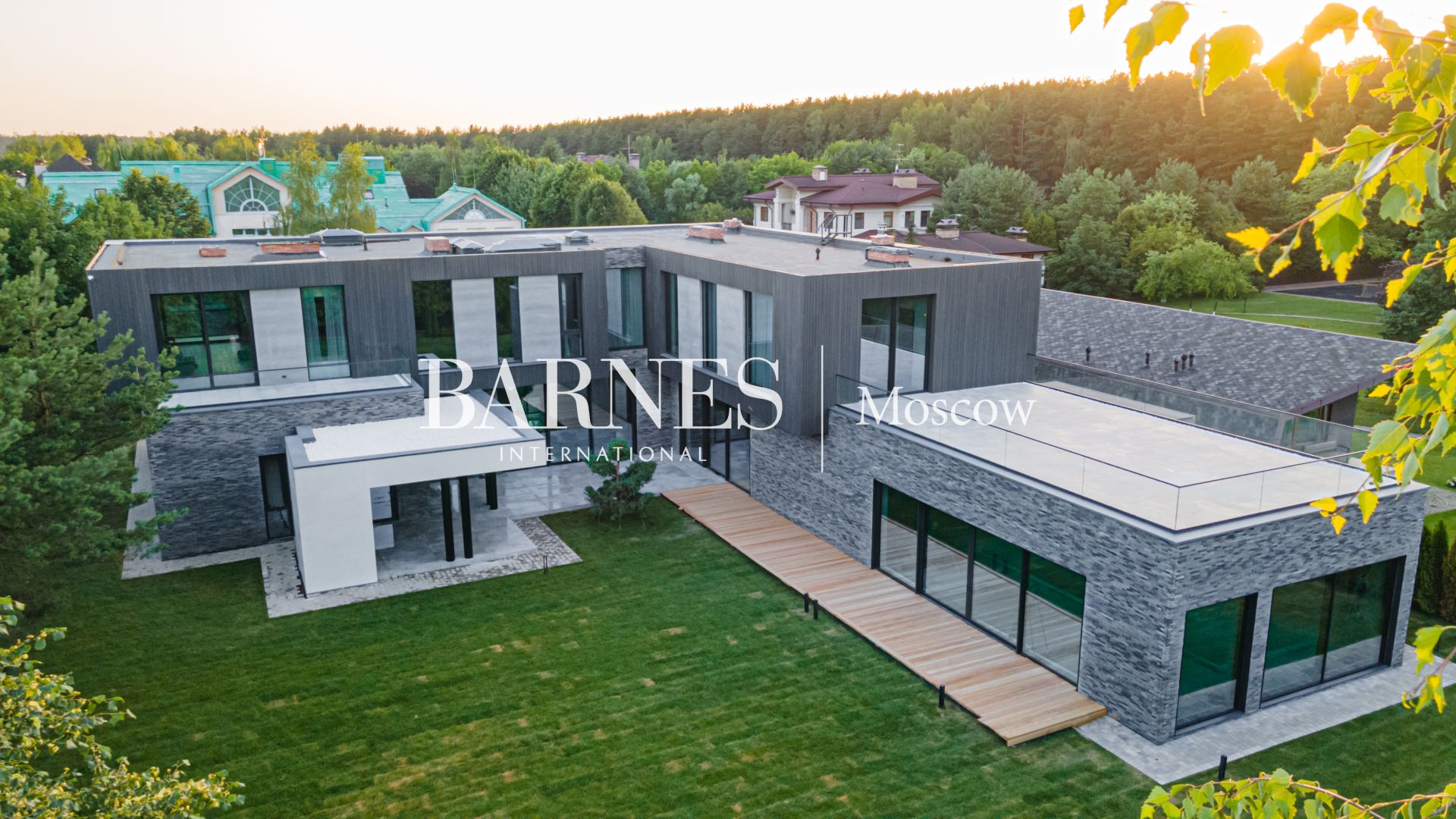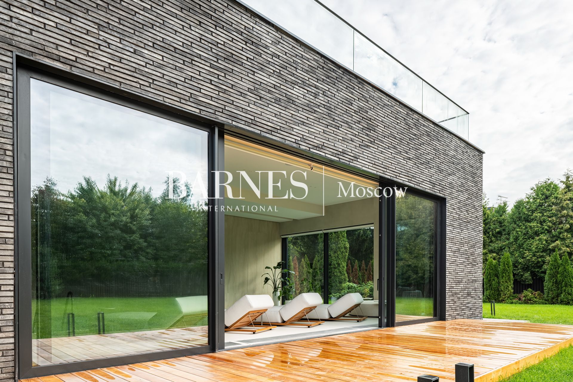 В отделке фасадов применена крупноформатная керамика LAMINAM контрастных цветов и разноширокий термированный планкен. Большие площади остекления визуально связывают внутреннее пространство дома с улицей. Во внутренней отделке дома применяются качественные отделочные материалы - инженерная доска FINEX, керамика LAMINAM, натуральный камень, столярные изделия и панели, двери UNION. Дом оборудован приточно-вытяжной системой с канальным кондиционированием воздуха. В котельной установлены котлы Viessman. Мебель - MINOTTI, POLIFORM, MERIDIANI, Cattelan Italia. Освещение - CENTRSVET, Flos, Vibia. Сантехника - HANSGROHE, Villeroy&Boch, Salini. Бытовая техника - Miele, ASKO.
