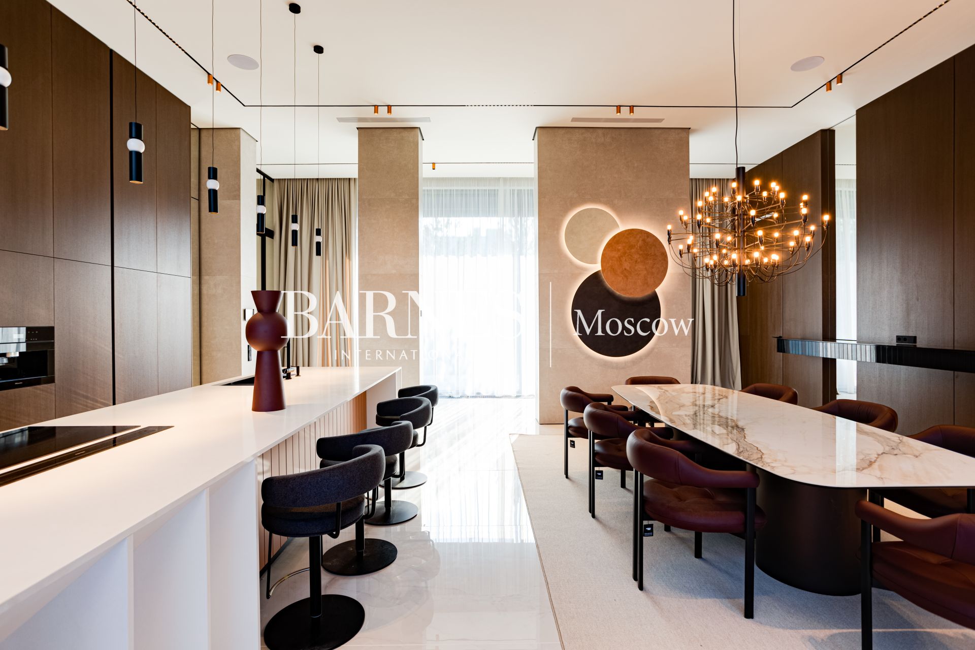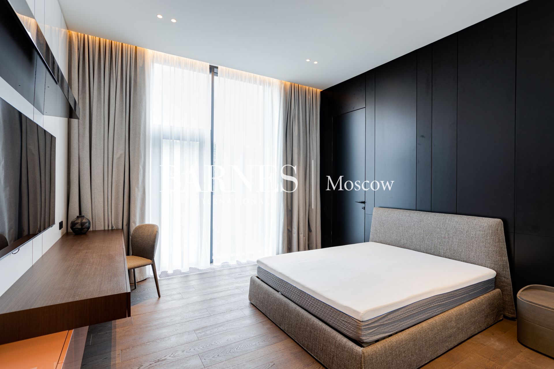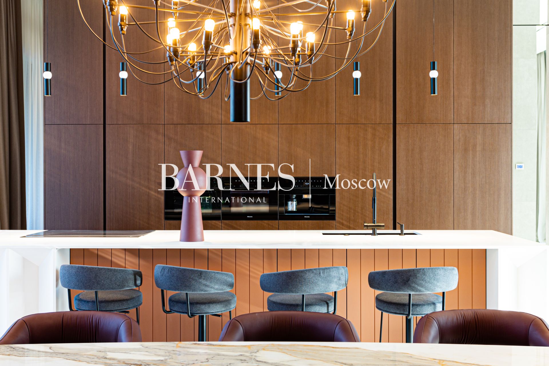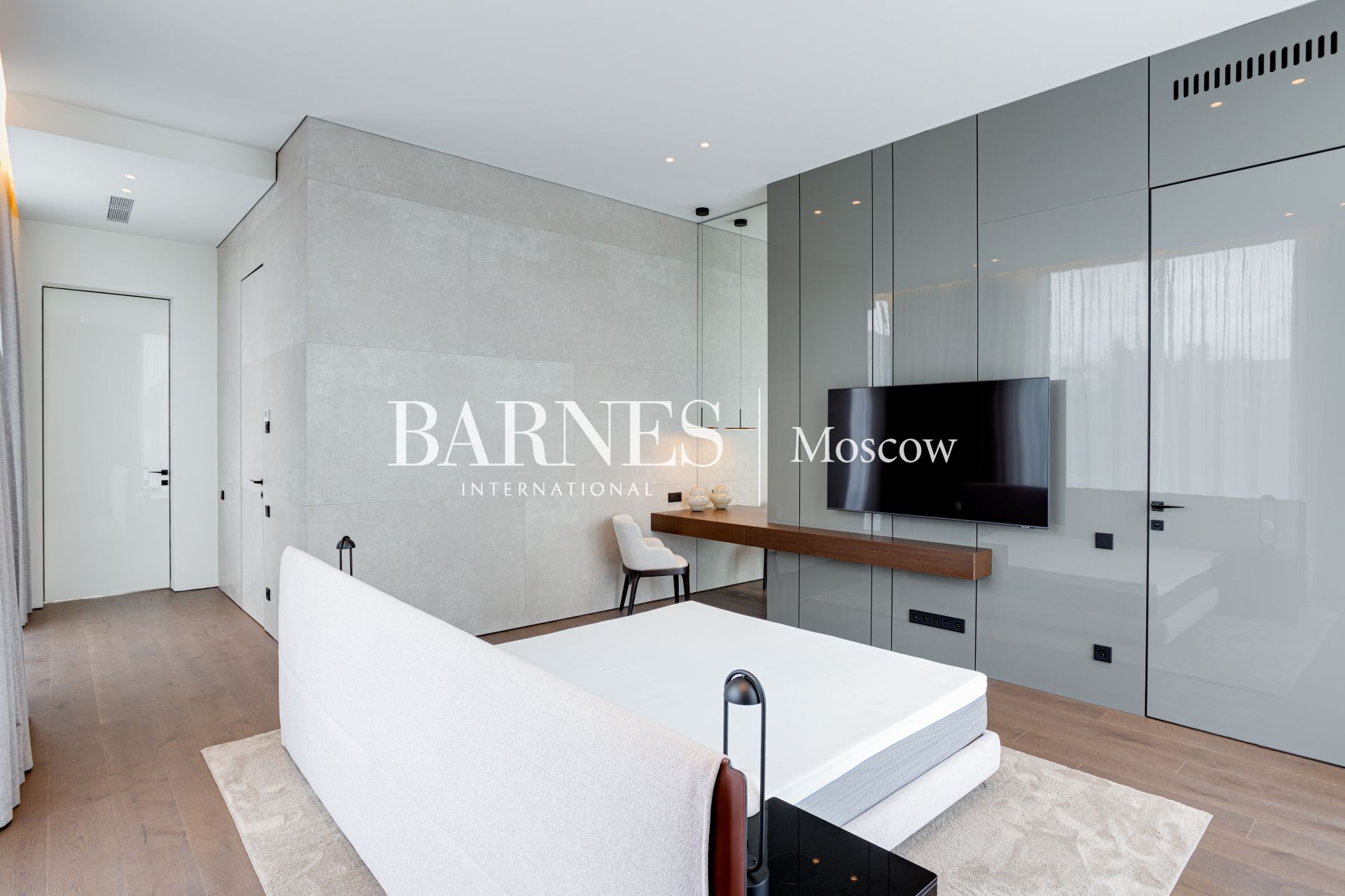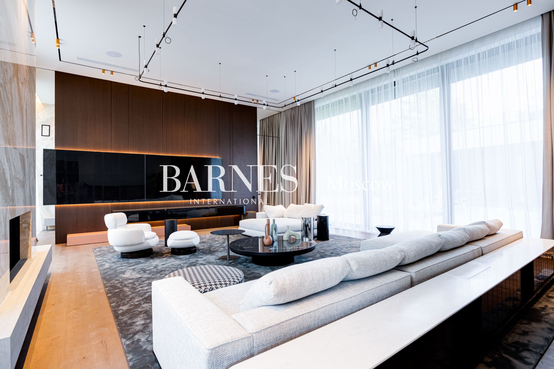 В отделке фасадов применена крупноформатная керамика LAMINAM контрастных цветов и разноширокий термированный планкен. Большие площади остекления визуально связывают внутреннее пространство дома с улицей. Во внутренней отделке дома применяются качественные отделочные материалы - инженерная доска FINEX, керамика LAMINAM, натуральный камень, столярные изделия и панели, двери UNION. Дом оборудован приточно-вытяжной системой с канальным кондиционированием воздуха. В котельной установлены котлы Viessman. Мебель - MINOTTI, POLIFORM, MERIDIANI, Cattelan Italia. Освещение - CENTRSVET, Flos, Vibia. Сантехника - HANSGROHE, Villeroy&Boch, Salini. Бытовая техника - Miele, ASKO.