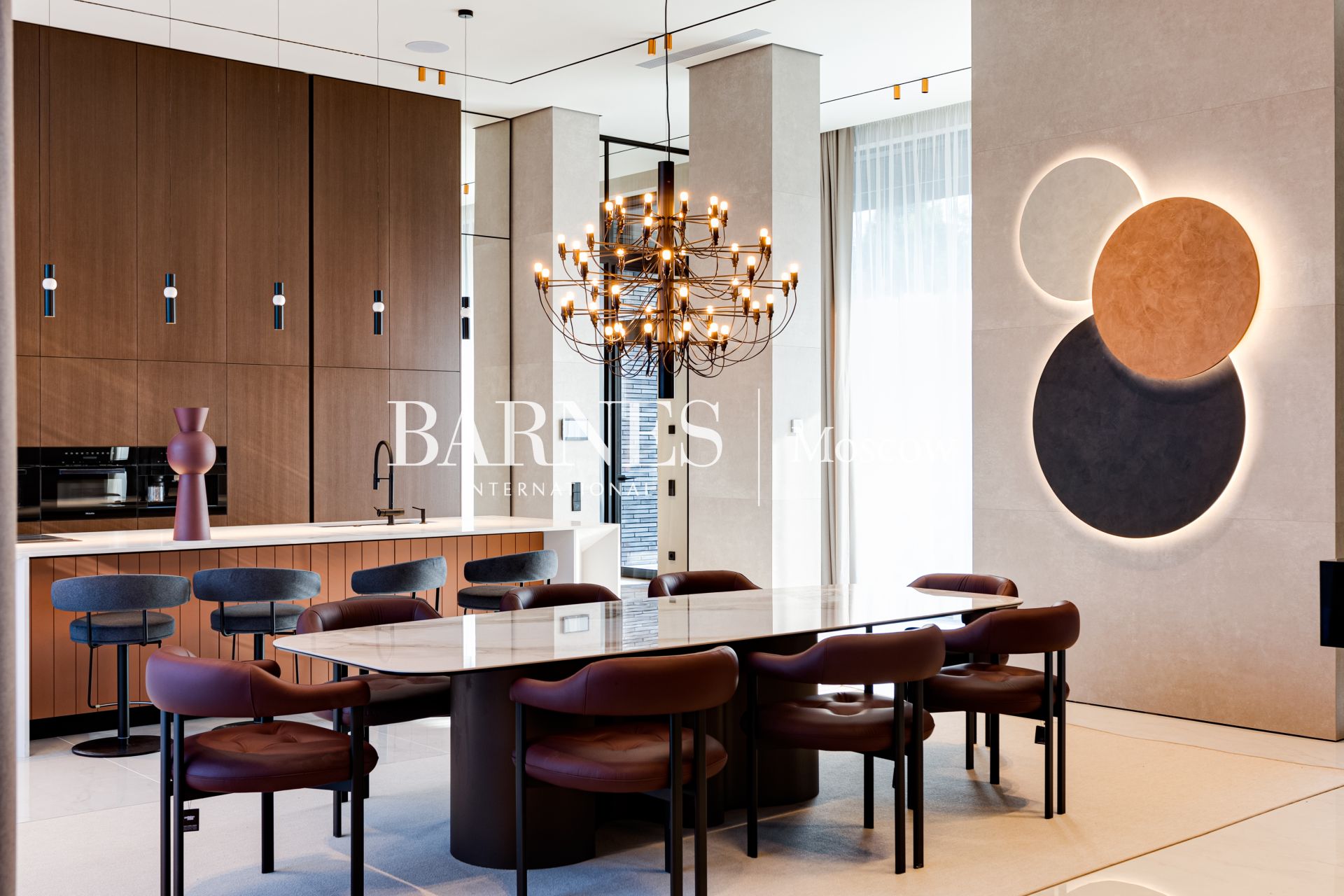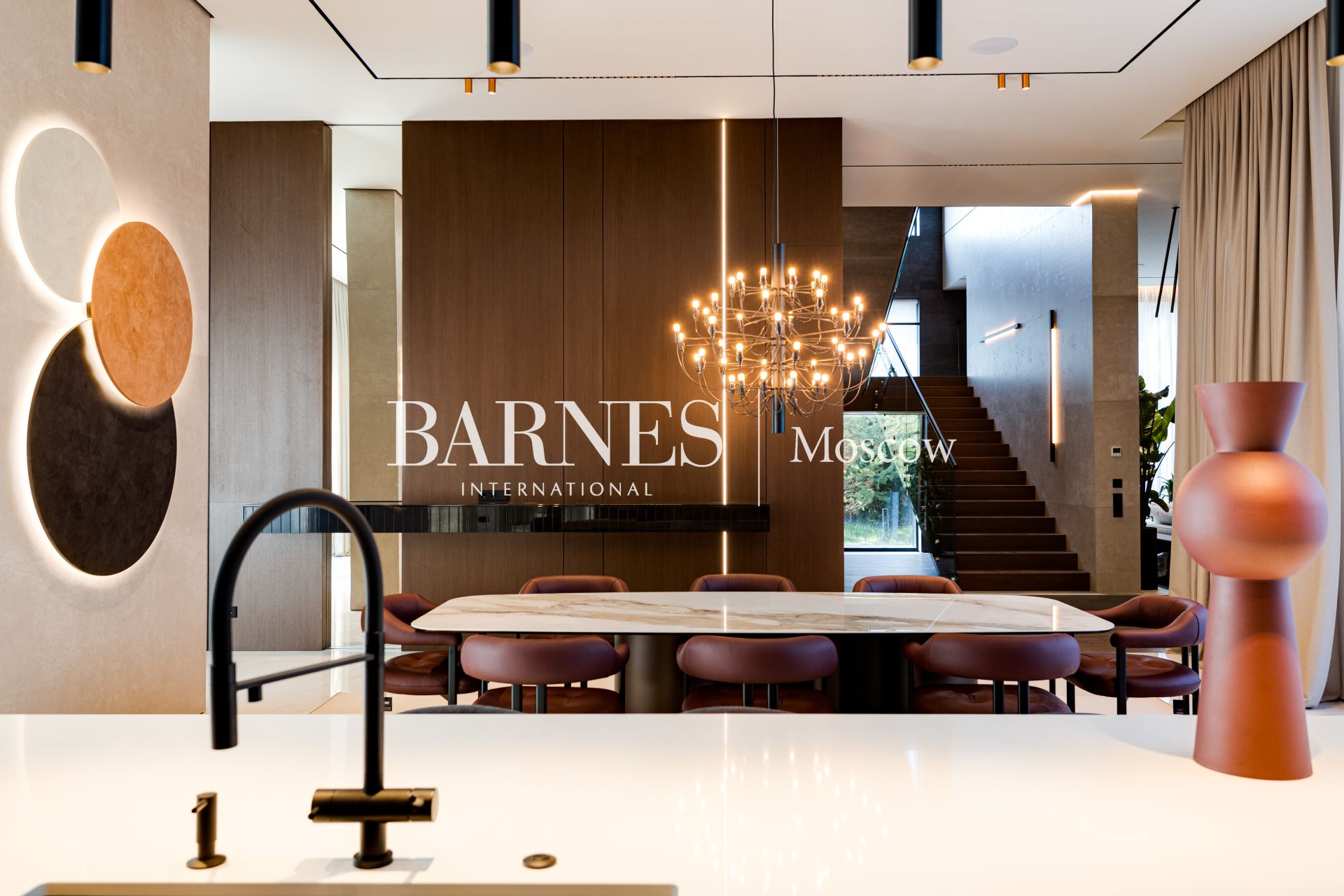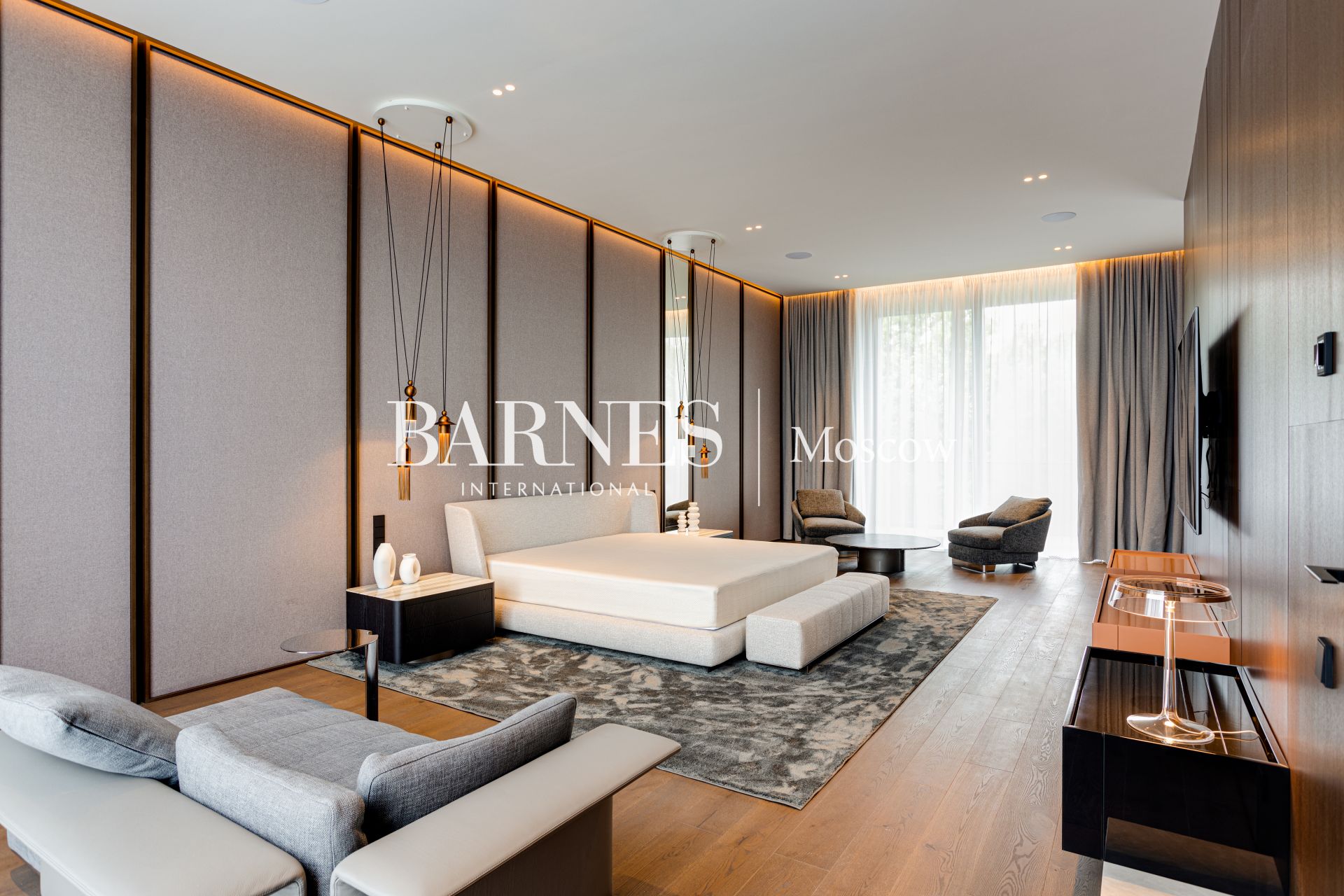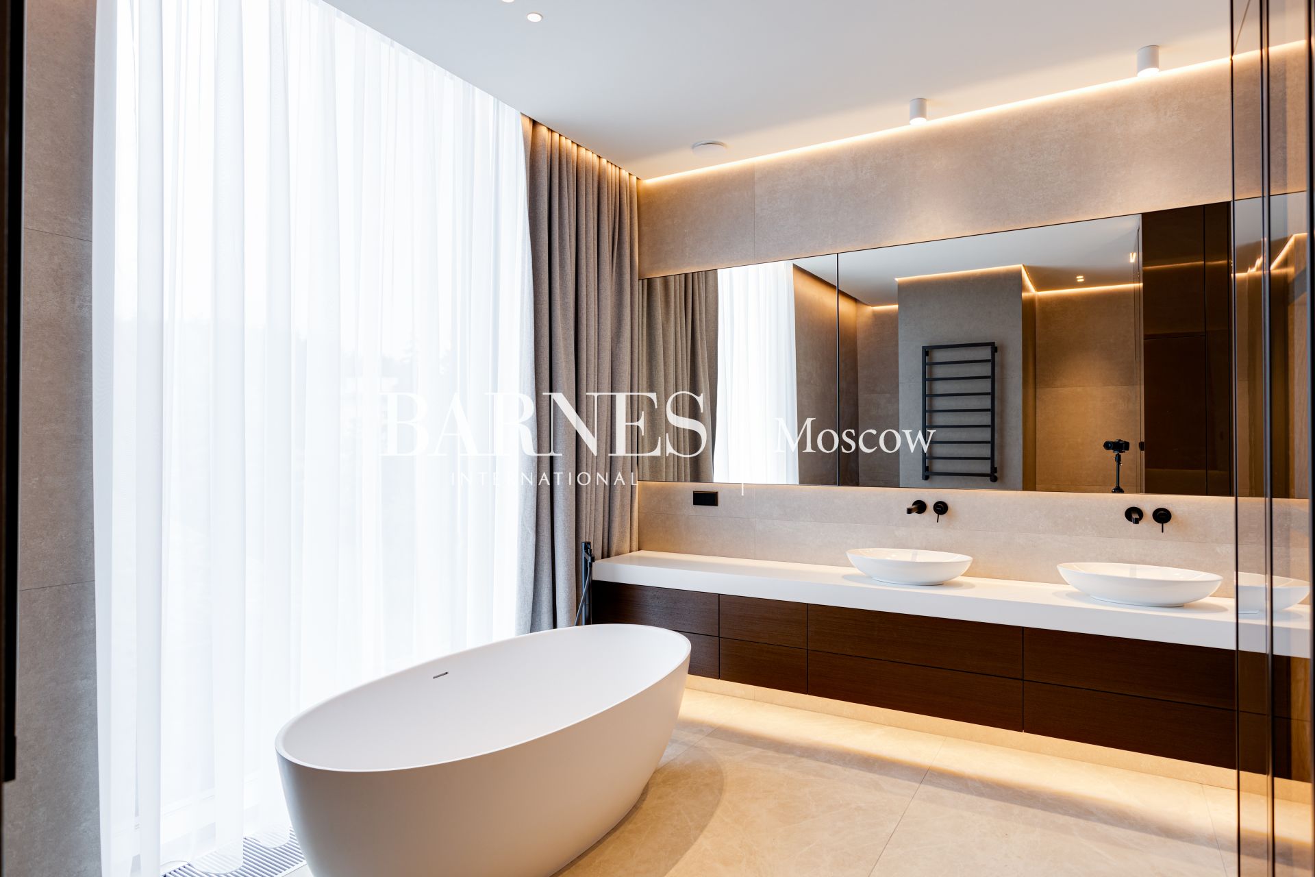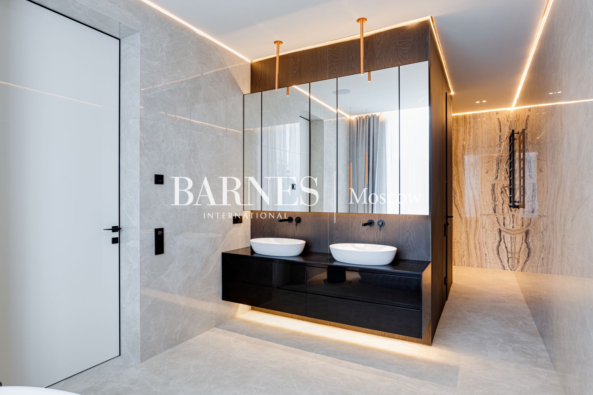 В отделке фасадов применена крупноформатная керамика LAMINAM контрастных цветов и разноширокий термированный планкен. Большие площади остекления визуально связывают внутреннее пространство дома с улицей. Во внутренней отделке дома применяются качественные отделочные материалы - инженерная доска FINEX, керамика LAMINAM, натуральный камень, столярные изделия и панели, двери UNION. Дом оборудован приточно-вытяжной системой с канальным кондиционированием воздуха. В котельной установлены котлы Viessman. Мебель - MINOTTI, POLIFORM, MERIDIANI, Cattelan Italia. Освещение - CENTRSVET, Flos, Vibia. Сантехника - HANSGROHE, Villeroy&Boch, Salini. Бытовая техника - Miele, ASKO.