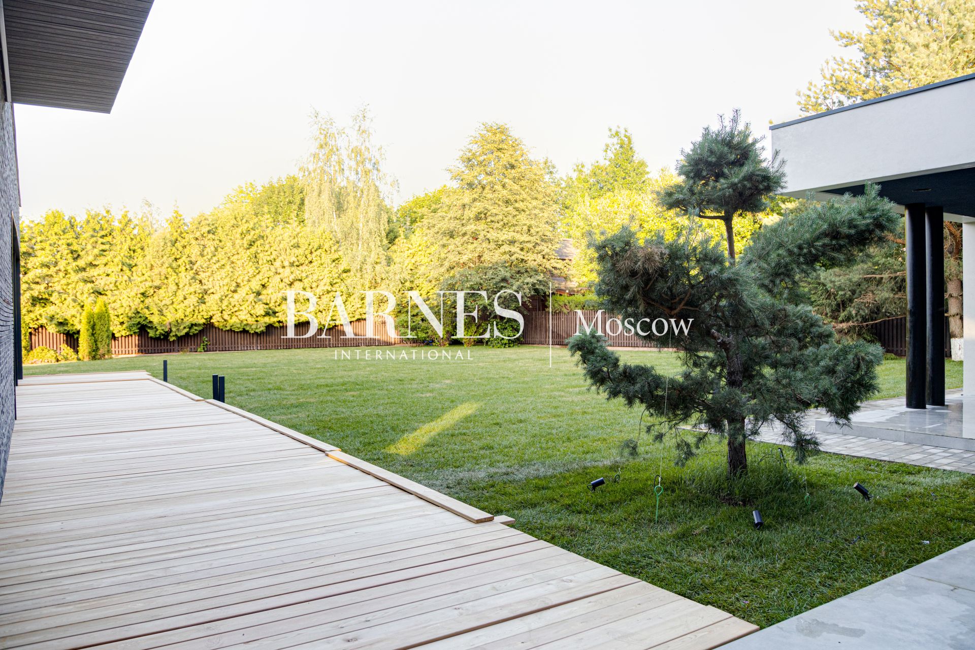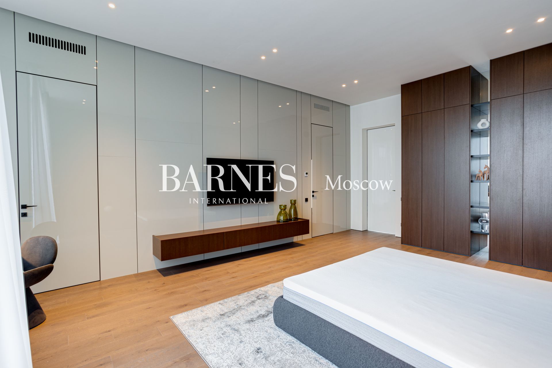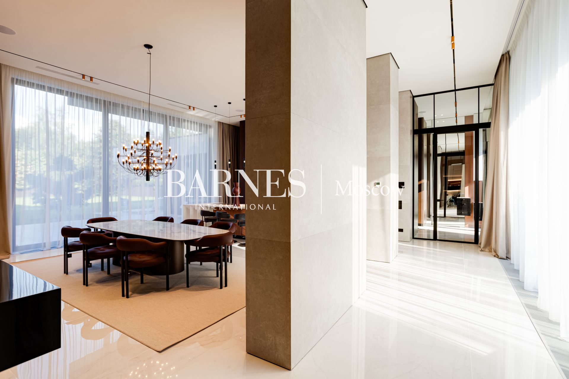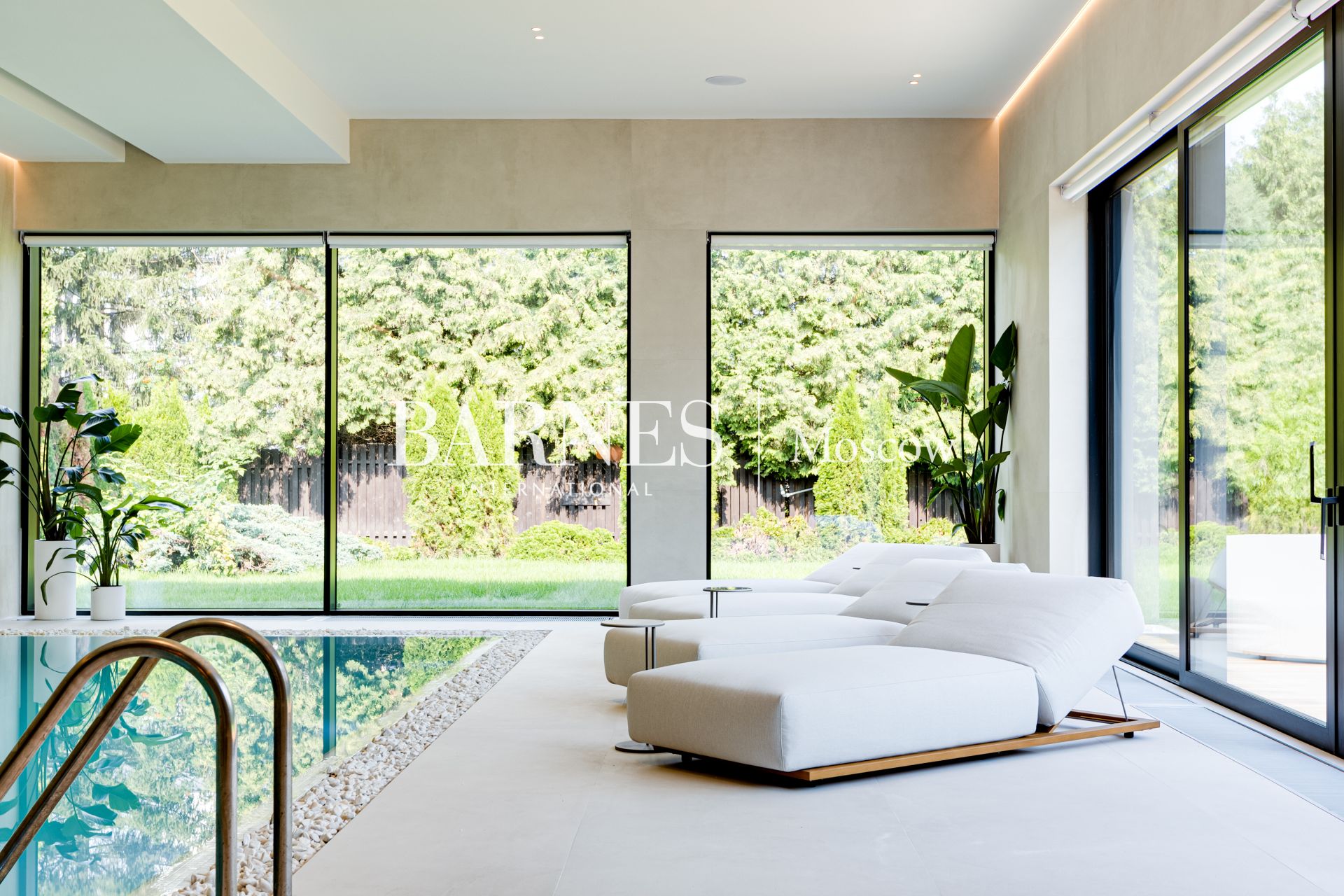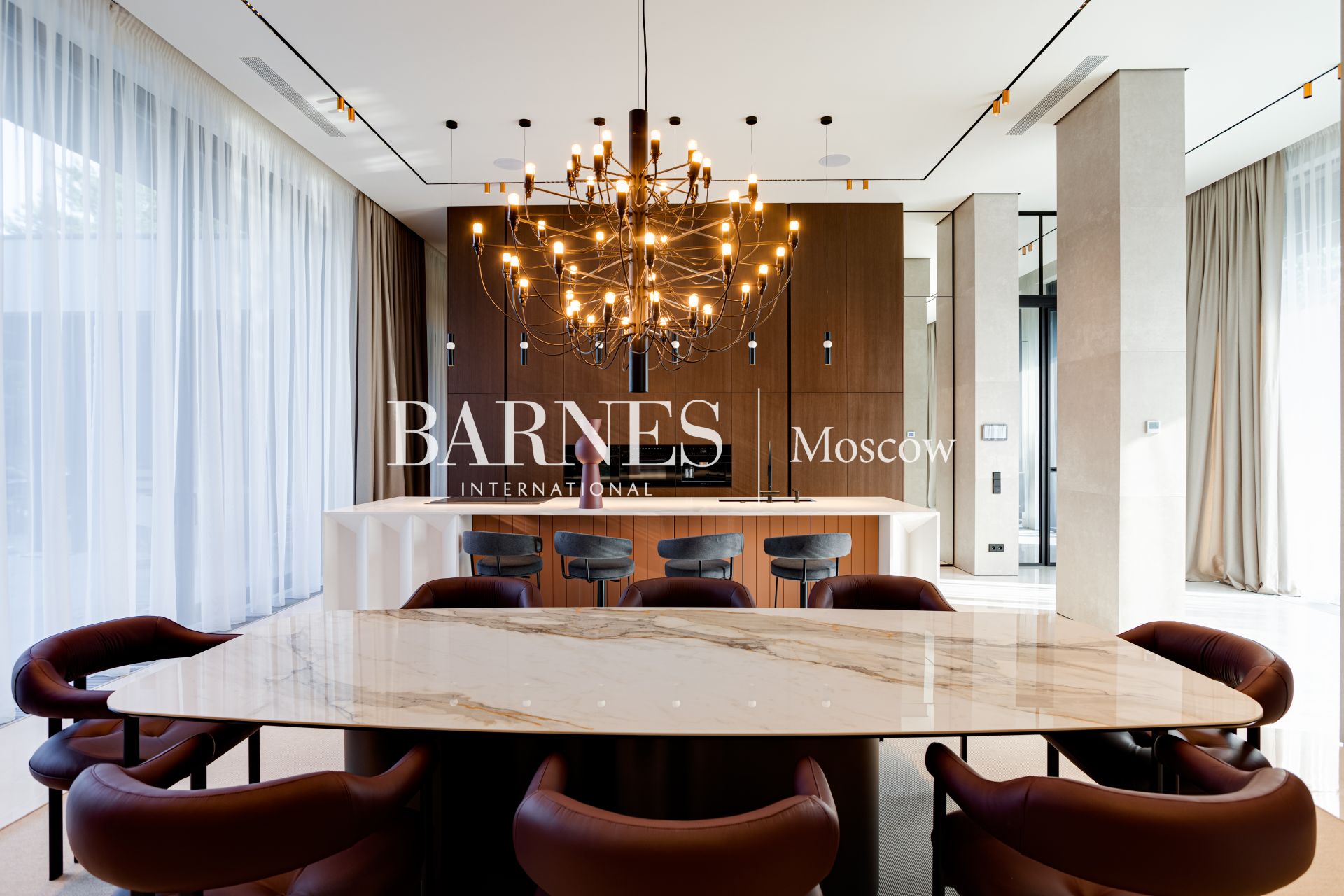 В отделке фасадов применена крупноформатная керамика LAMINAM контрастных цветов и разноширокий термированный планкен. Большие площади остекления визуально связывают внутреннее пространство дома с улицей. Во внутренней отделке дома применяются качественные отделочные материалы - инженерная доска FINEX, керамика LAMINAM, натуральный камень, столярные изделия и панели, двери UNION. Дом оборудован приточно-вытяжной системой с канальным кондиционированием воздуха. В котельной установлены котлы Viessman. Мебель - MINOTTI, POLIFORM, MERIDIANI, Cattelan Italia. Освещение - CENTRSVET, Flos, Vibia. Сантехника - HANSGROHE, Villeroy&Boch, Salini. Бытовая техника - Miele, ASKO.