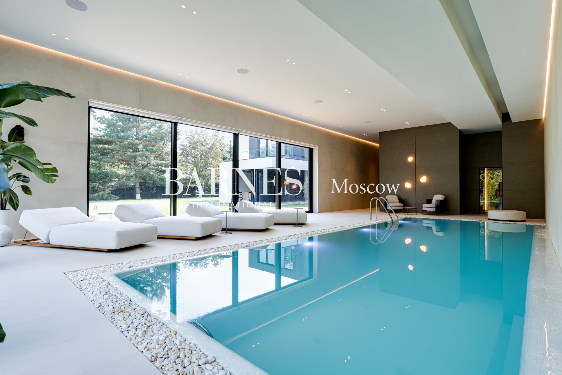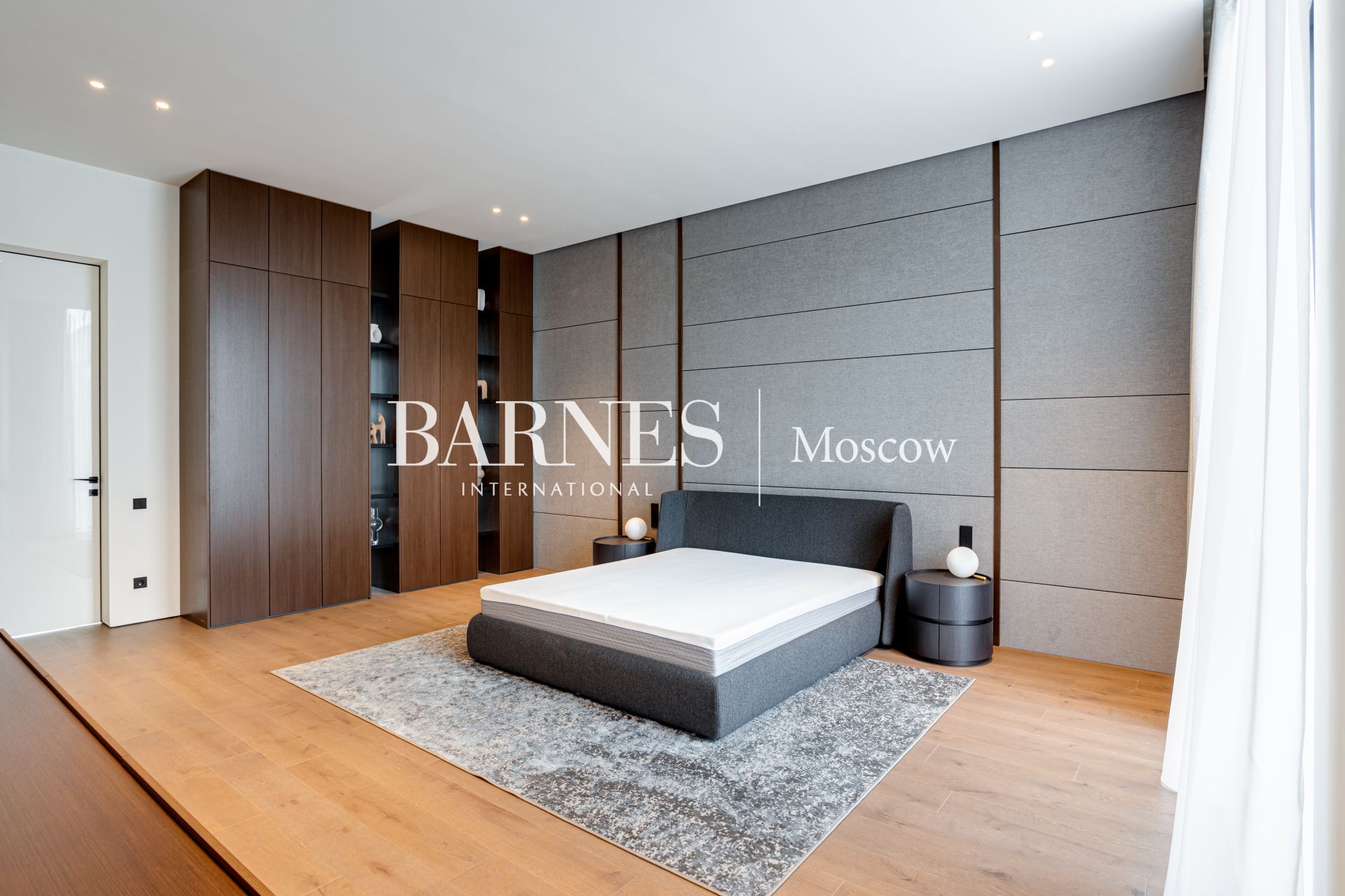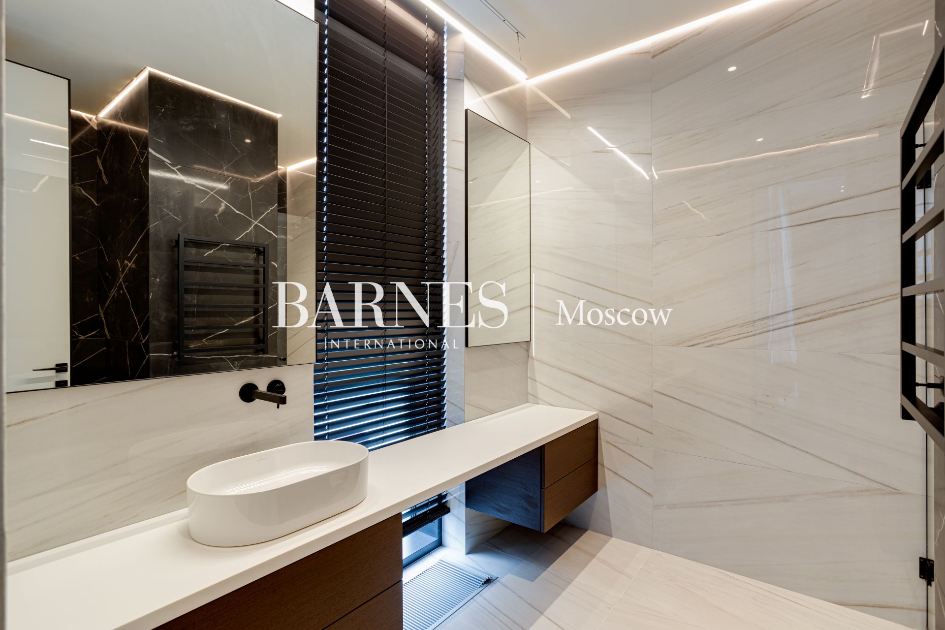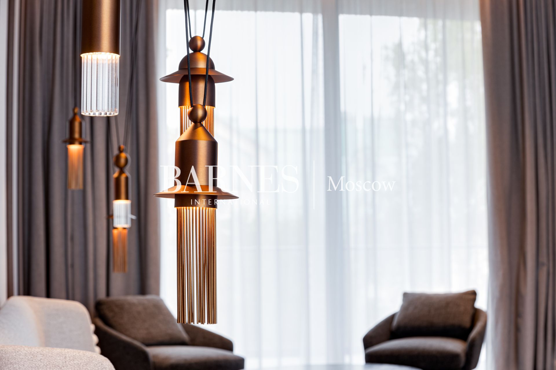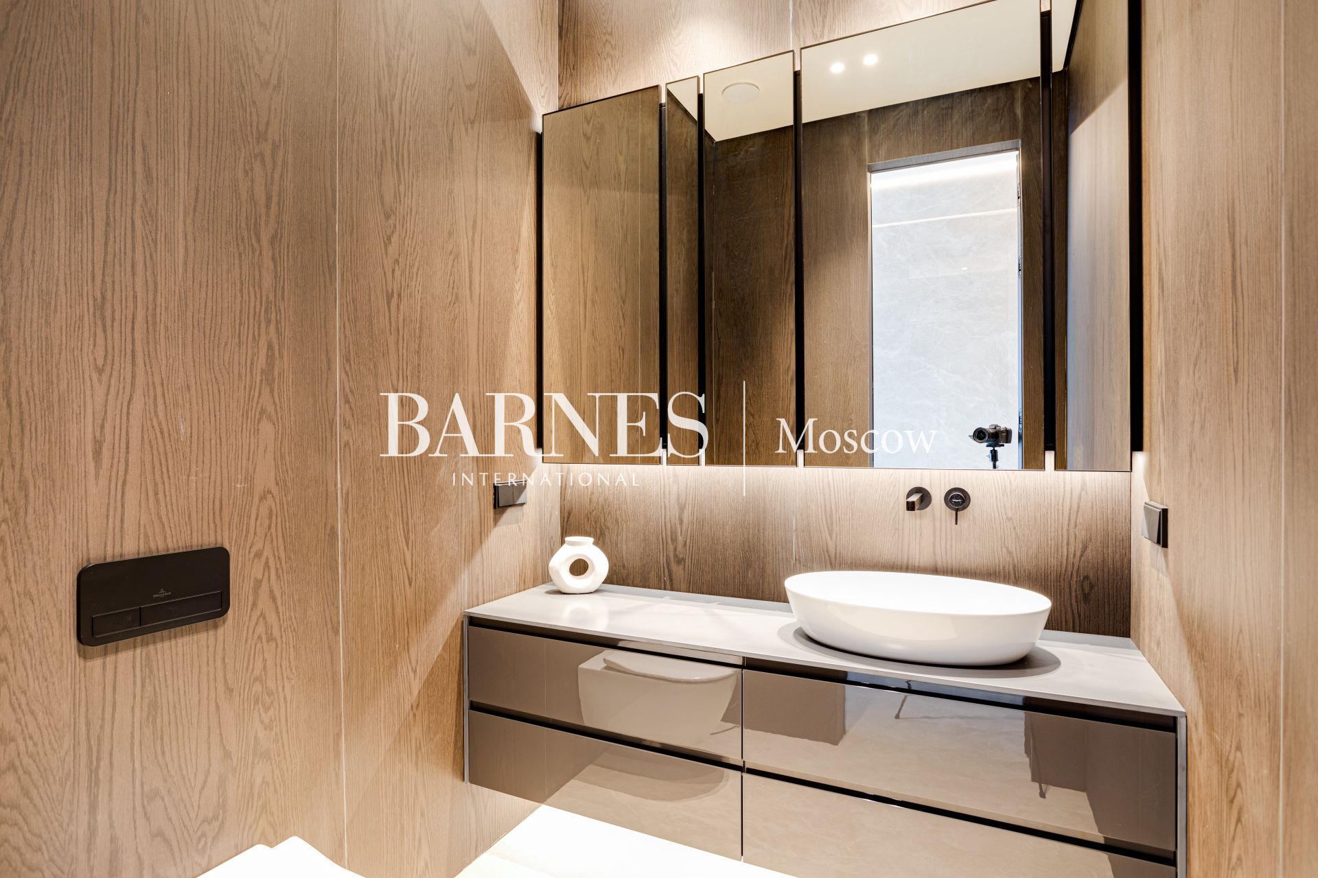В отделке фасадов применена крупноформатная керамика LAMINAM контрастных цветов и разноширокий термированный планкен. Большие площади остекления визуально связывают внутреннее пространство дома с улицей. Во внутренней отделке дома применяются качественные отделочные материалы - инженерная доска FINEX, керамика LAMINAM, натуральный камень, столярные изделия и панели, двери UNION. Дом оборудован приточно-вытяжной системой с канальным кондиционированием воздуха. В котельной установлены котлы Viessman. Мебель - MINOTTI, POLIFORM, MERIDIANI, Cattelan Italia. Освещение - CENTRSVET, Flos, Vibia. Сантехника - HANSGROHE, Villeroy&Boch, Salini. Бытовая техника - Miele, ASKO.