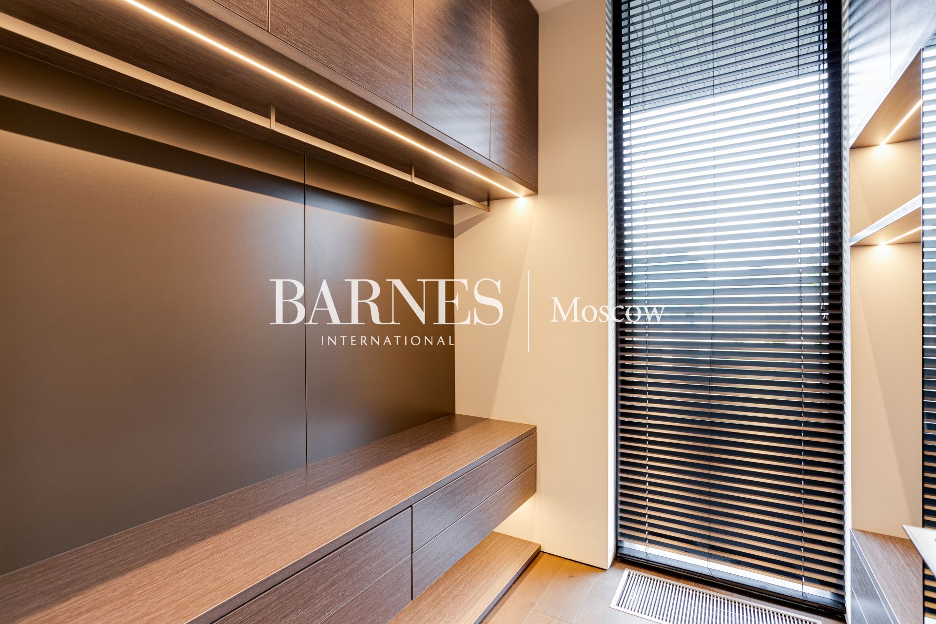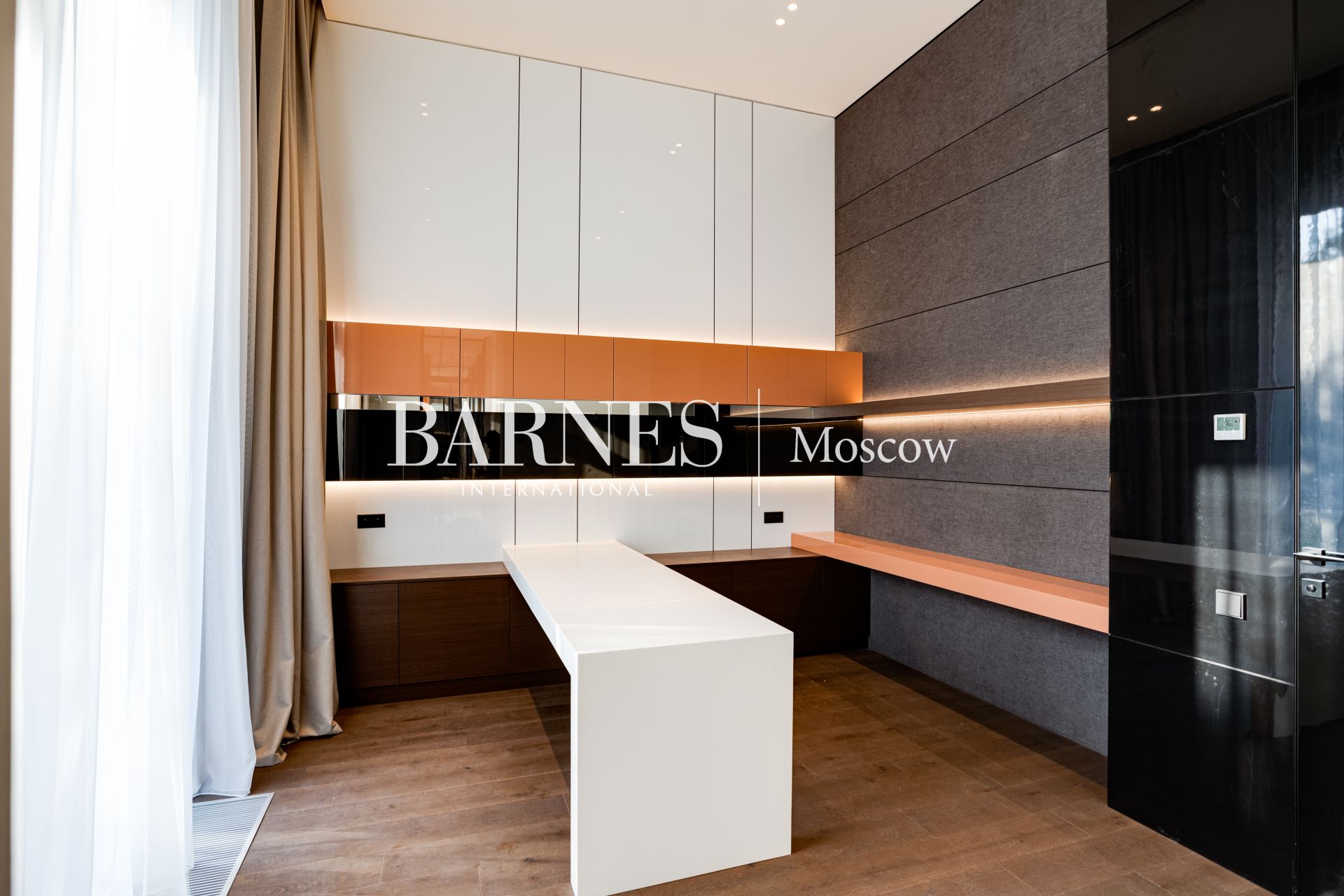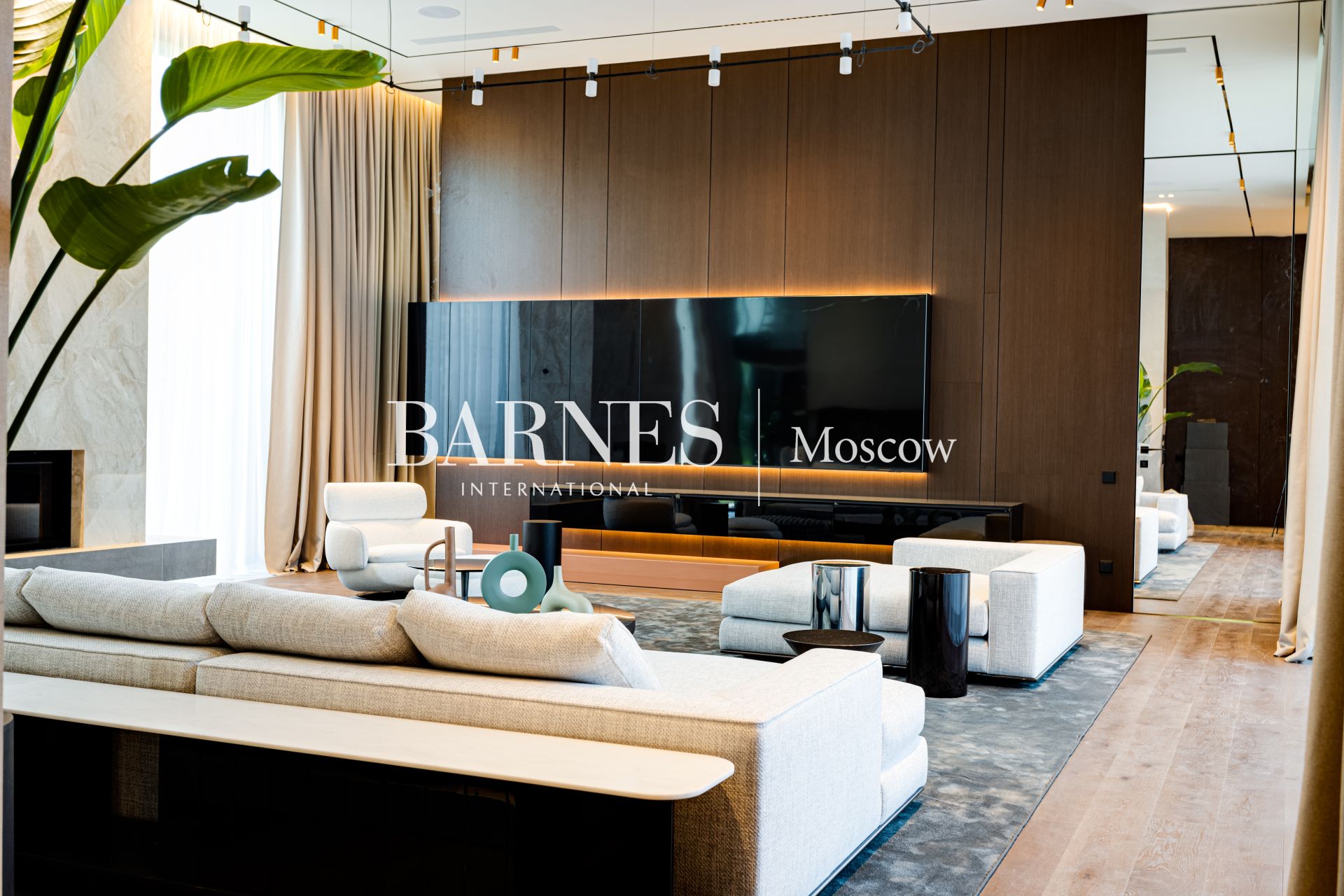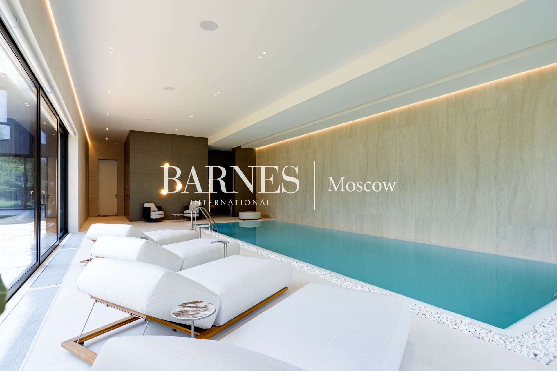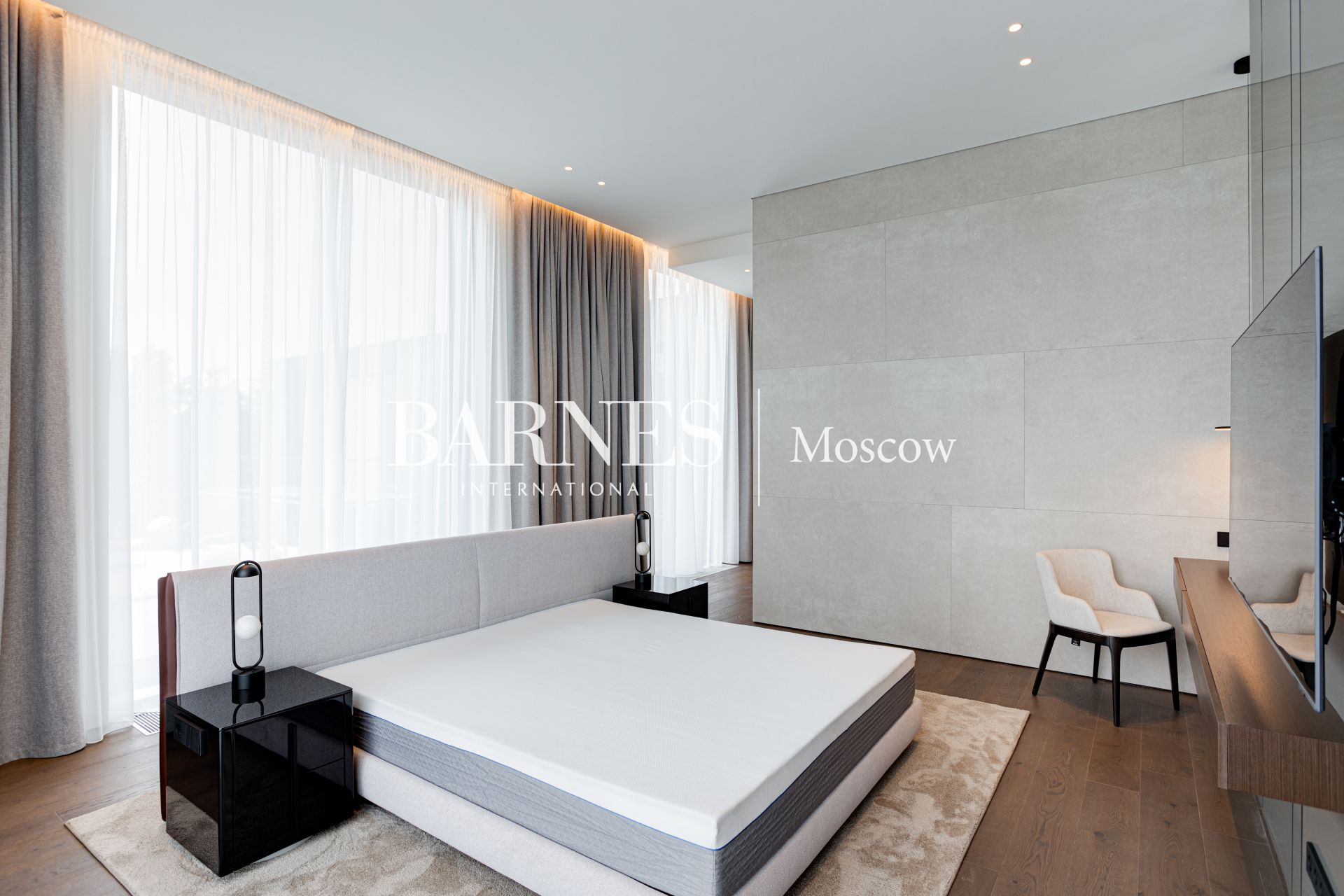 В отделке фасадов применена крупноформатная керамика LAMINAM контрастных цветов и разноширокий термированный планкен. Большие площади остекления визуально связывают внутреннее пространство дома с улицей. Во внутренней отделке дома применяются качественные отделочные материалы - инженерная доска FINEX, керамика LAMINAM, натуральный камень, столярные изделия и панели, двери UNION. Дом оборудован приточно-вытяжной системой с канальным кондиционированием воздуха. В котельной установлены котлы Viessman. Мебель - MINOTTI, POLIFORM, MERIDIANI, Cattelan Italia. Освещение - CENTRSVET, Flos, Vibia. Сантехника - HANSGROHE, Villeroy&Boch, Salini. Бытовая техника - Miele, ASKO.