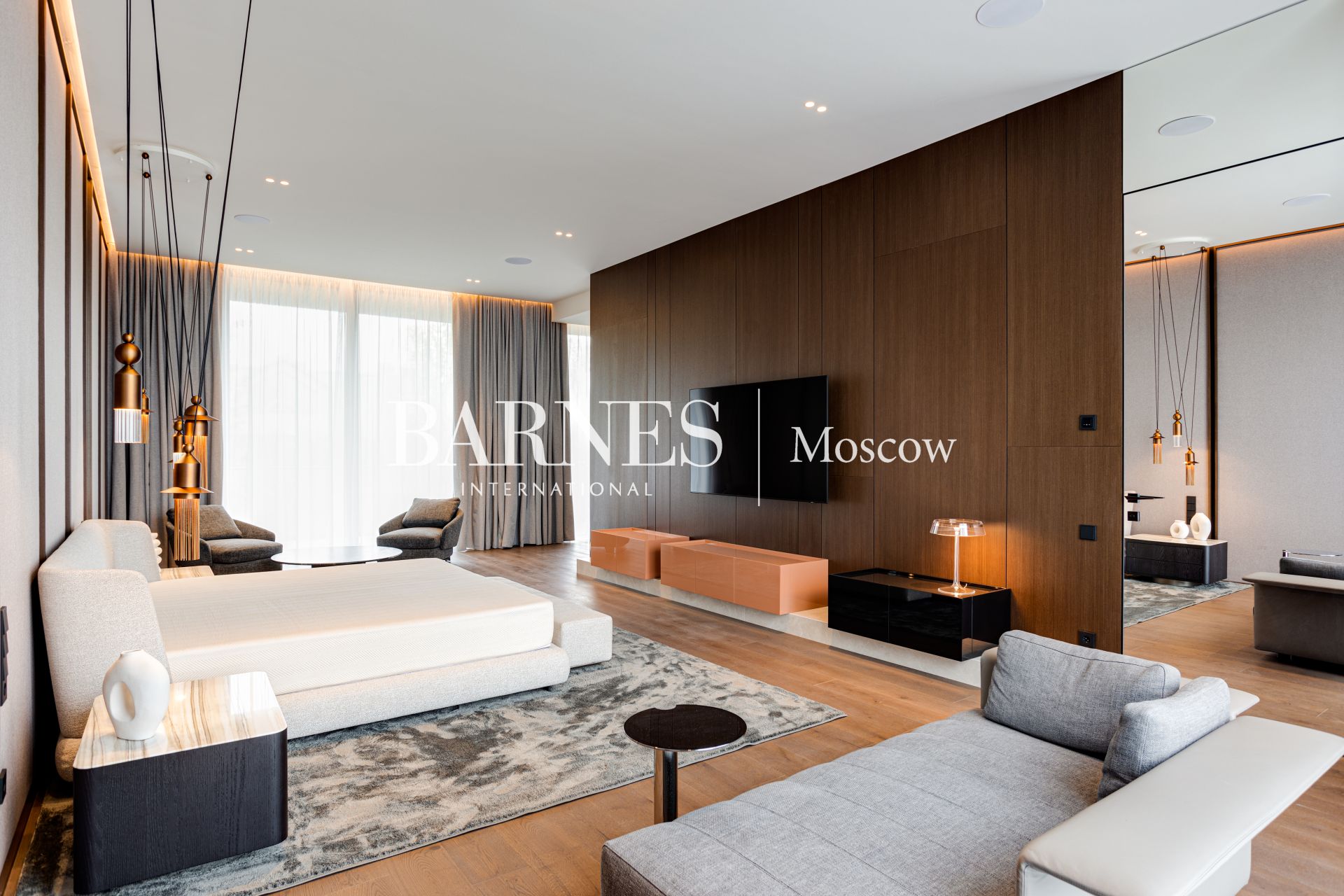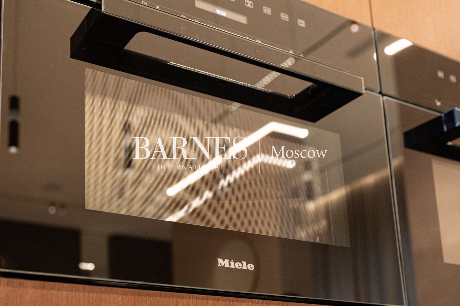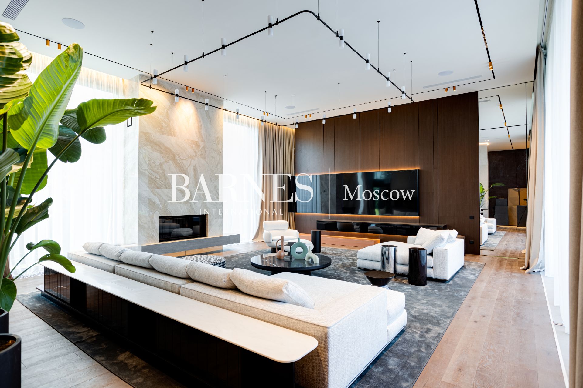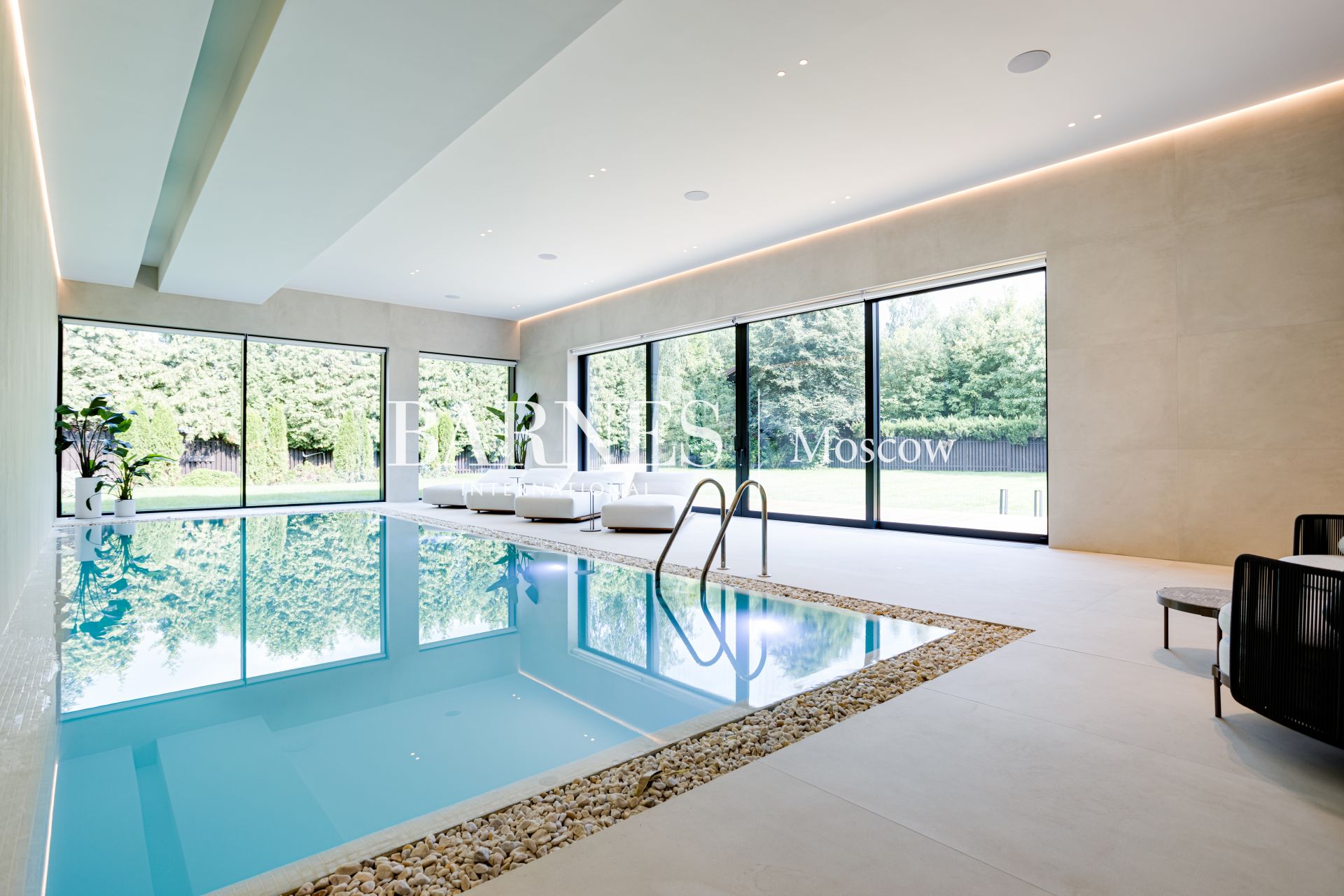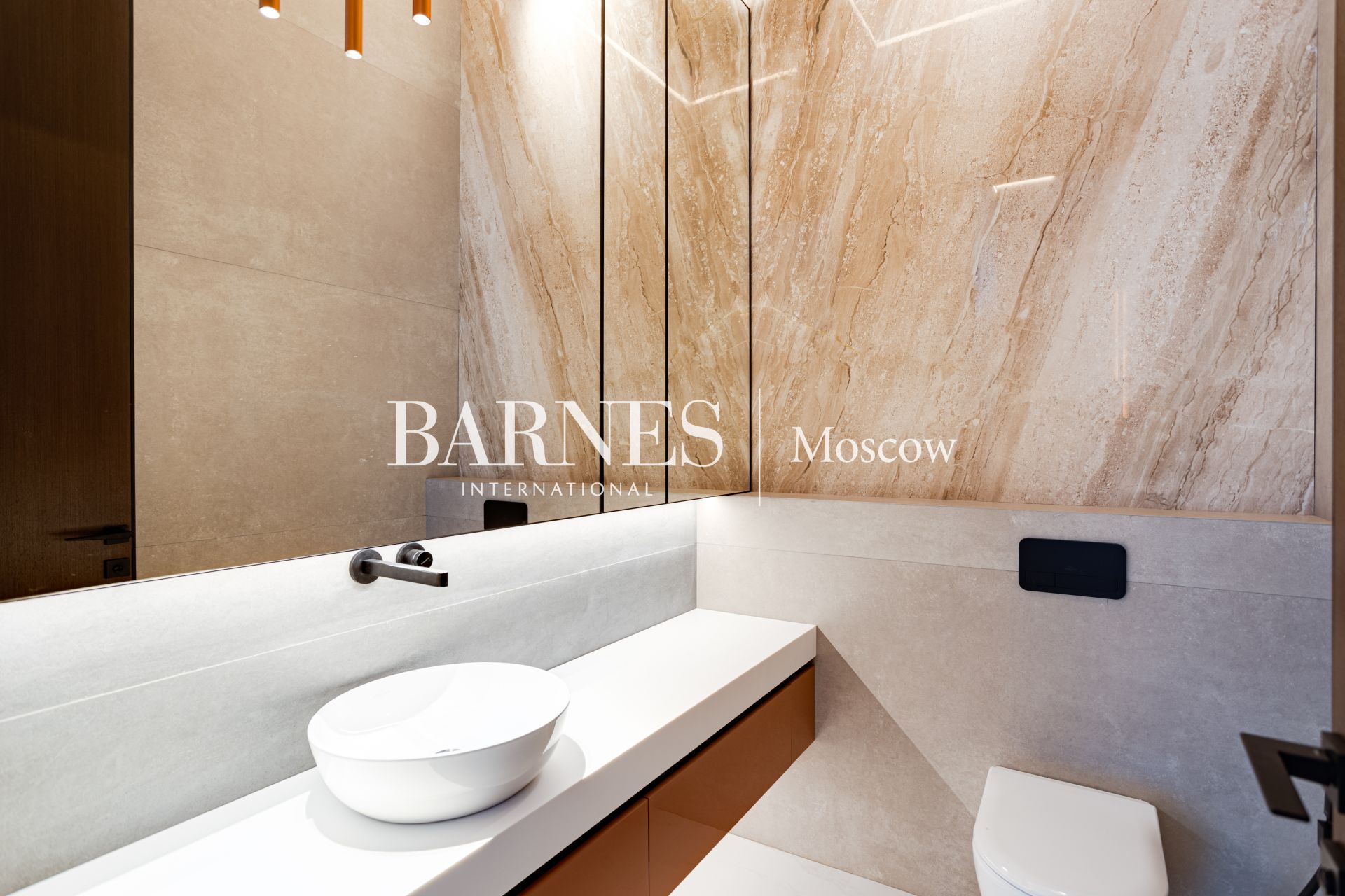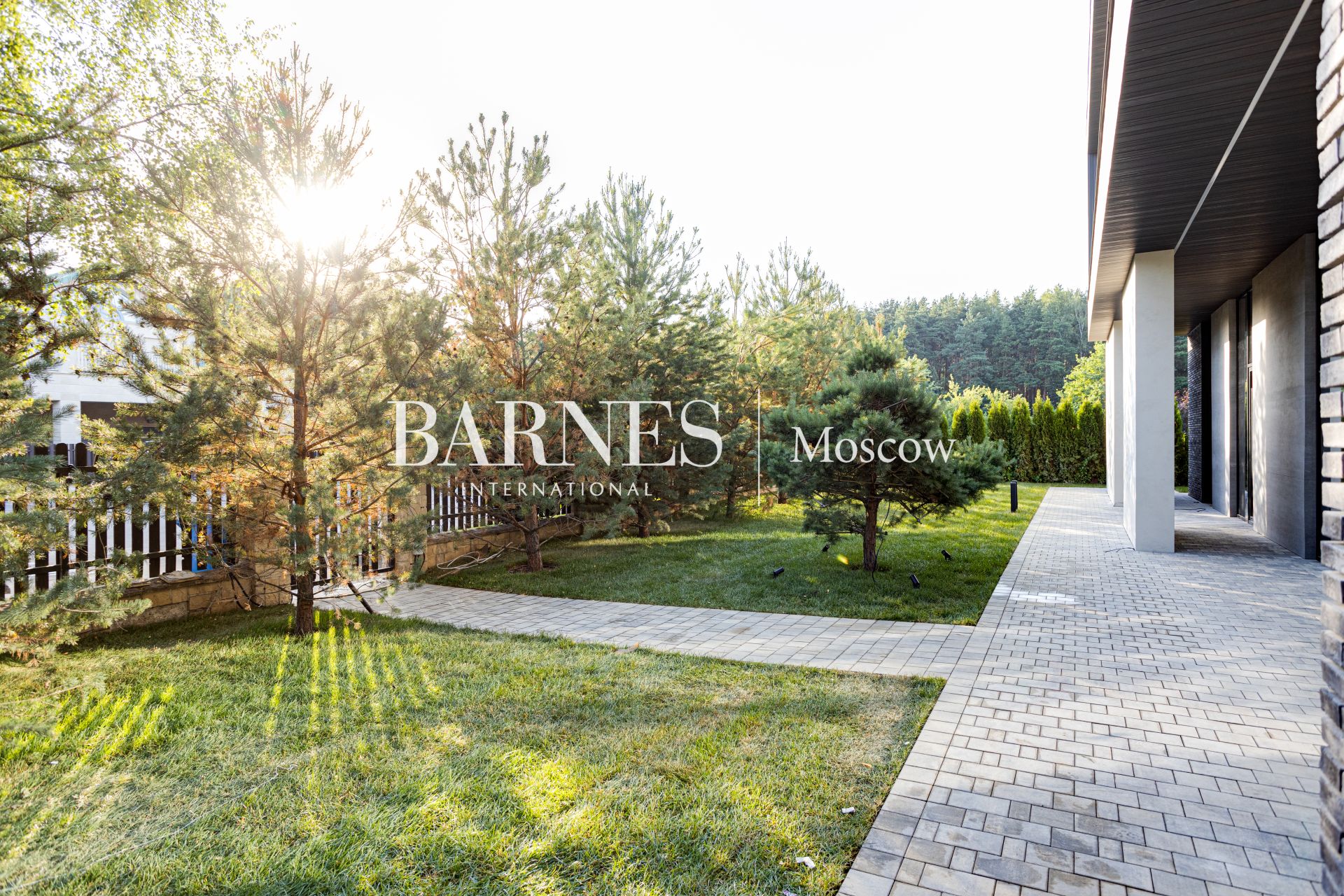 В отделке фасадов применена крупноформатная керамика LAMINAM контрастных цветов и разноширокий термированный планкен. Большие площади остекления визуально связывают внутреннее пространство дома с улицей. Во внутренней отделке дома применяются качественные отделочные материалы - инженерная доска FINEX, керамика LAMINAM, натуральный камень, столярные изделия и панели, двери UNION. Дом оборудован приточно-вытяжной системой с канальным кондиционированием воздуха. В котельной установлены котлы Viessman. Мебель - MINOTTI, POLIFORM, MERIDIANI, Cattelan Italia. Освещение - CENTRSVET, Flos, Vibia. Сантехника - HANSGROHE, Villeroy&Boch, Salini. Бытовая техника - Miele, ASKO.
