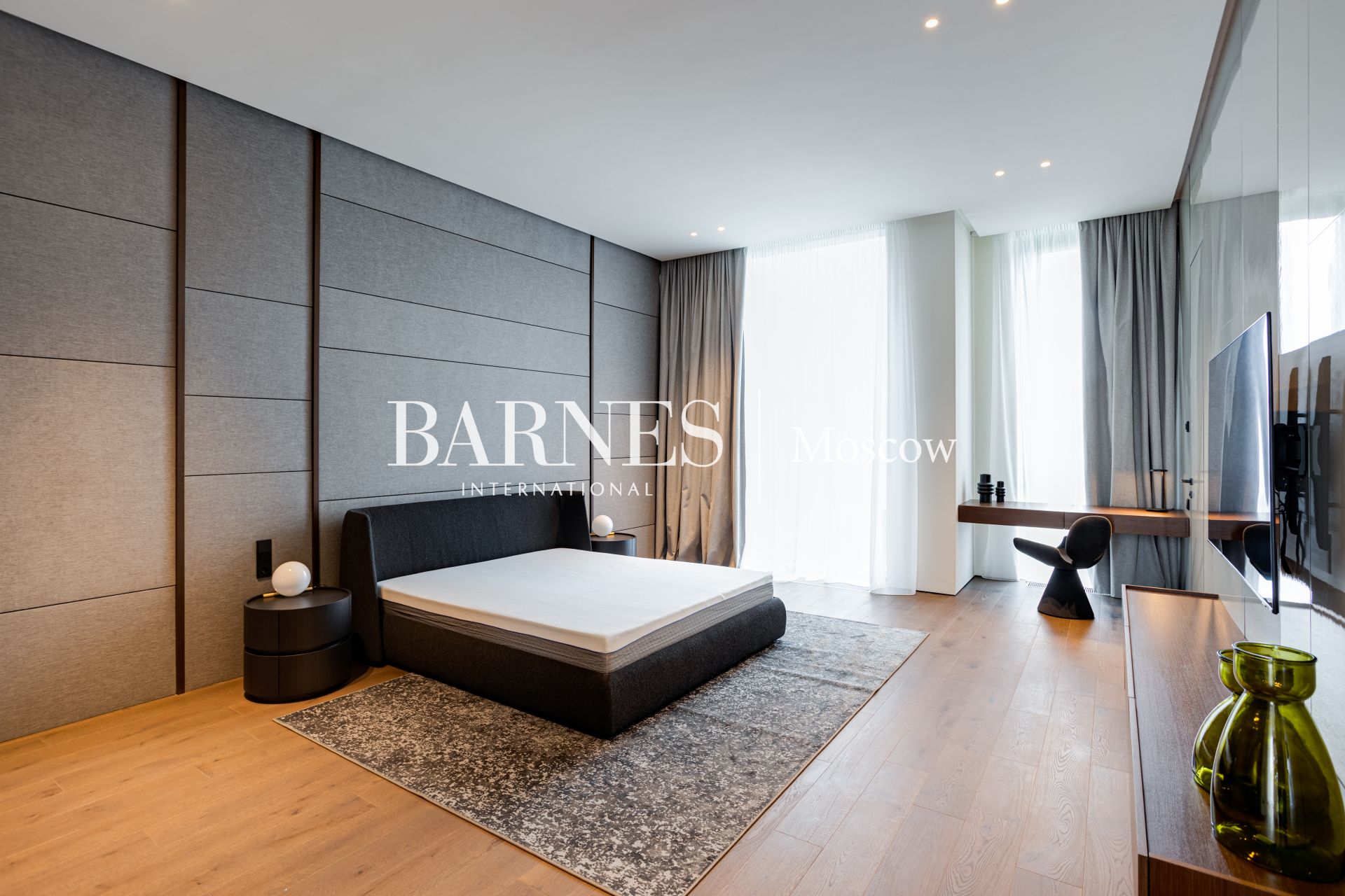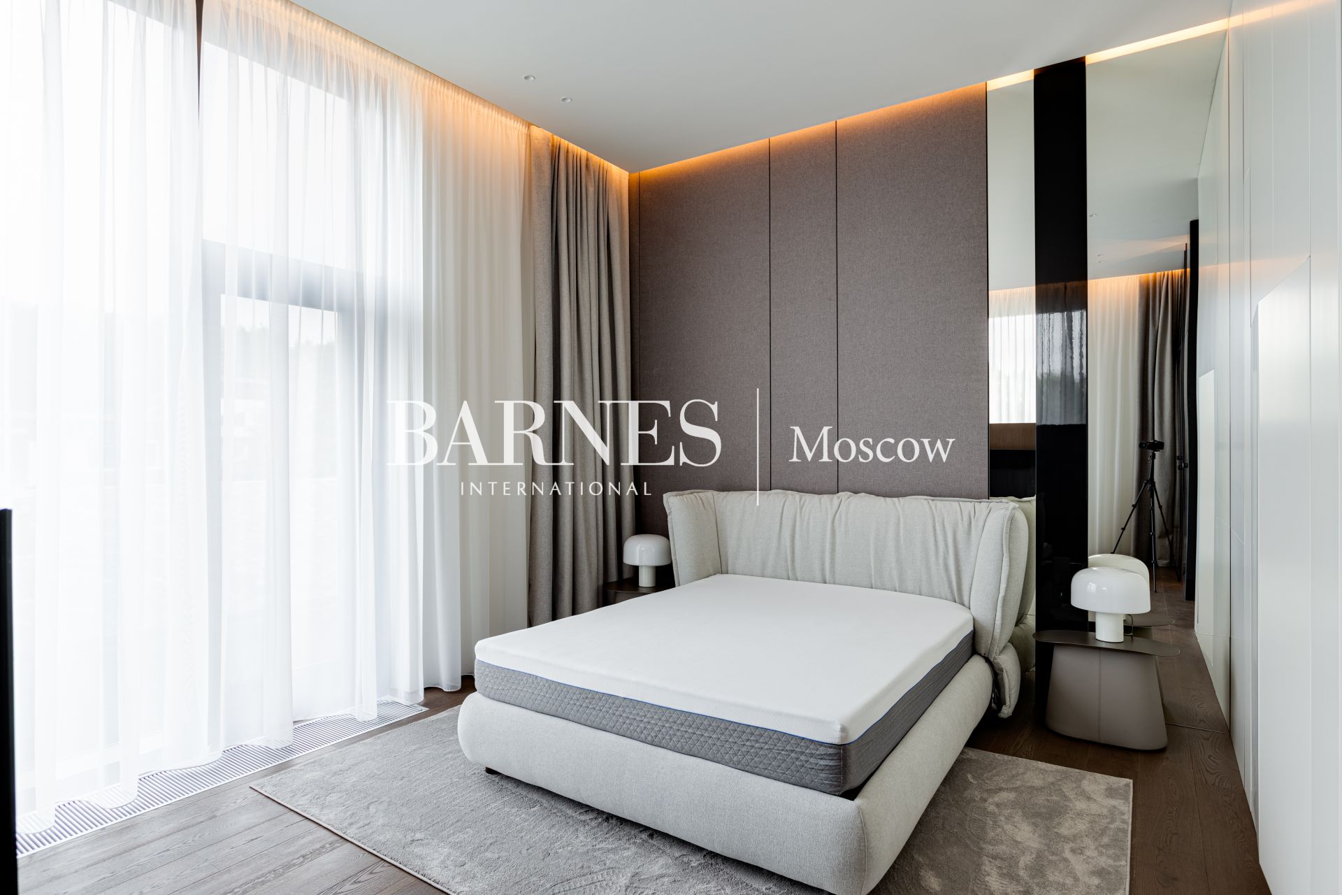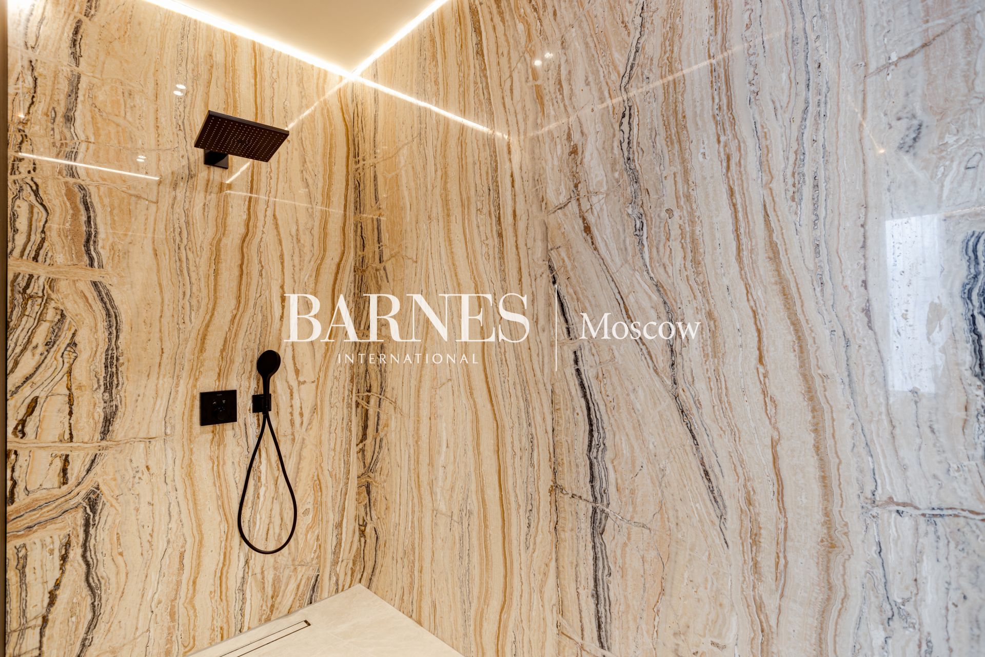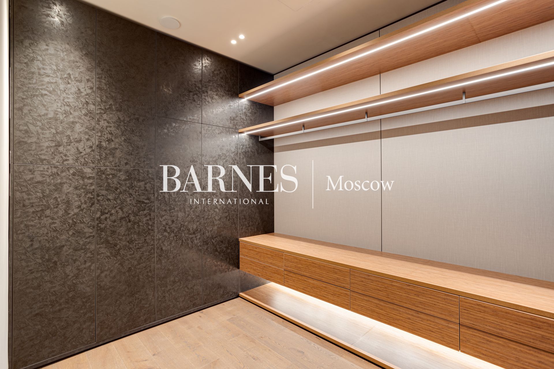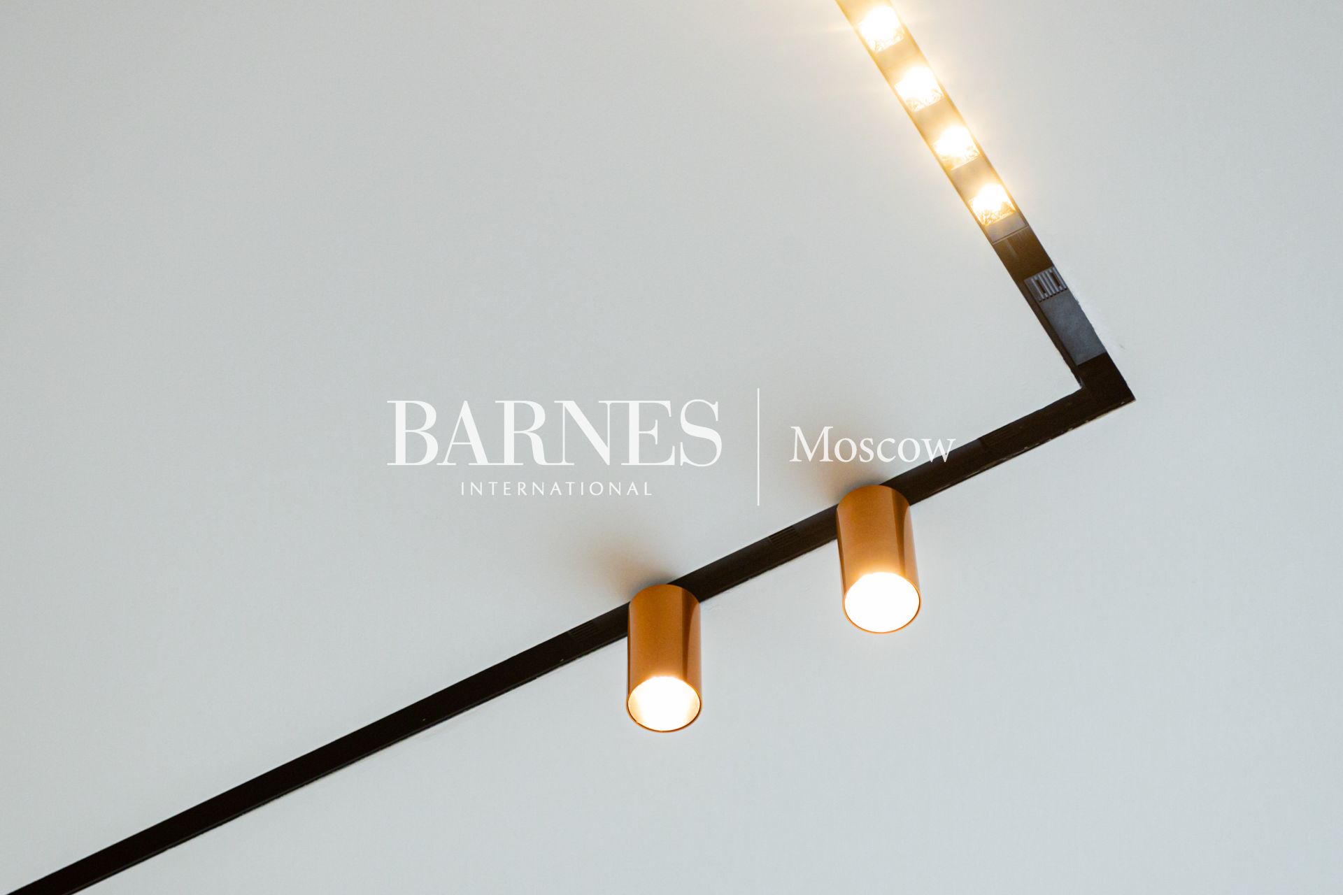 В отделке фасадов применена крупноформатная керамика LAMINAM контрастных цветов и разноширокий термированный планкен. Большие площади остекления визуально связывают внутреннее пространство дома с улицей. Во внутренней отделке дома применяются качественные отделочные материалы - инженерная доска FINEX, керамика LAMINAM, натуральный камень, столярные изделия и панели, двери UNION. Дом оборудован приточно-вытяжной системой с канальным кондиционированием воздуха. В котельной установлены котлы Viessman. Мебель - MINOTTI, POLIFORM, MERIDIANI, Cattelan Italia. Освещение - CENTRSVET, Flos, Vibia. Сантехника - HANSGROHE, Villeroy&Boch, Salini. Бытовая техника - Miele, ASKO.