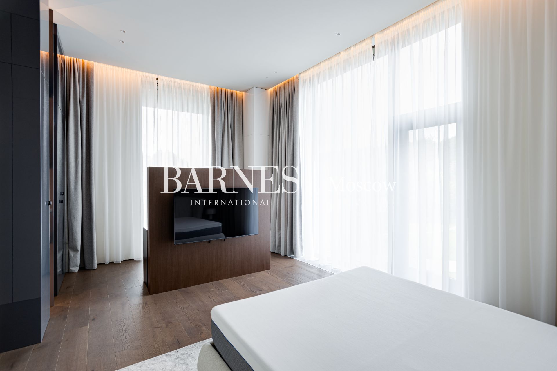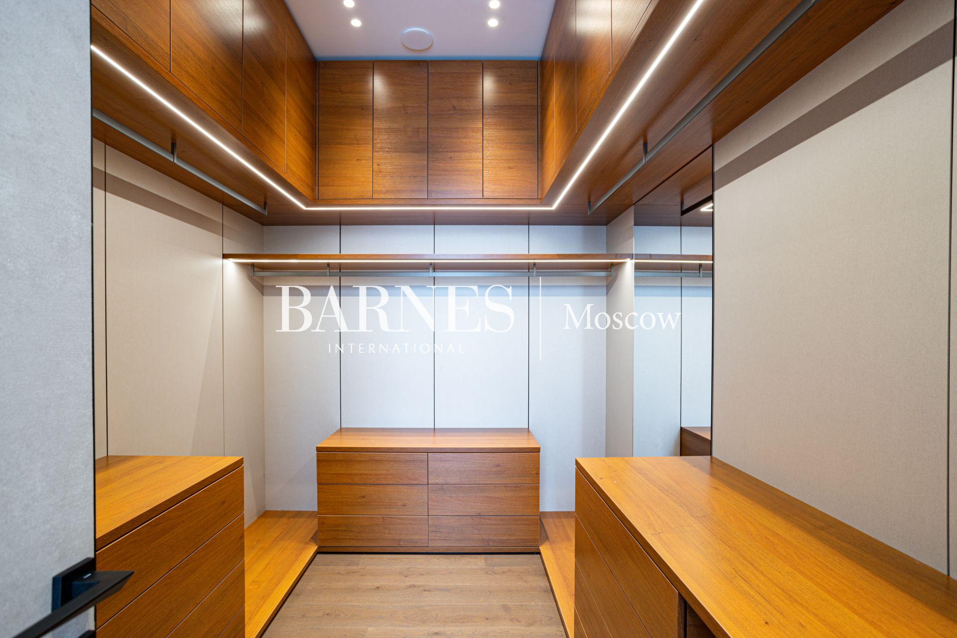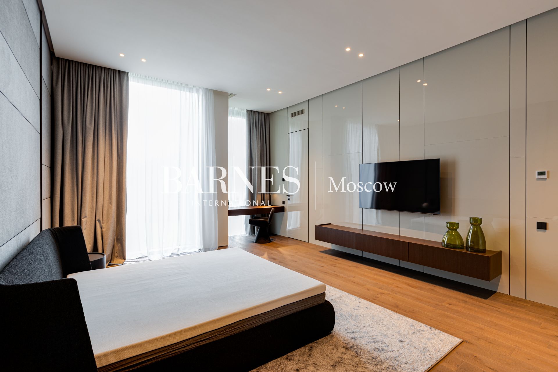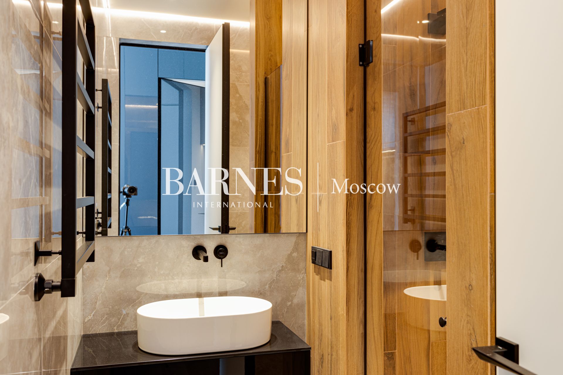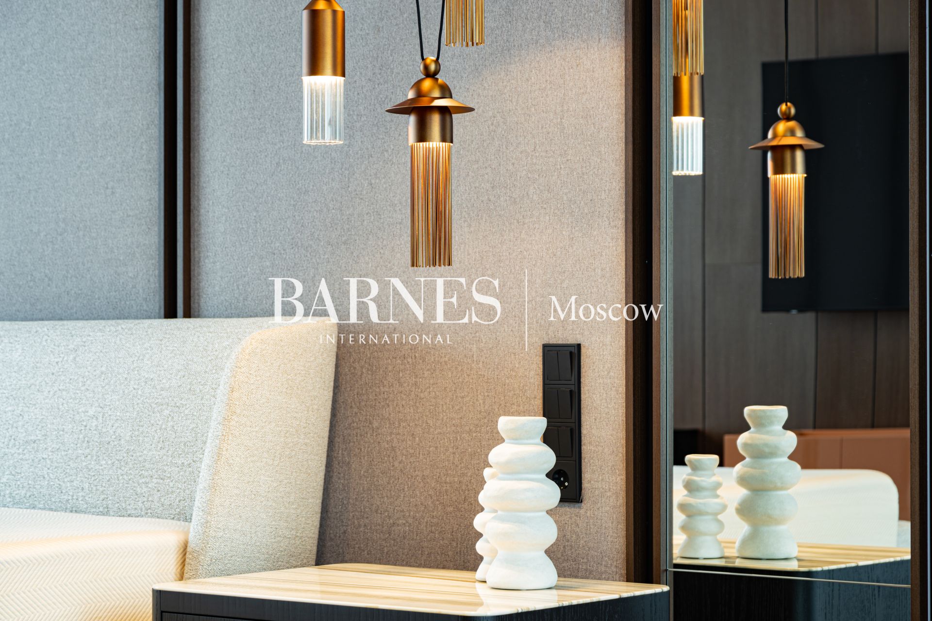 В отделке фасадов применена крупноформатная керамика LAMINAM контрастных цветов и разноширокий термированный планкен. Большие площади остекления визуально связывают внутреннее пространство дома с улицей. Во внутренней отделке дома применяются качественные отделочные материалы - инженерная доска FINEX, керамика LAMINAM, натуральный камень, столярные изделия и панели, двери UNION. Дом оборудован приточно-вытяжной системой с канальным кондиционированием воздуха. В котельной установлены котлы Viessman. Мебель - MINOTTI, POLIFORM, MERIDIANI, Cattelan Italia. Освещение - CENTRSVET, Flos, Vibia. Сантехника - HANSGROHE, Villeroy&Boch, Salini. Бытовая техника - Miele, ASKO.