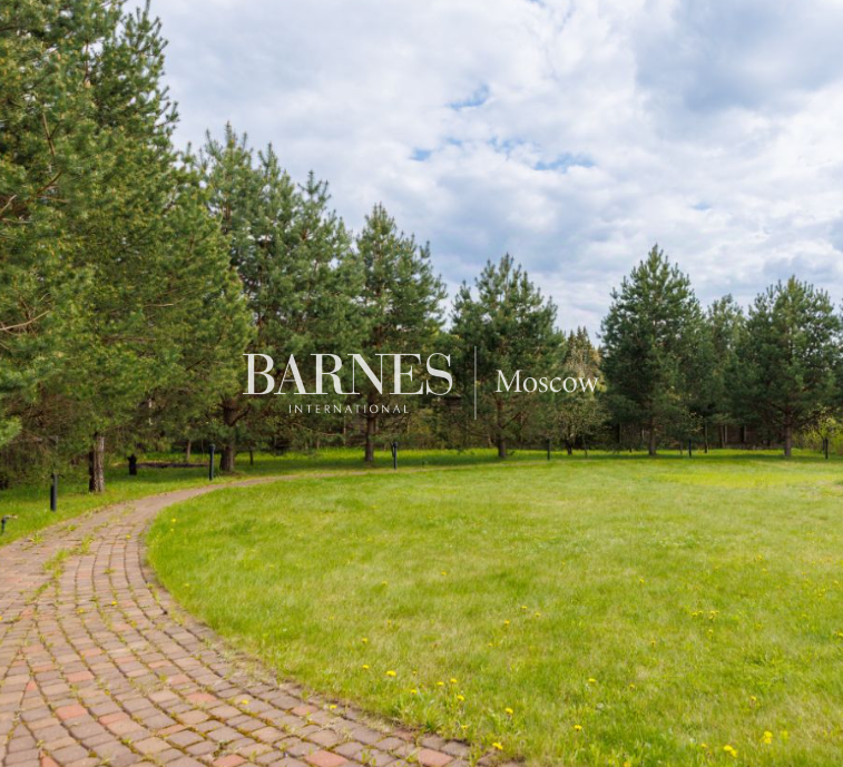 Участок ровный, правильной формы с ландшафтными работами: газон, дорожки, декоративные насаждения, по периметру высажены сосны.
