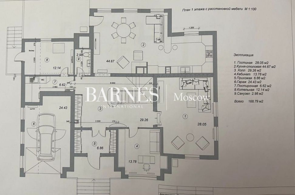 1 этаж: холл, гардеробная, кухня-столовая с камином и выходом на террасу, гостиная, с/у, кабинет, подсобные помещения: постирочная, котельная, кладовая, гараж на 1 м/м;