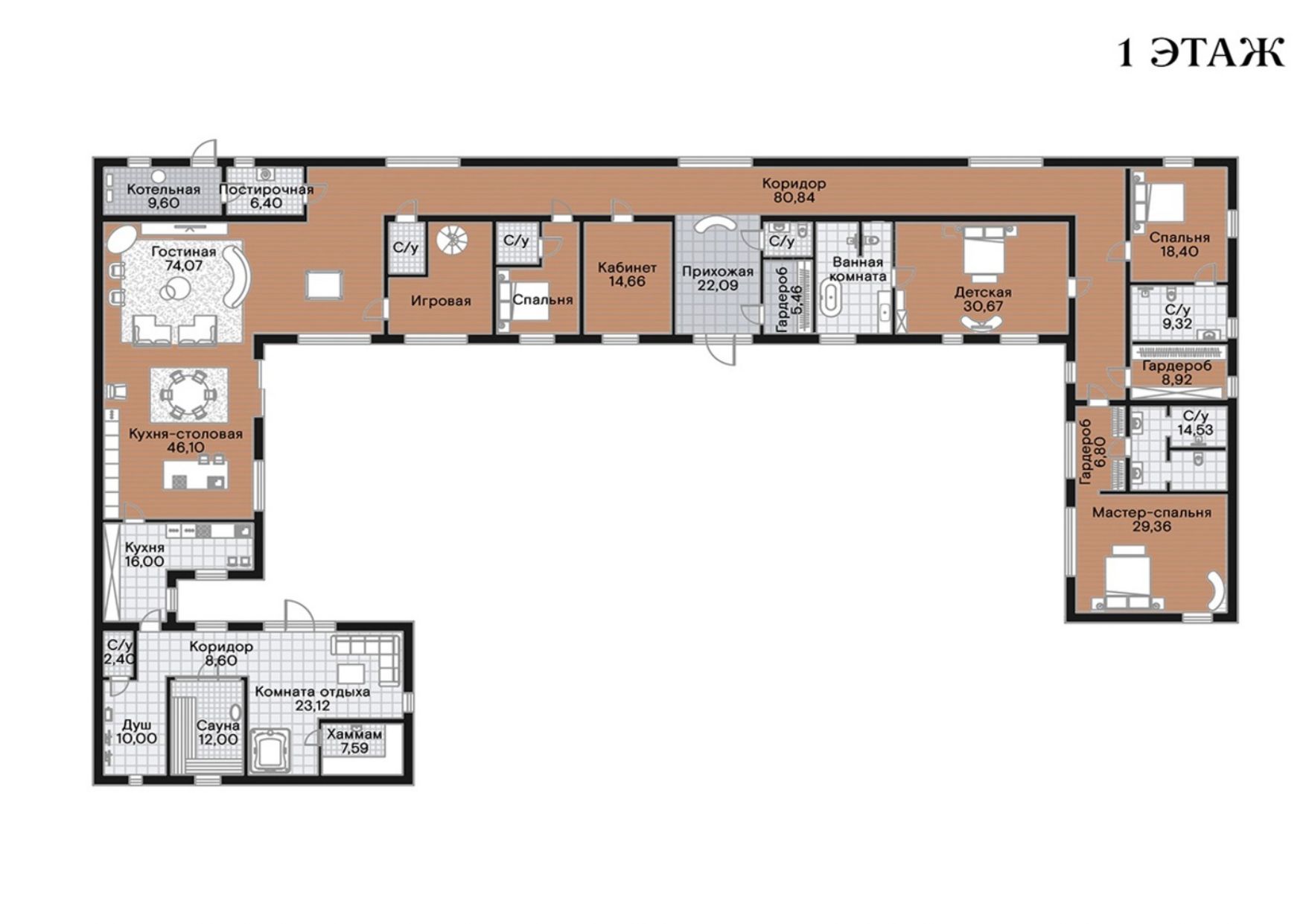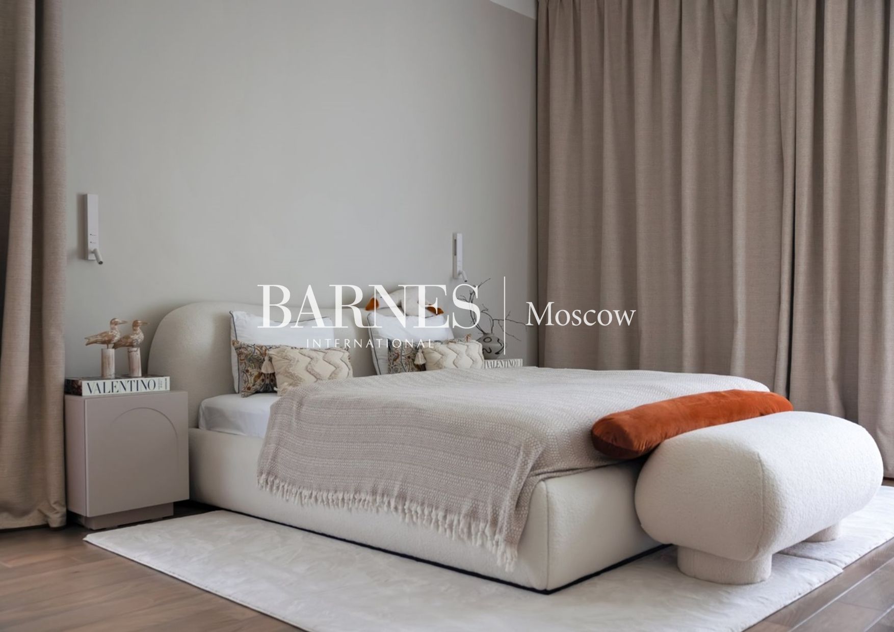 просторная гостиная-столовая с кухней и отдельной технической кухней, холл-галерея, гардеробные, 4 спальни - каждая со своим с/у и гардеробной, а также кабинет и игровая комната в двух уровнях.