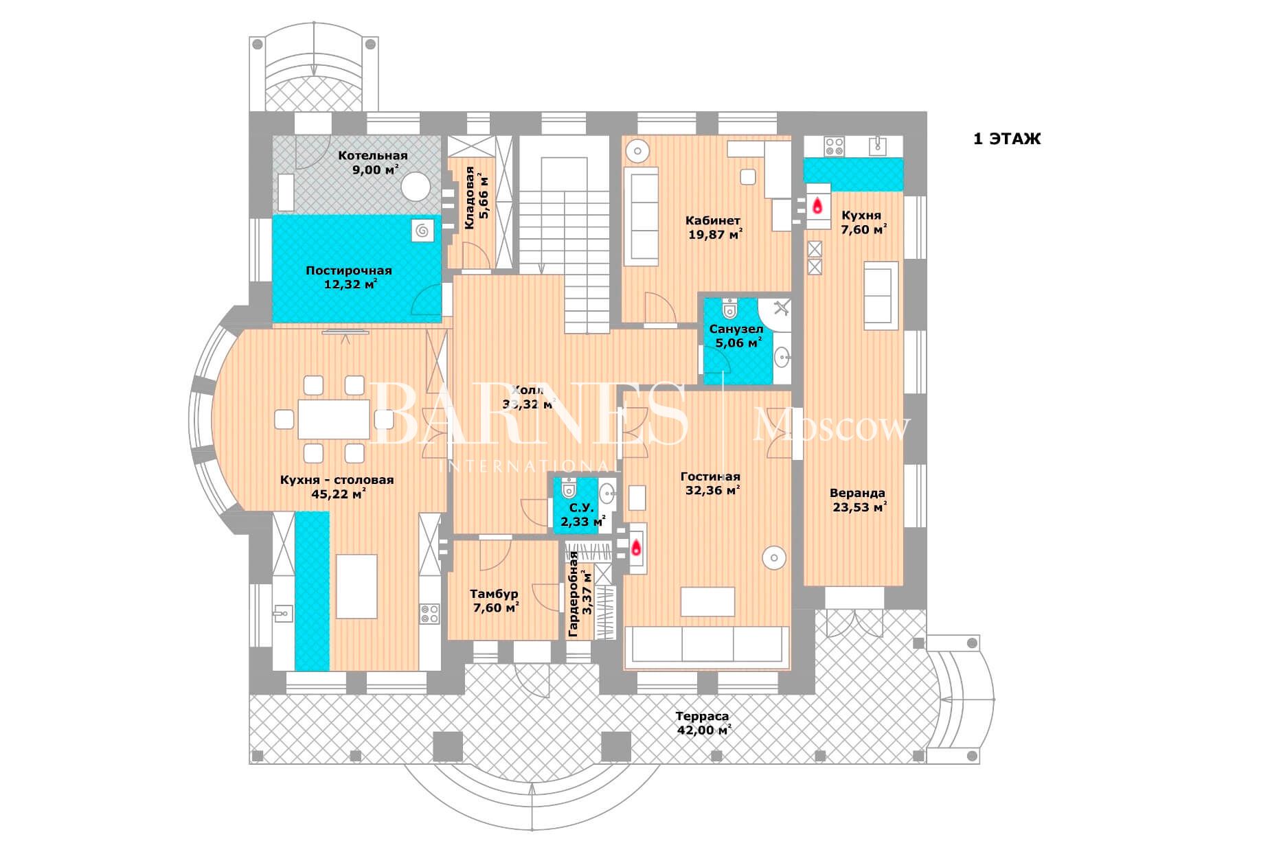 ПЛАНИРОВКА: 1 этаж: Тамбур (7,6), гардеробная (3,37), холл (33,3), кухня-столовая (45,2), гостиная с камином (32,4), спальня/кабинет (19,9), малая кухня с печью (7,6) с верандой (23,5) и выходом на террасу (42), с/у (2,3 + 5).Постирочная (12,3), котельная (9), кладовая (5,7). 2 этаж: Мастер-спальня №1 (37,9) с ванной (12,6), гардеробной (24) и выходом на террасу (20,5).Мастер-спальня №2 (27,8) с ванной (8,5) и гардеробной (8,6).