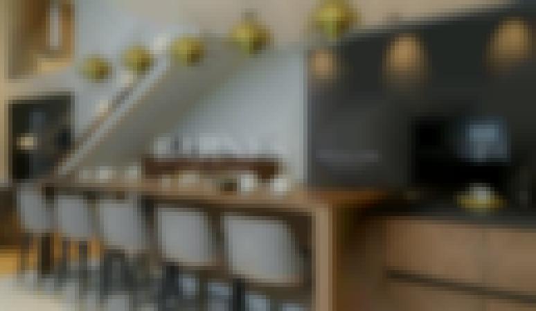 Кухня и обеденная зона: объединены, с барной стойкой и дизайнерскими подвесами Gubi Multi-Lite