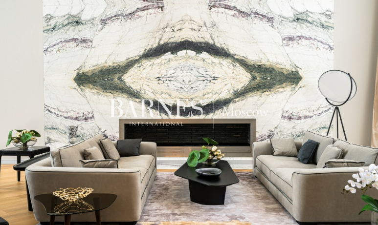 Просторная парадная зона с высоким потолком, панорамными окнами и видом на живописный парк. В центре — мраморное панно из итальянского камня в стиле «бабочка», выступающее скульптурным акцентом, и акустический рояль SCHIMMEL. В интерьере гармонично сочетаются мебель брендов Ulivi, Minotti, Baxter, Rugiano, аксессуары Bosa, Smania, Gallotti&Radice, а также классические элементы — мрамор, оникс, натуральное дерево, стекло и металл.