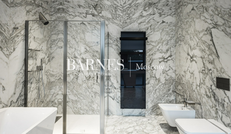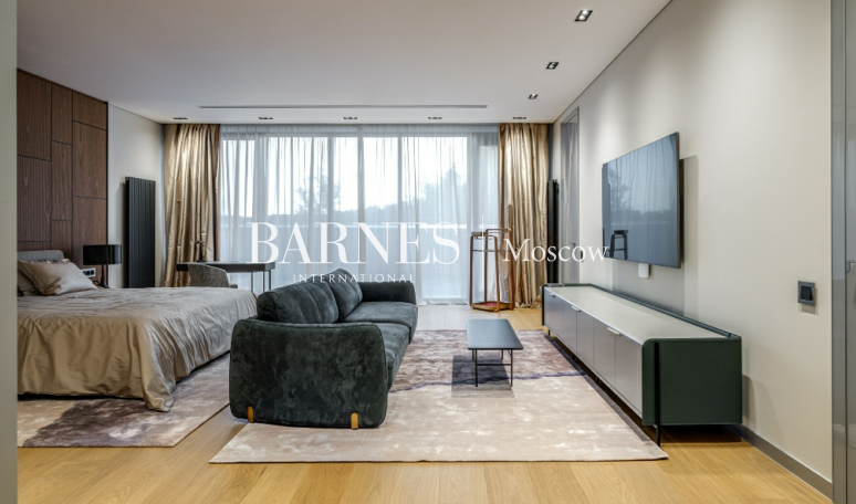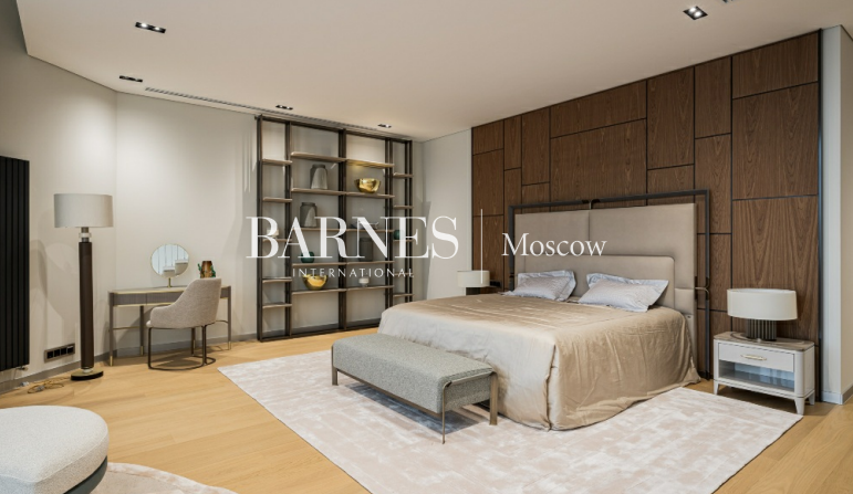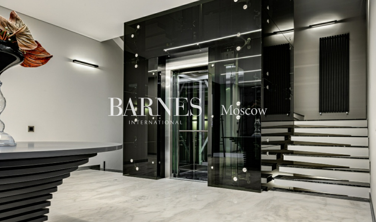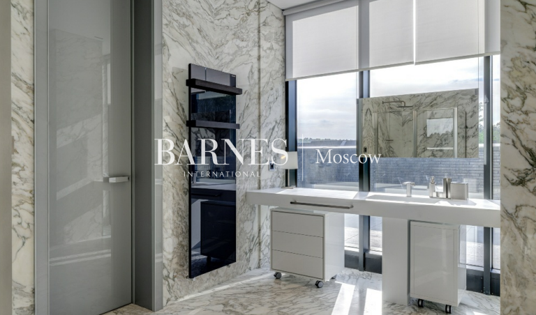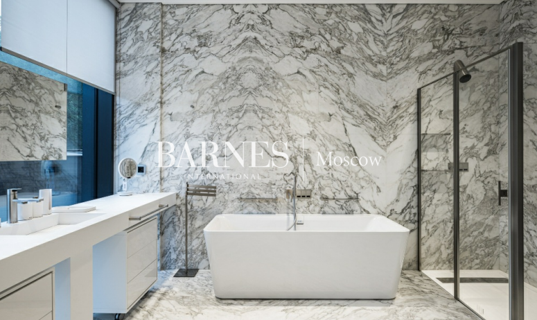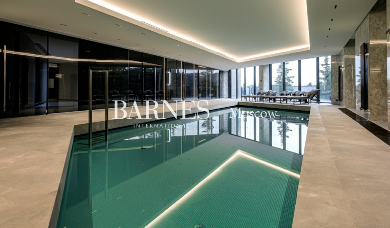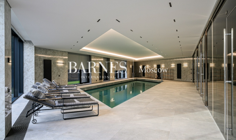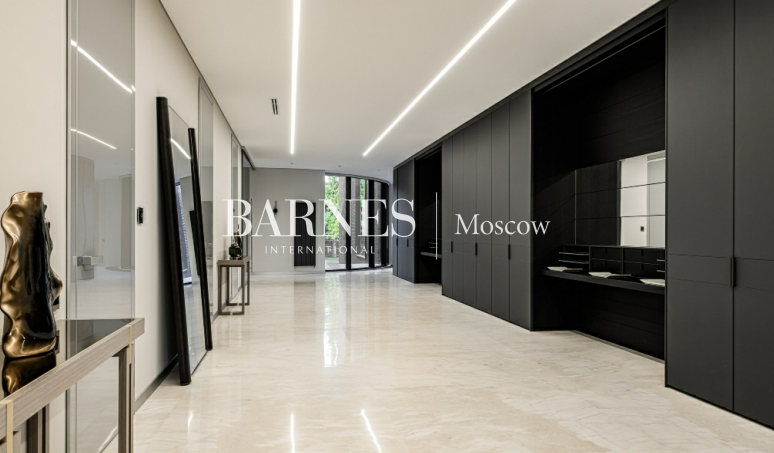 Рабочие пространства: кабинет с библиотекой, парикмахерская, гардеробные.SPA-комплекс: бассейн, сауна, хаммам, душевые, раздевалки Дополнительное: технические помещения, прачечная, продуманная система окон SCHUCCO, двери RIMADESIO, стеклянный лифт. Приватная зона сверху: Две мастер-спальни — одна двусветная с кабинетом и гардеробной (158 м²), вторая с отдельной гостиной и рабочей зоной — и еще 6 спален с собственными санузлами и гардеробными, библиотеки, семейная гостиная. Гибкое пространство: Третий этаж — это зона отдыха, игры, спортзон и спальня для старшего ребёнка или гостей, с постирочной, санузлами и гардеробными. Интерьер — Rugiano, Minotti, Frato, Porada, Aromas del Campo, Cattelan Italia. Цокольный этаж: Отдельный мир — кинотеатр, бильярдная, курительная, две винные комнаты, кухня профессионального уровня, серверная, кладовые, прачечная. Мебель и отделка из натурального мрамора, GRANITI FIANDRE, дубового паркета, создают атмосферу премиума.