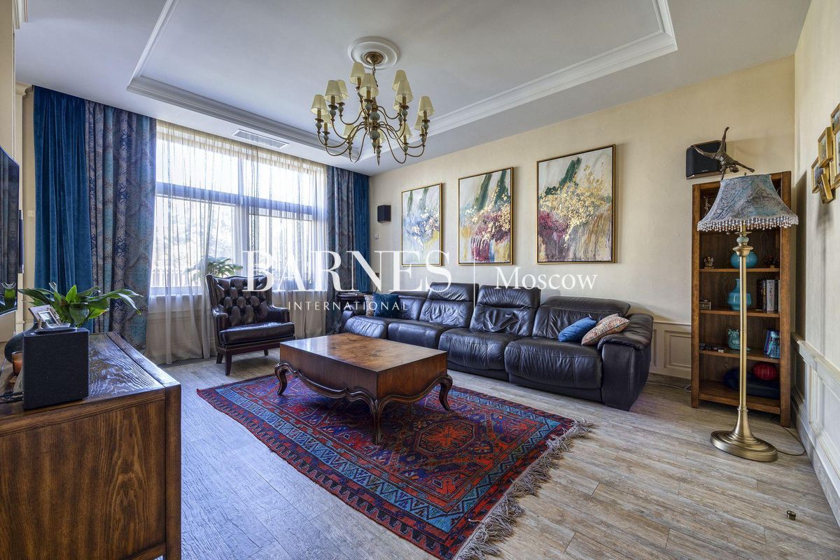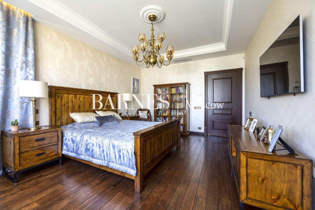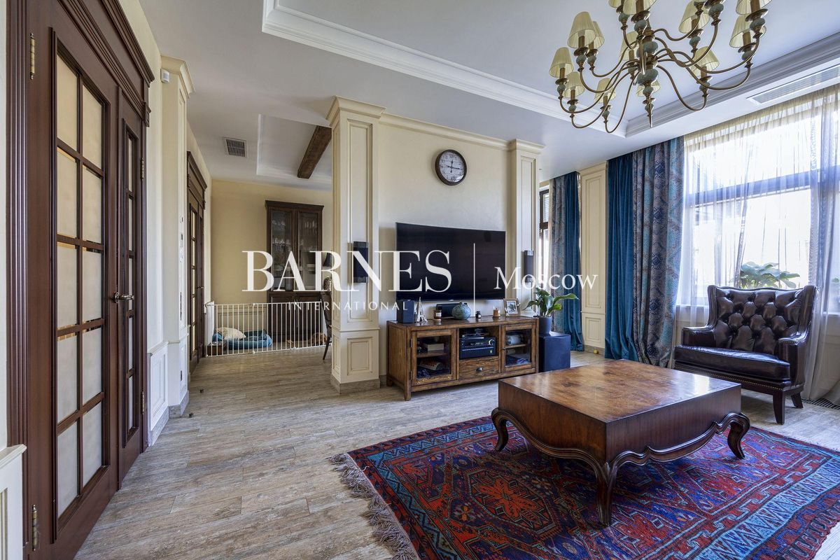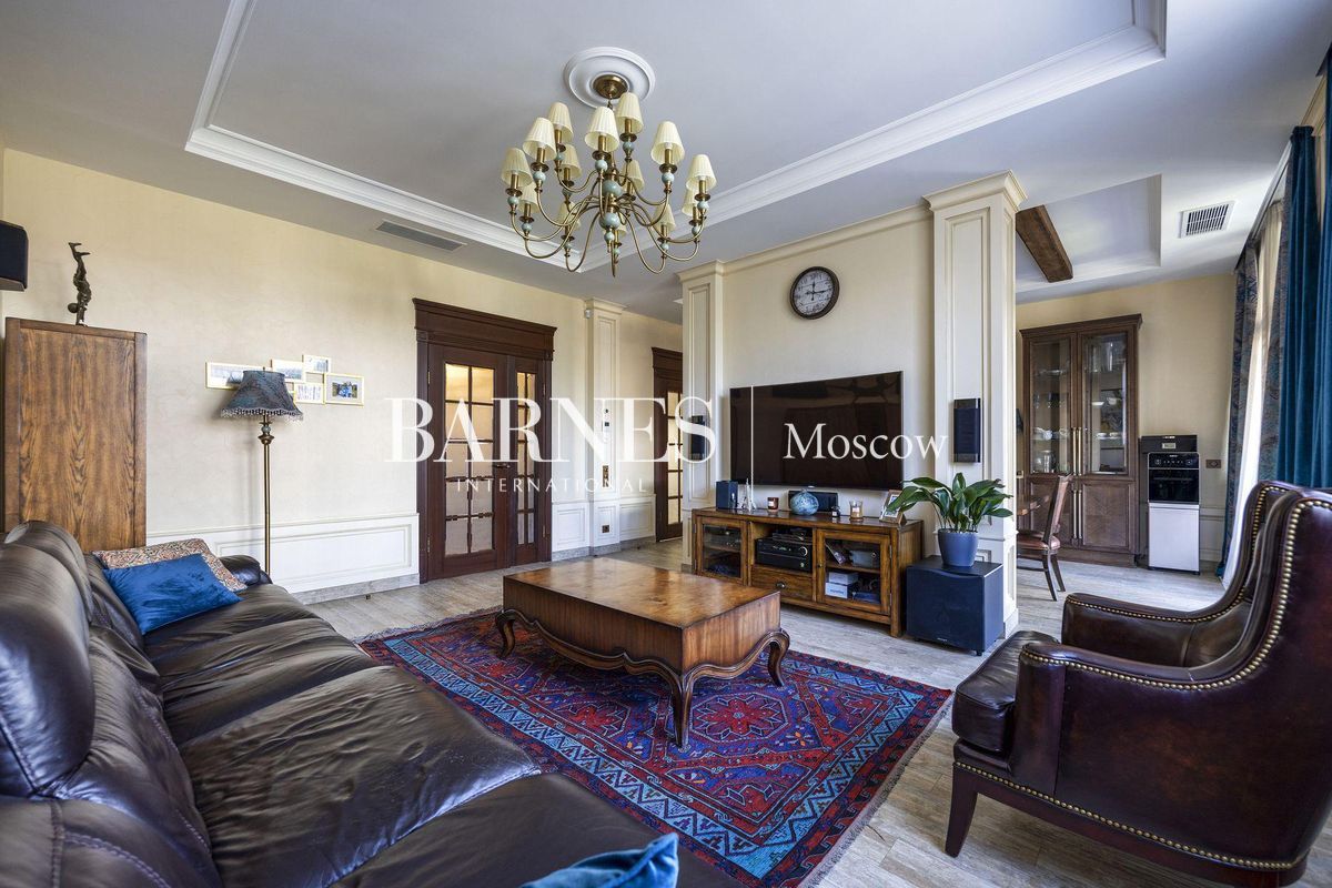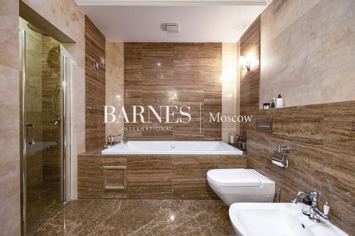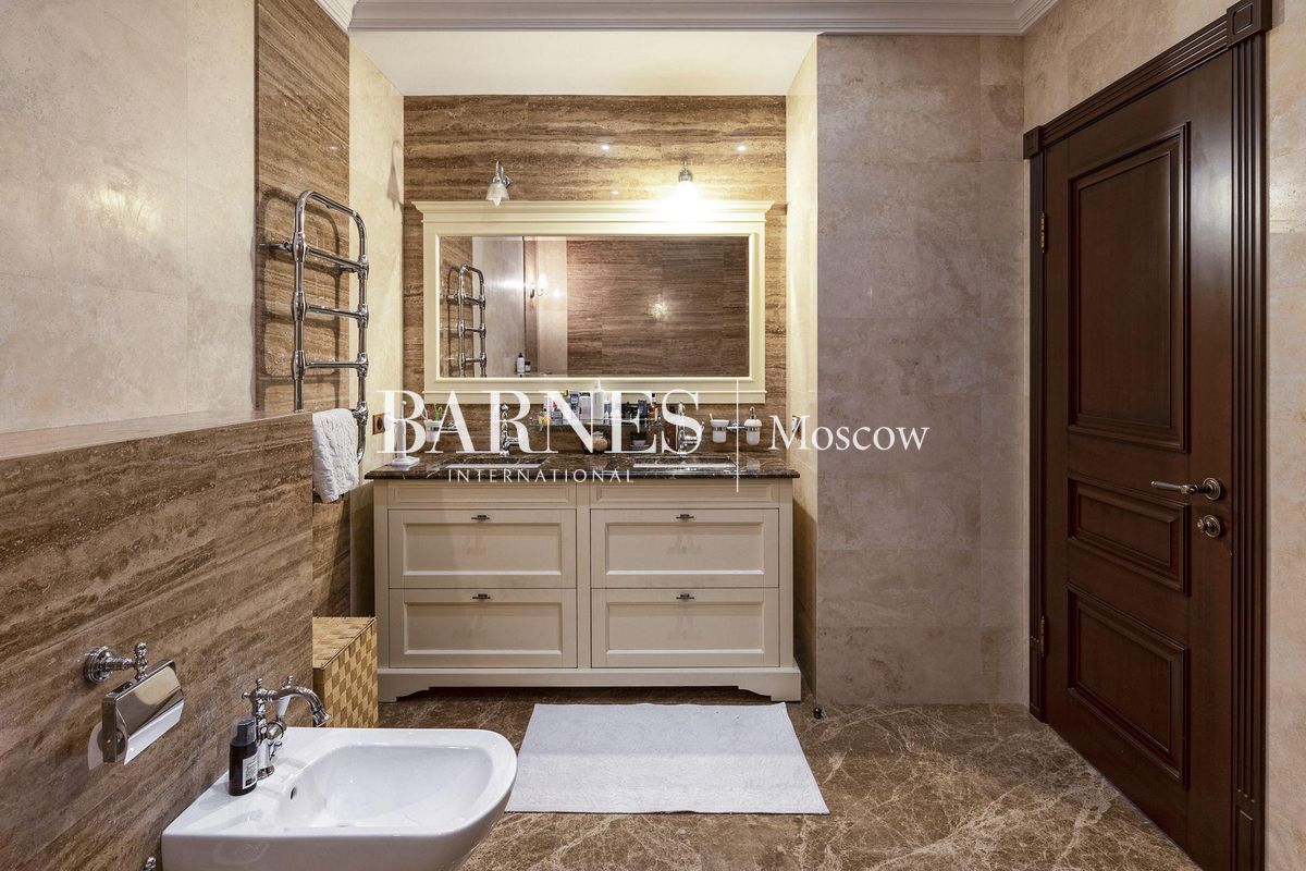 В отделке использованы натуральные породы мрамора и натуральные породы дерева, керамогранит (Италия), травертин.Вся корпусная мебель изготовлена по индивидуальному заказу, сантехника итальянского производства. Бытовая техникапремиального бренда Miele, а также техника европейских производителей (Германия и Италия).Установлена индивидуальная система приточно-вытяжной вентиляции и кондиционирования Daikin. Сделан водянойтеплый пол, шумоизоляция, сигнализация, единый wi-fi. В гостиной установлен домашний кинотеатр.