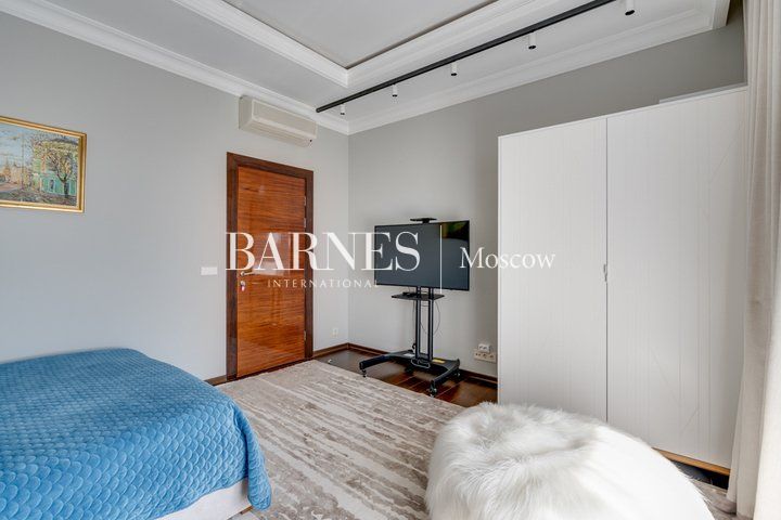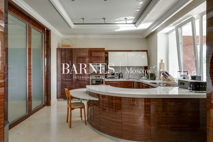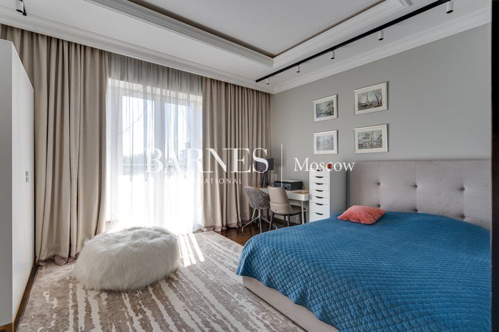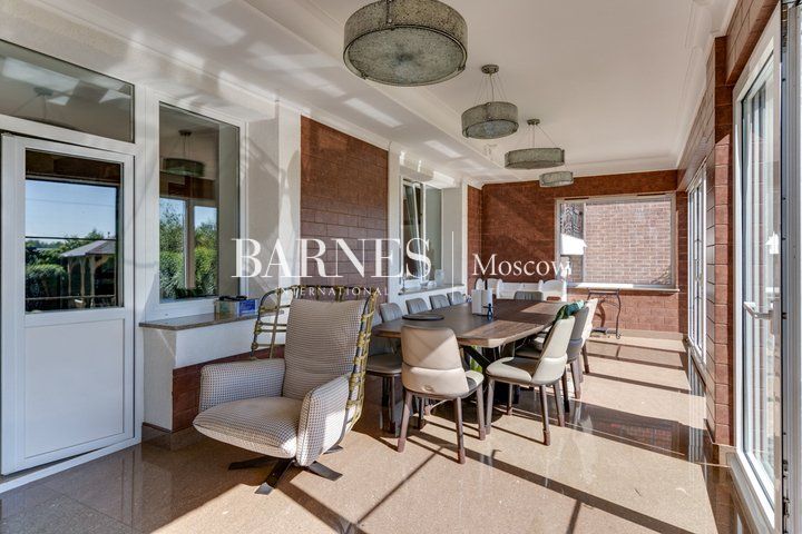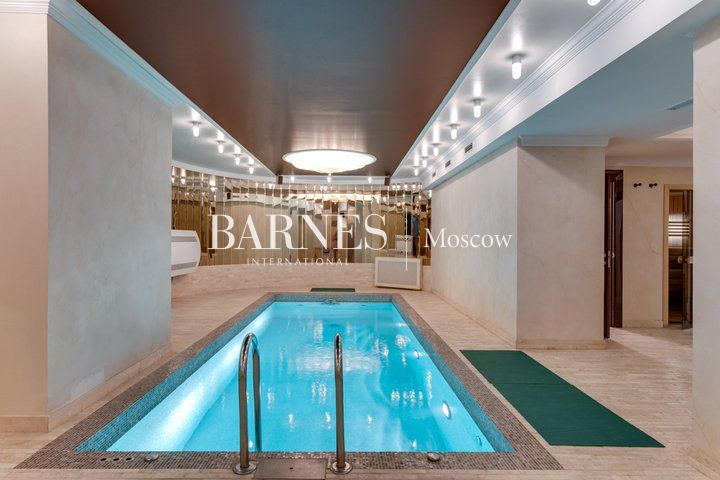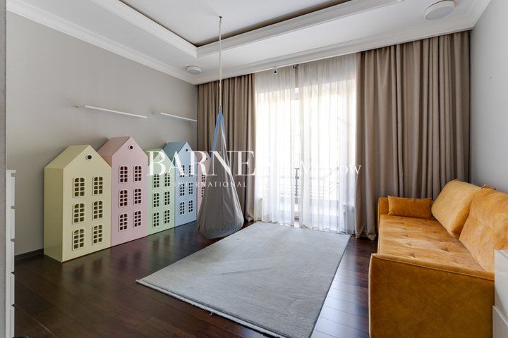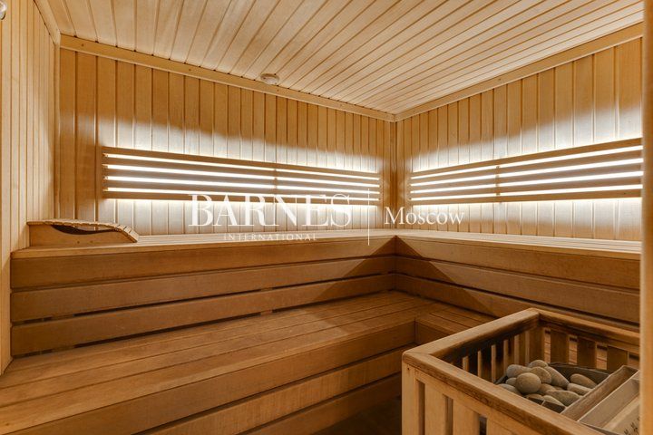 Гостиная с потолками 6,5 м и действующим камином — центральное пространство дома и место притяжения семьи. Кухня-столовая с выходом на террасу и в сад. SPA-зона: бассейн 10 м с противотоком, сауна, душевая, зона отдыха. Мастер-суит с собственной ванной комнатой, библиотекой и выходом на
