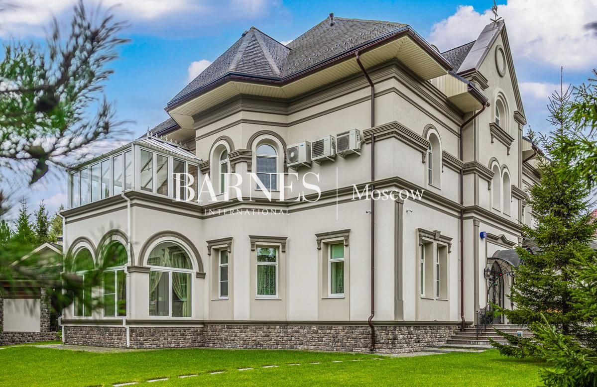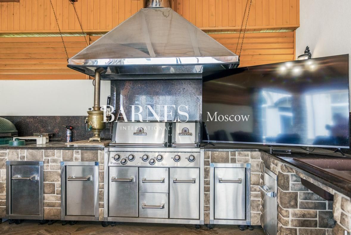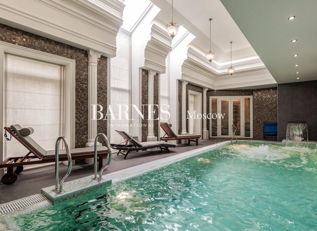 На территории участка расположены: SPA-комплекс с большим бассейном 10,5х3,7м, сауной, хамамом, винной и сигарной комнатой; открытая веранда с профессиональной печью и грилем; гараж на два машино-места с квартирой для персонала.
