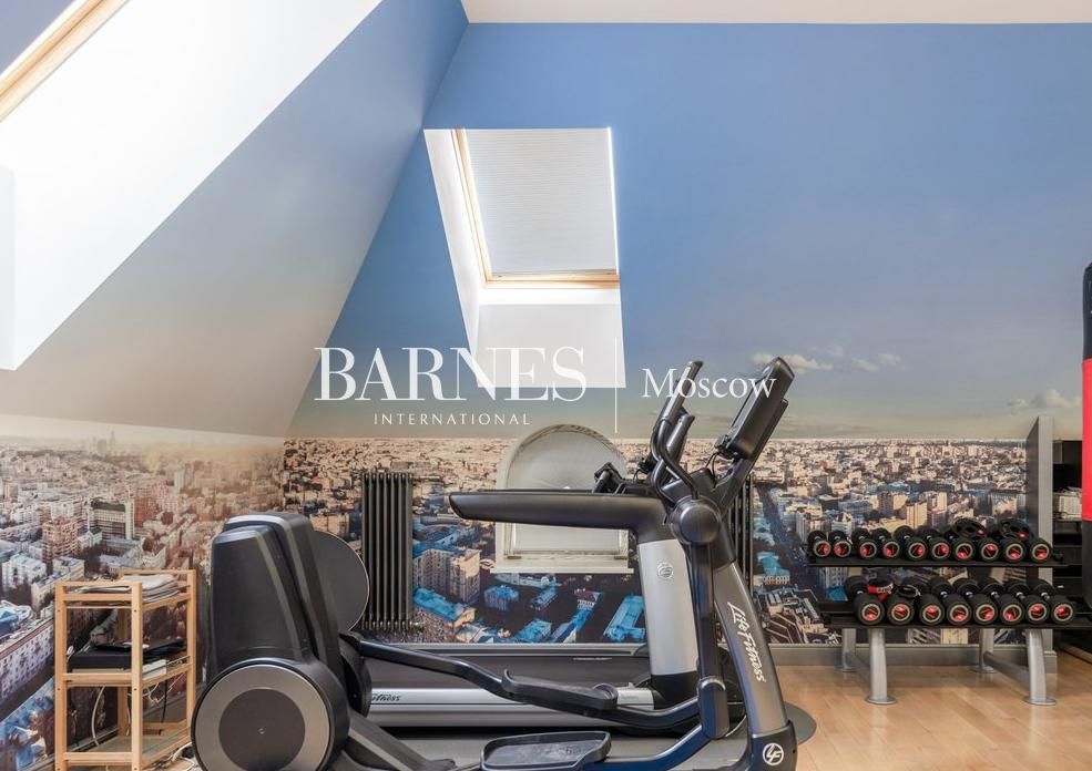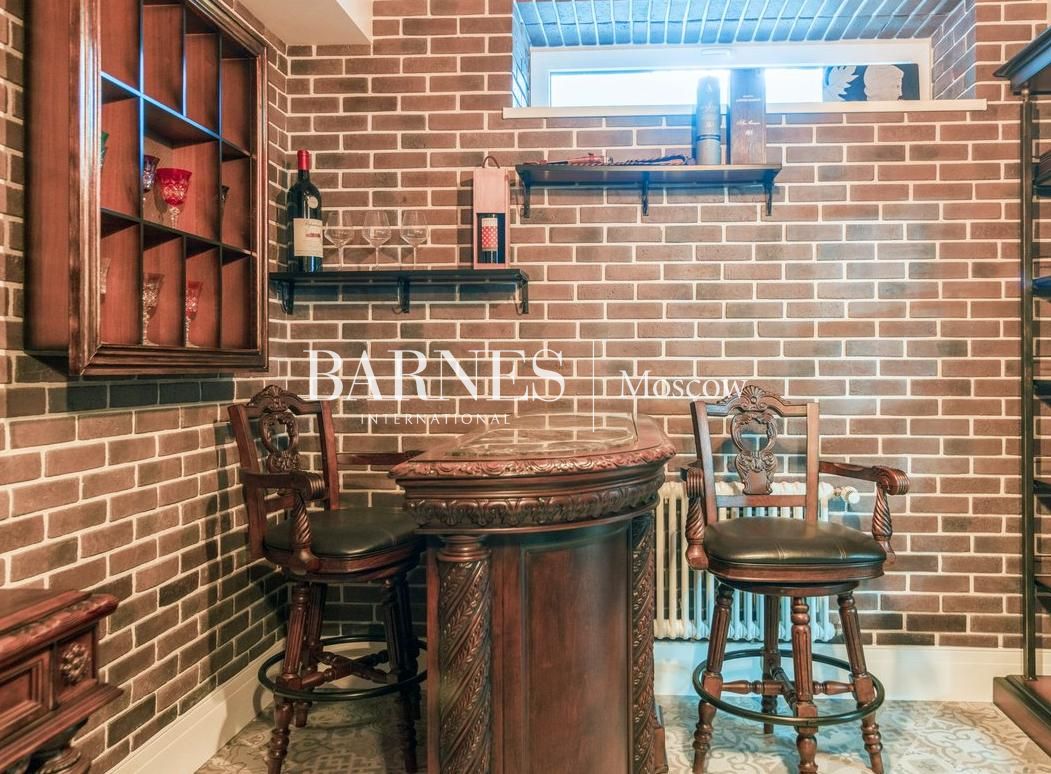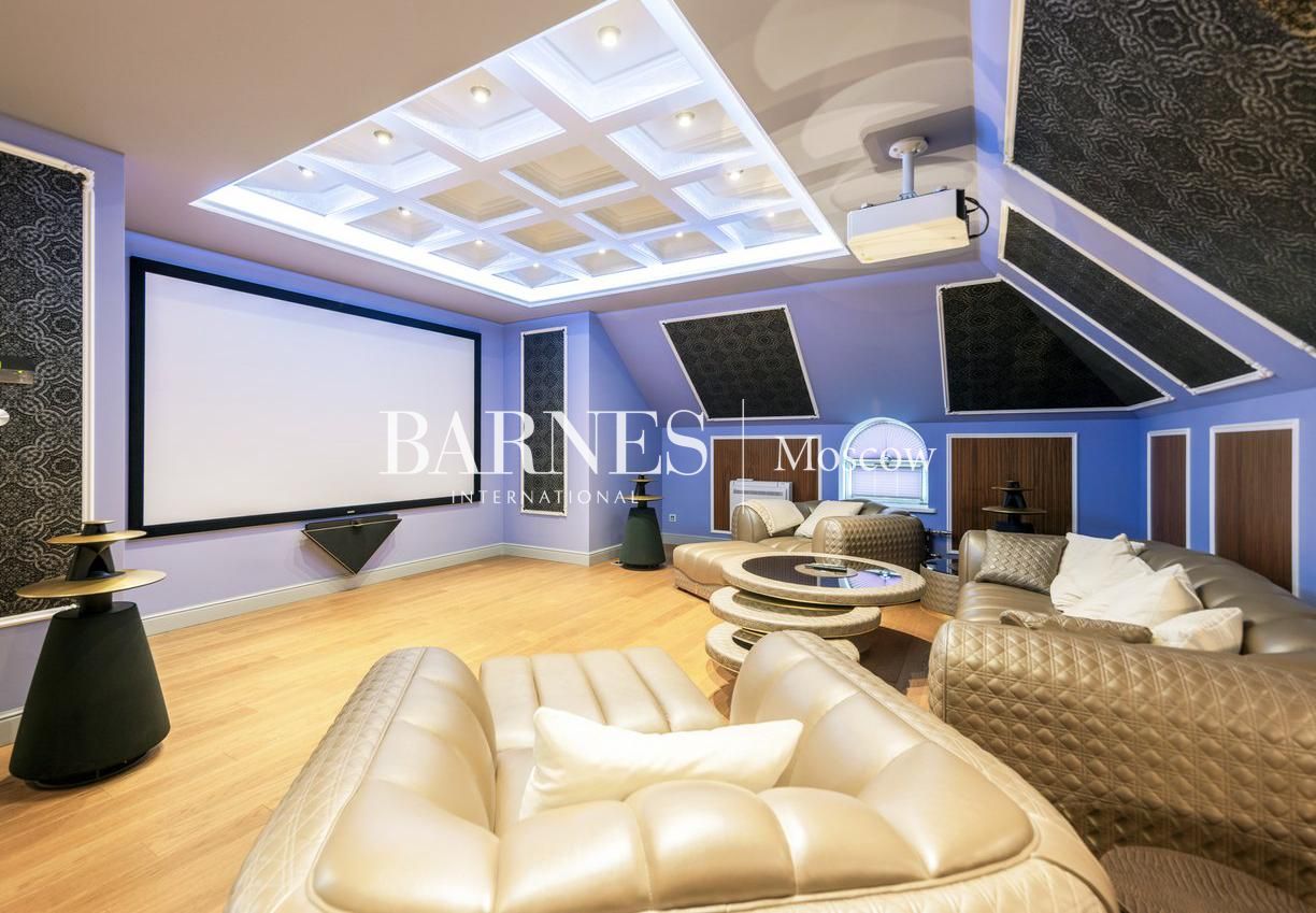 В доме уютная гостиная с выходом на террасу, 5 полноценных спален, просторный кабинет с камином (при необходимости может быть использован как дополнительная спальня),оборудованный тренажерами спортзал, домашний кинотеатр и бильярдная.