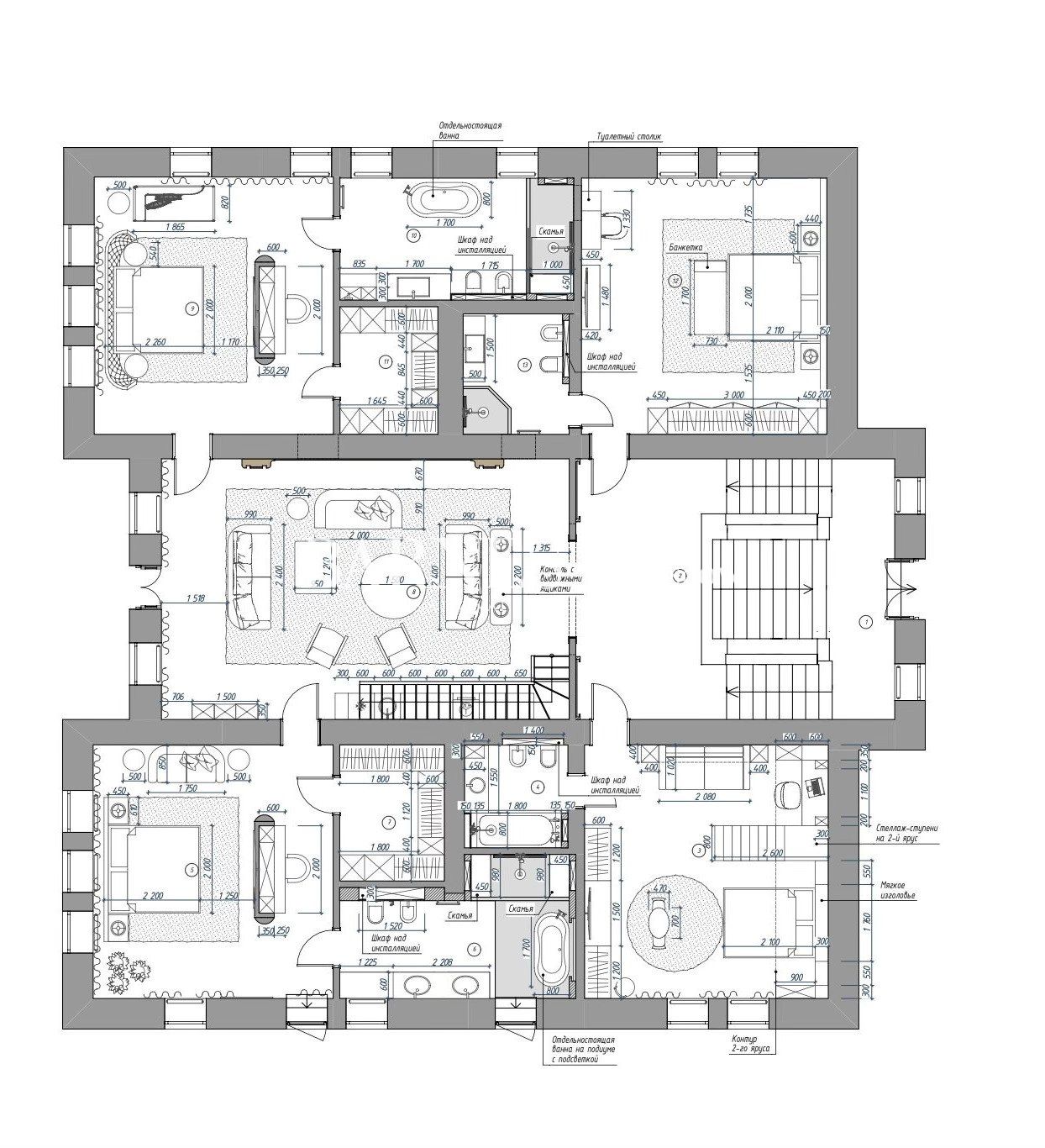 2 этаж: 2 спальни с гардеробными и с/у, 2 спальни с с/у, лаундж помещение.