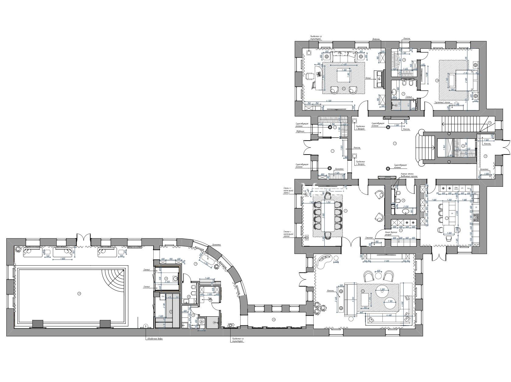 1 этаж: холл, гардеробная, гостиная с выходом на террасу, столовая, кухня, каминный зал, спальня с гардеробной и с/у, с/у, СПА-зона: бассейн, зона отдыха, сауна, хамам, раздевалка с душевой, с/у;