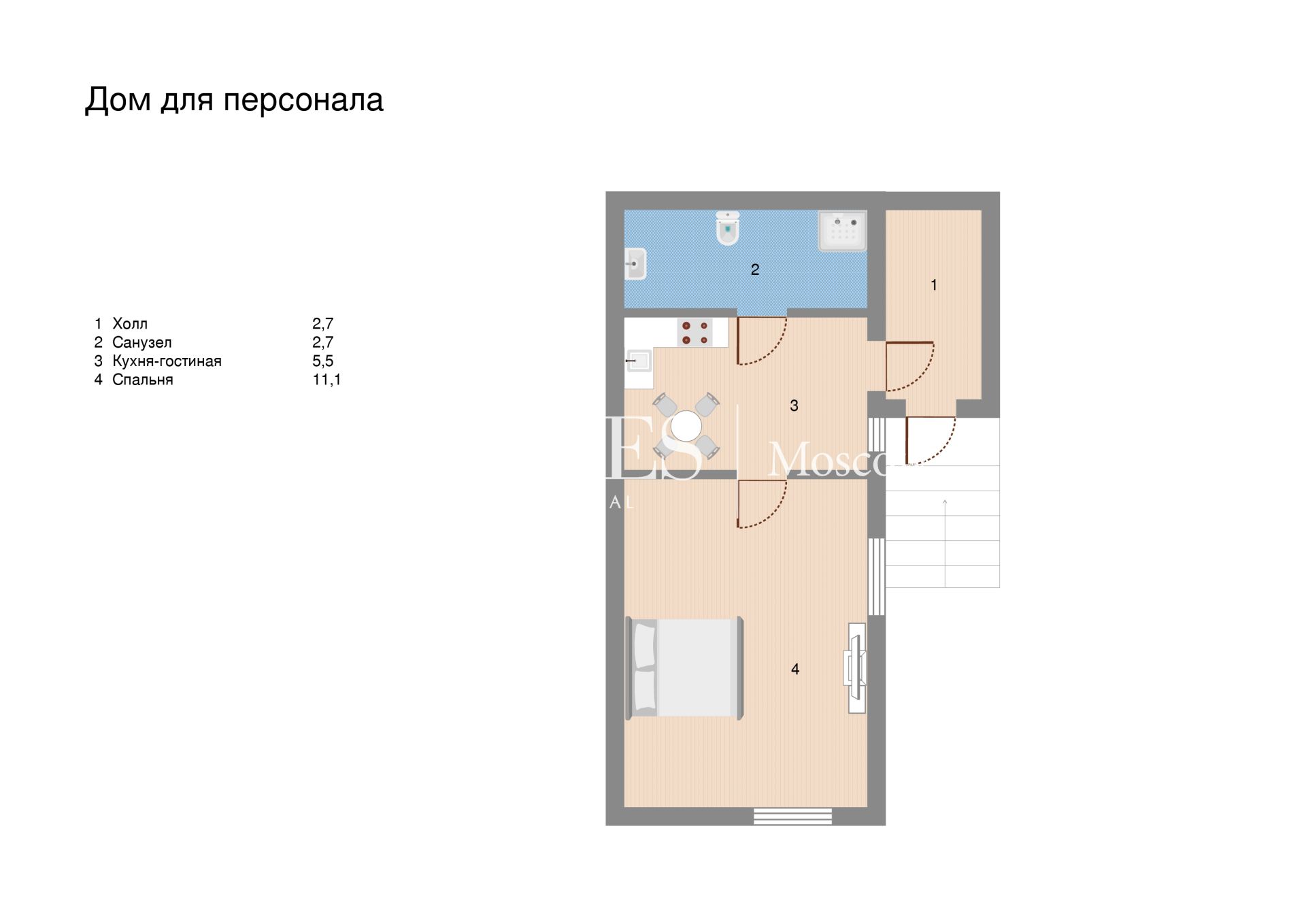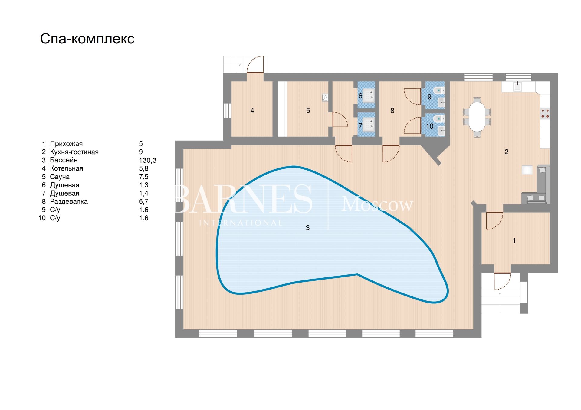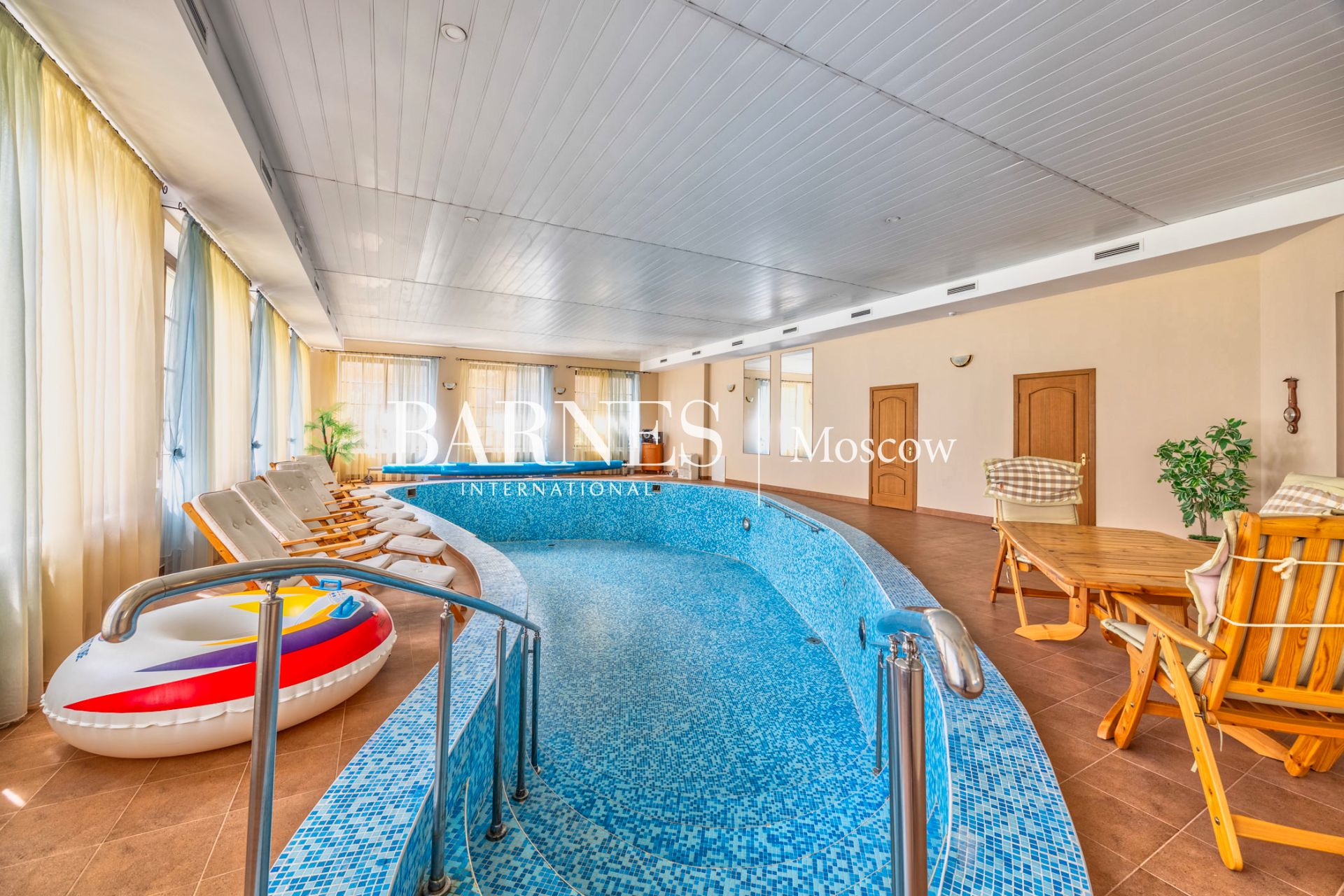 участке располагается большая спа-зона с бассейном, сауной и комнатой отдыха, беседка для барбекю с подведёнными коммуникациями, дом для персонала с мастерской и хозблок.
