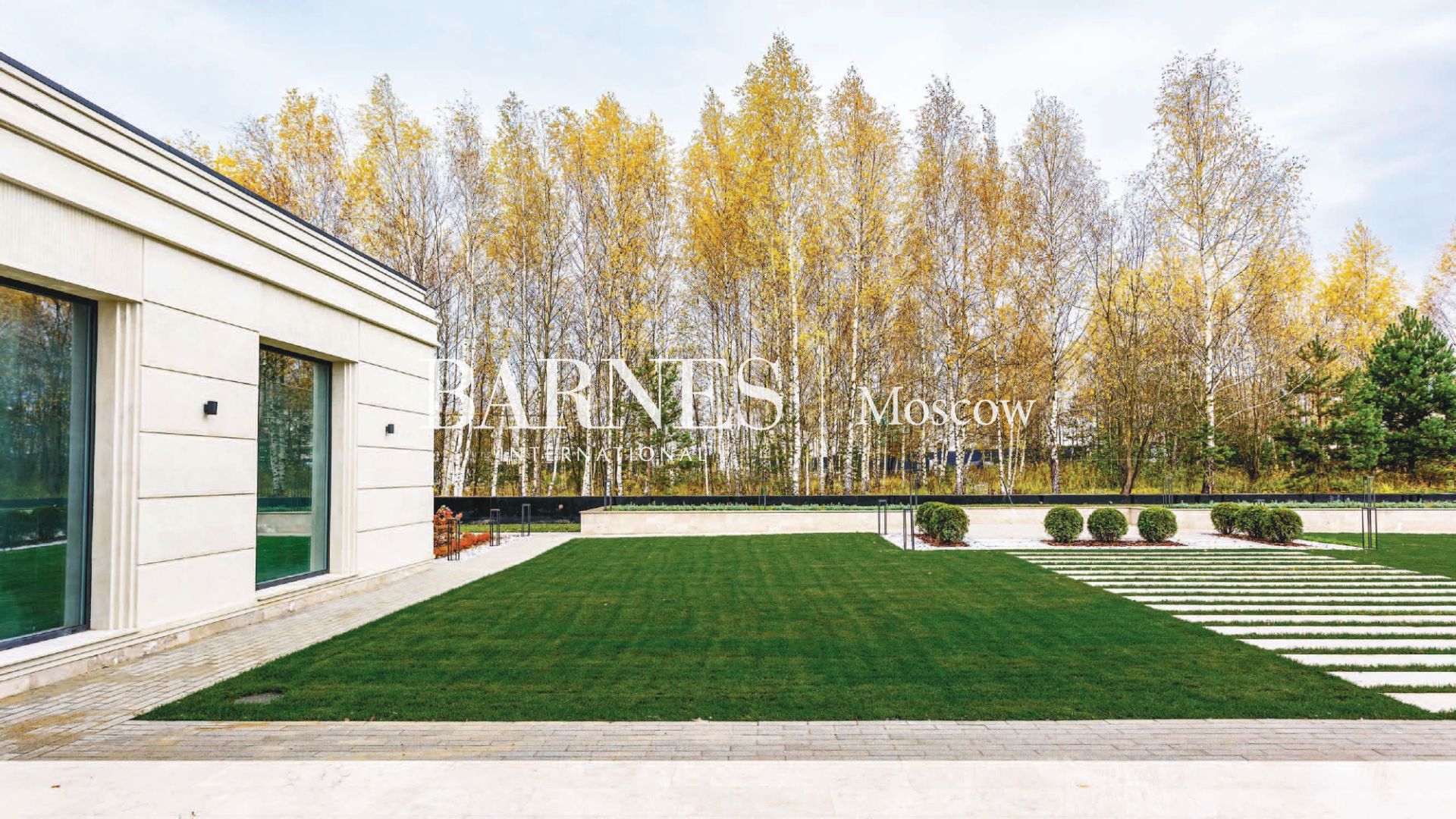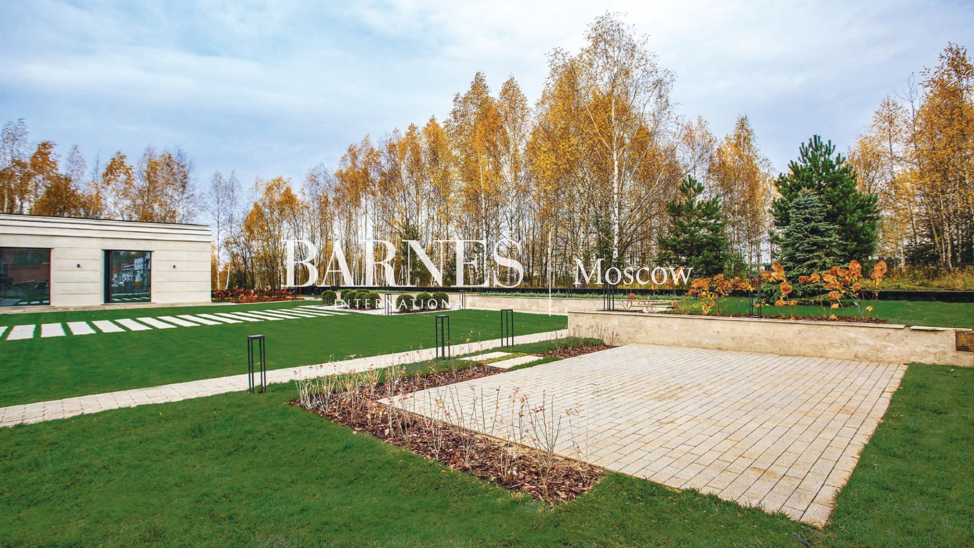 На участке проведены ландшафтные работы, высажены кустарники и крупномеры, вымощены дорожки, установлено освещение.