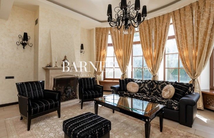 В отделке использованы натуральный массив дуба, мрамор и венецианская декоративная штукатурка. Стены жилых комнат оформлены английскими обоями.