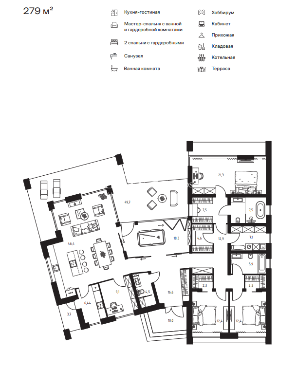 холл, гостиная-столовая-кухня с камином и выходом на крытую террасу, хобби-рум, мастер-спальня с гардеробной и с/у, 2 спальни с гардеробными, с/у, кладовая, с/у.