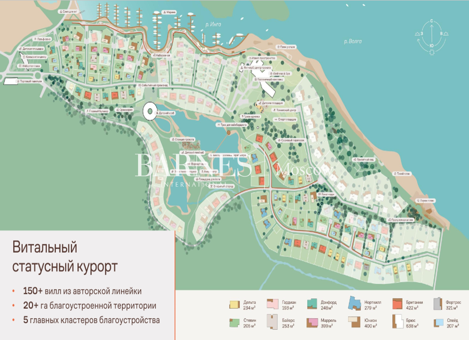 Площадь курорта PORT EMM ZAVIDOVO 50 га, 1,5 км. береговой линии, 50%+ озелененной территории, густой смешанный лес по границе.