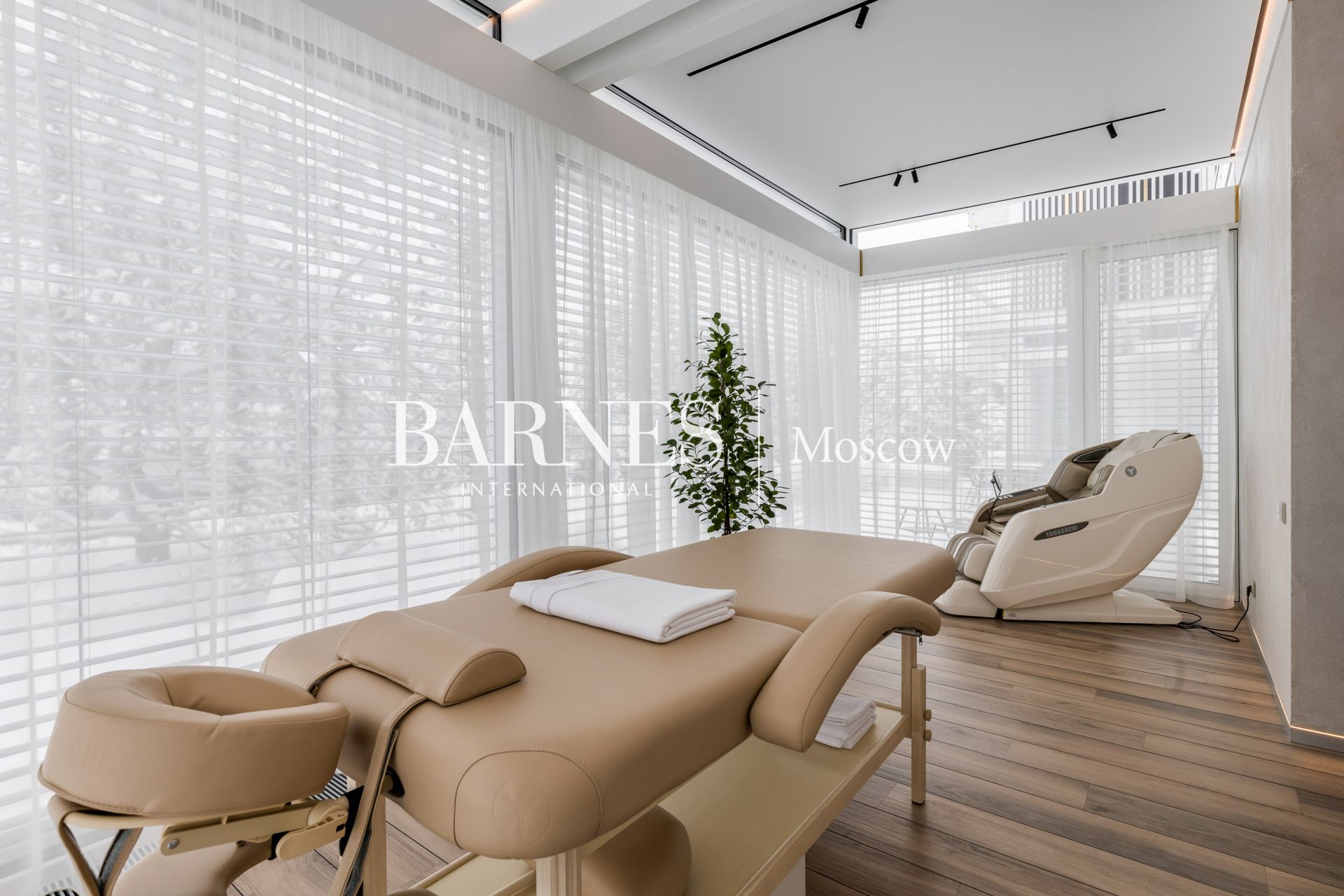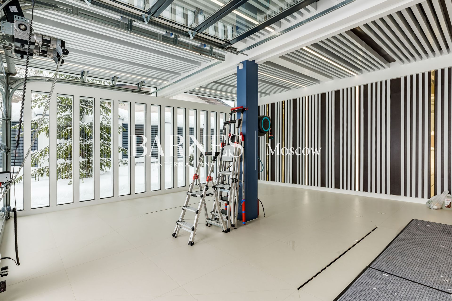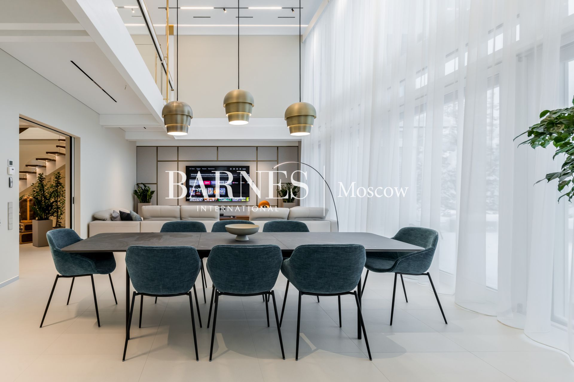 1 этаж: холл, гостиная со вторым светом и выходом на террасу, кухня-столовая зона, гостевая спальня, SPA-зона, фитнес-зона, 4 с/у, гардеробная, прачечная, техническое помещение, блок персонала, гараж.