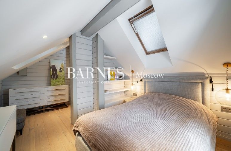 Фасад из клееного бруса в благородном табачном оттенке дополнен изящным световым сценарием, подчеркивающим архитектуру в вечернее время. Французские окна в пол и миниатюрные балкончики наполняют комнаты светом, стирая границы с природой.