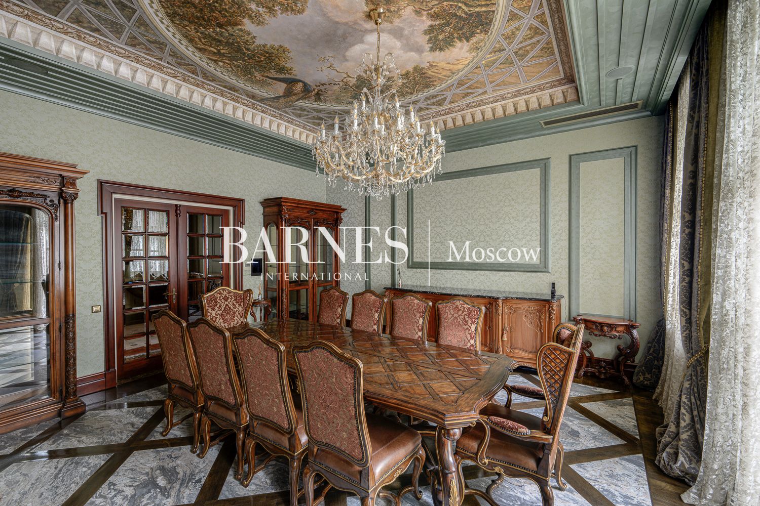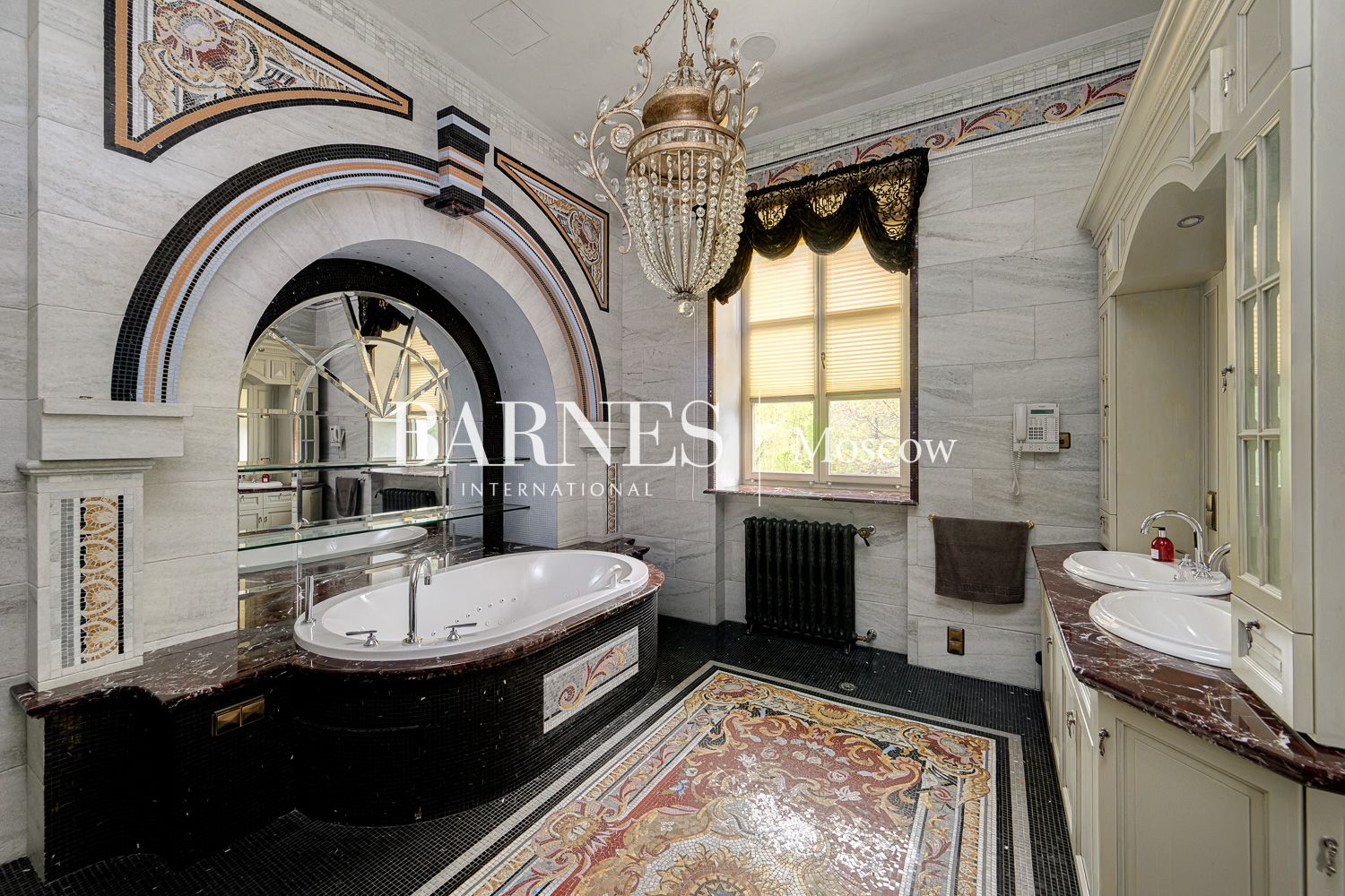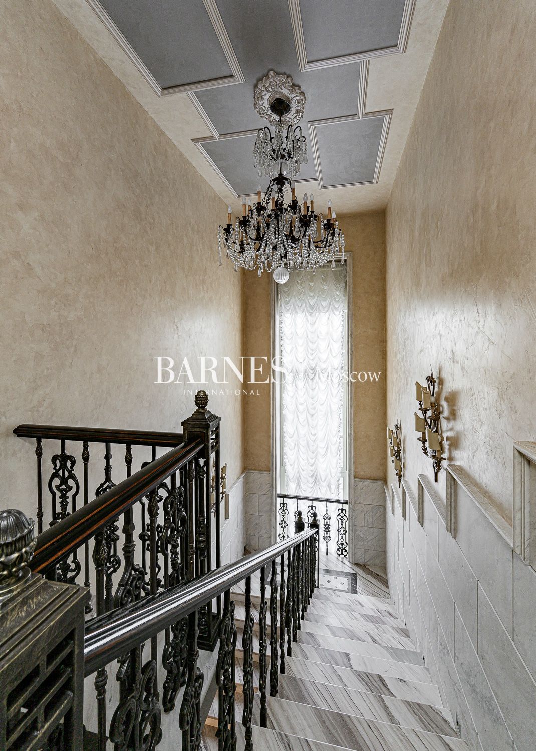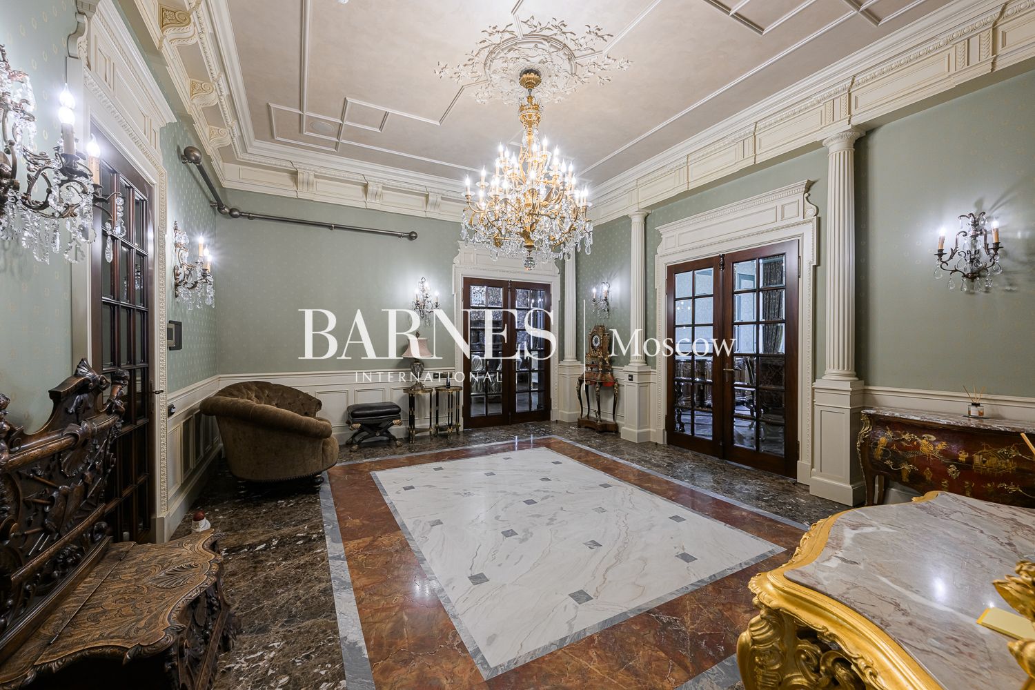 Внутреннее пространство дома поражает благородством фактур. Изысканная отделка из мрамора и ценных пород дерева создает атмосферу вневременной классики.