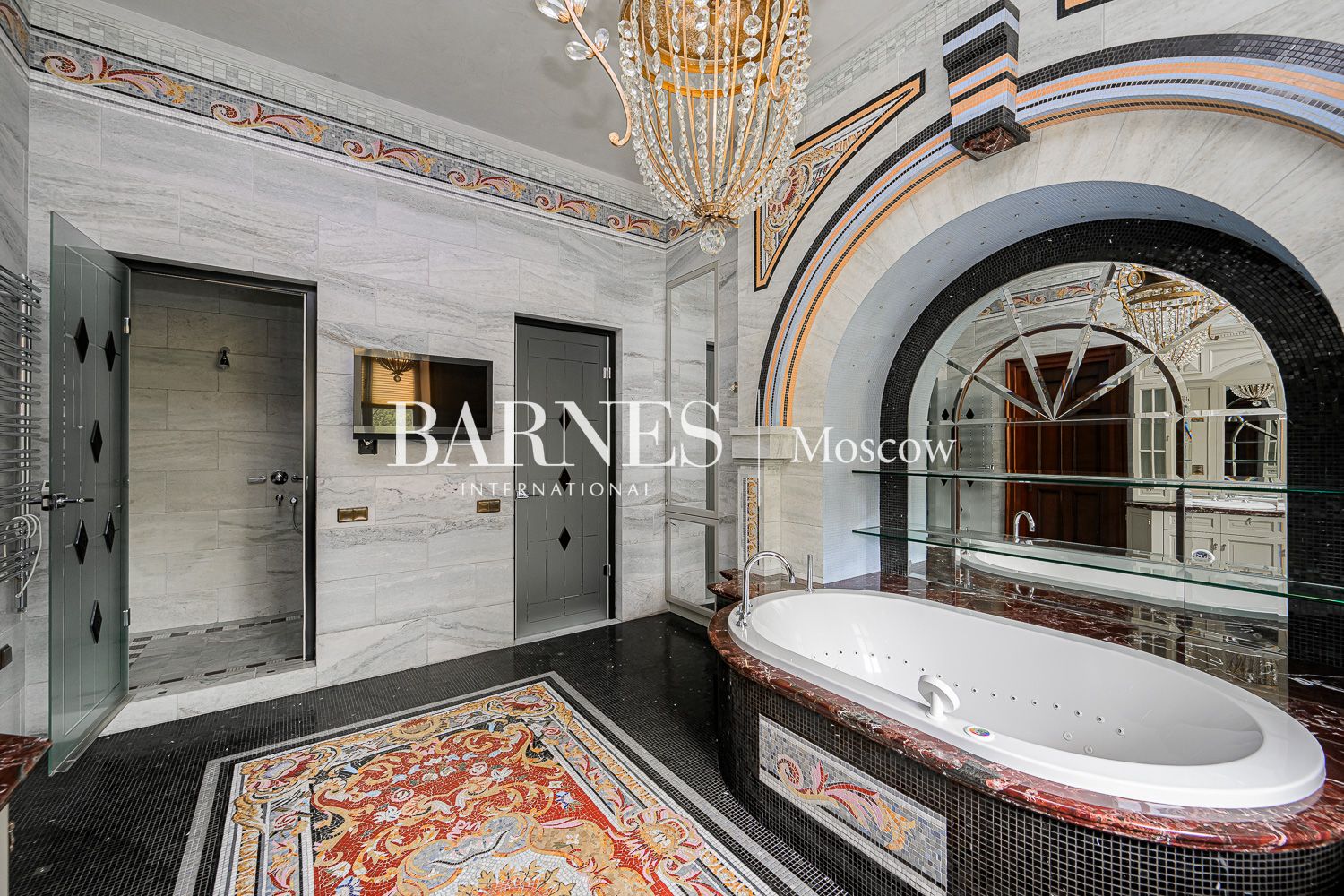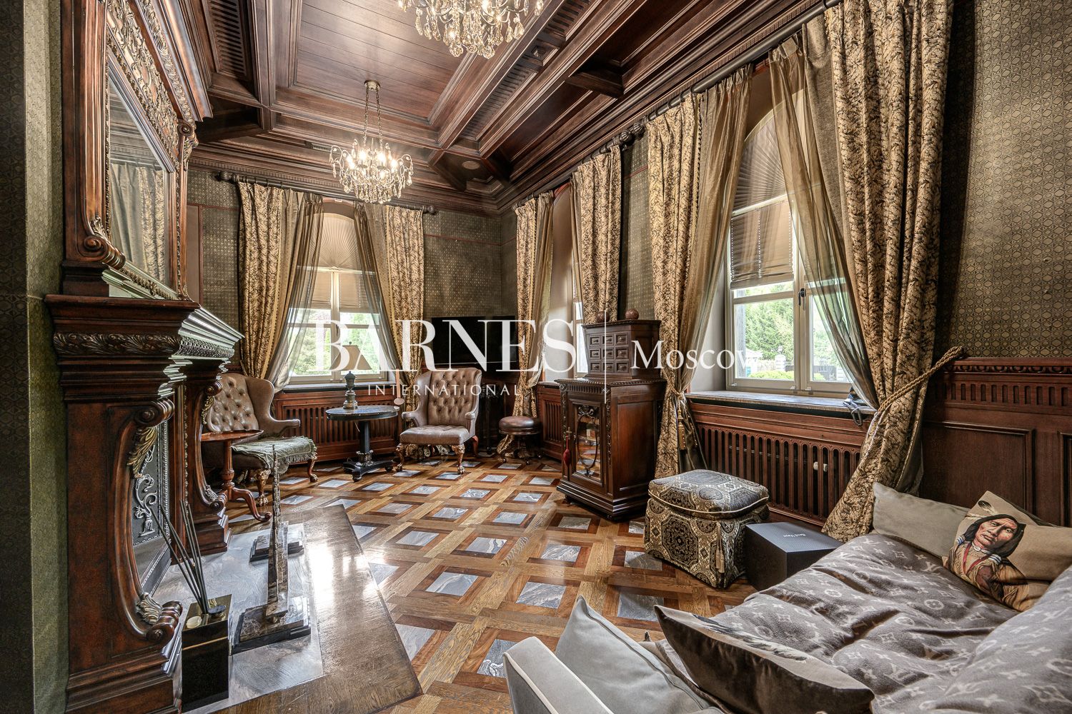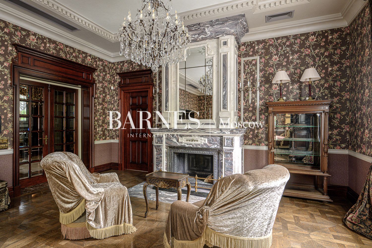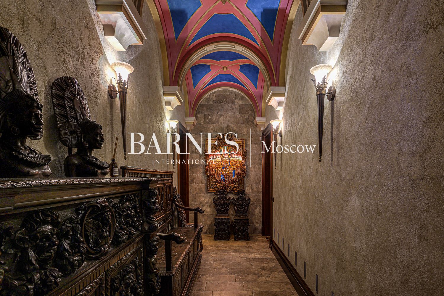 Внутреннее пространство дома поражает благородством фактур. Изысканная отделка из мрамора и ценных пород дерева создает атмосферу вневременной классики.