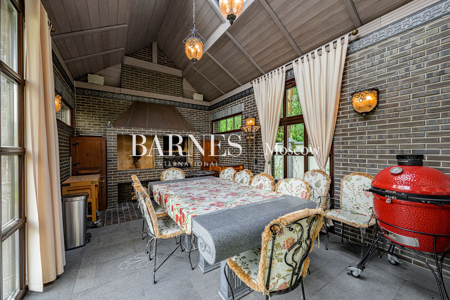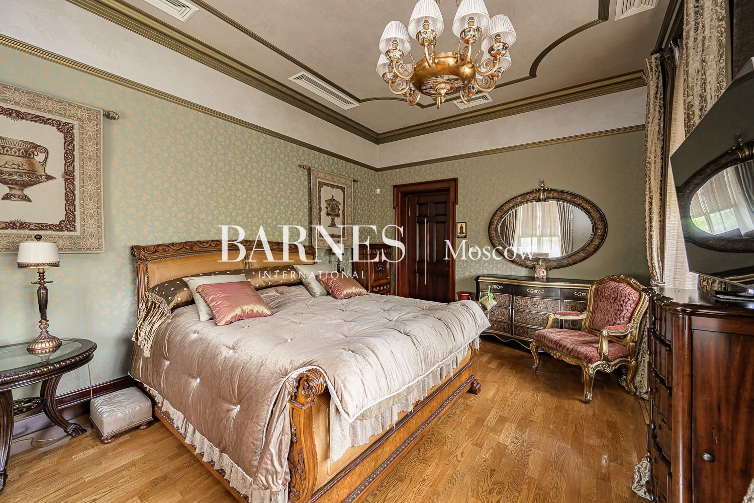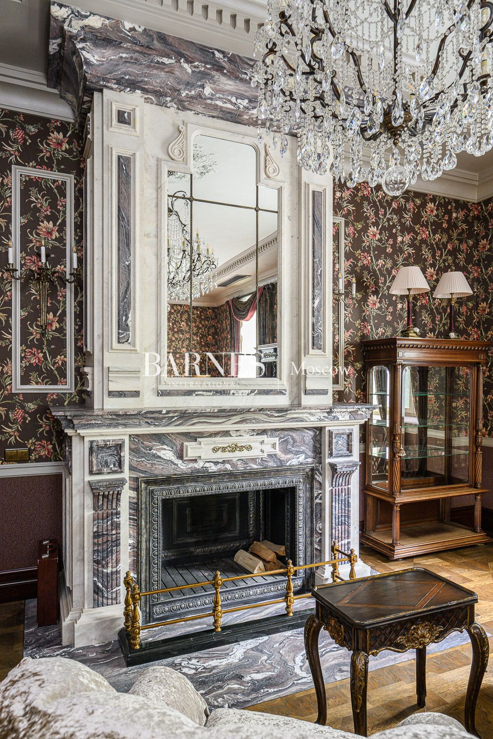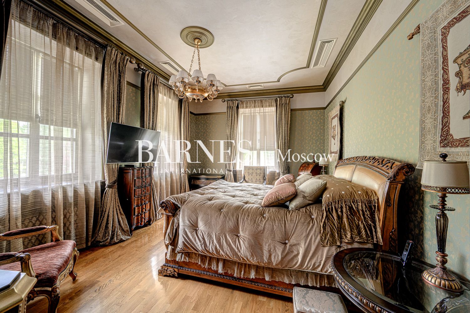 Внутреннее пространство дома поражает благородством фактур. Изысканная отделка из мрамора и ценных пород дерева создает атмосферу вневременной классики.