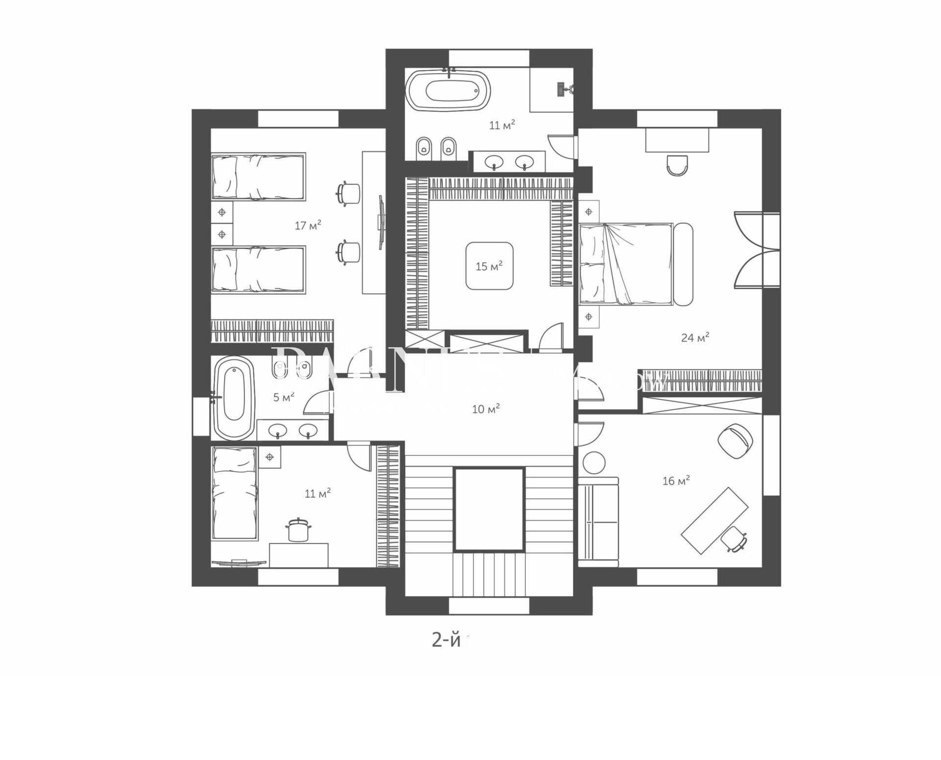 • Второй уровень: мастер-спальня с санузлом, гардеробная, кабинет, 2 спальнис санузлом.