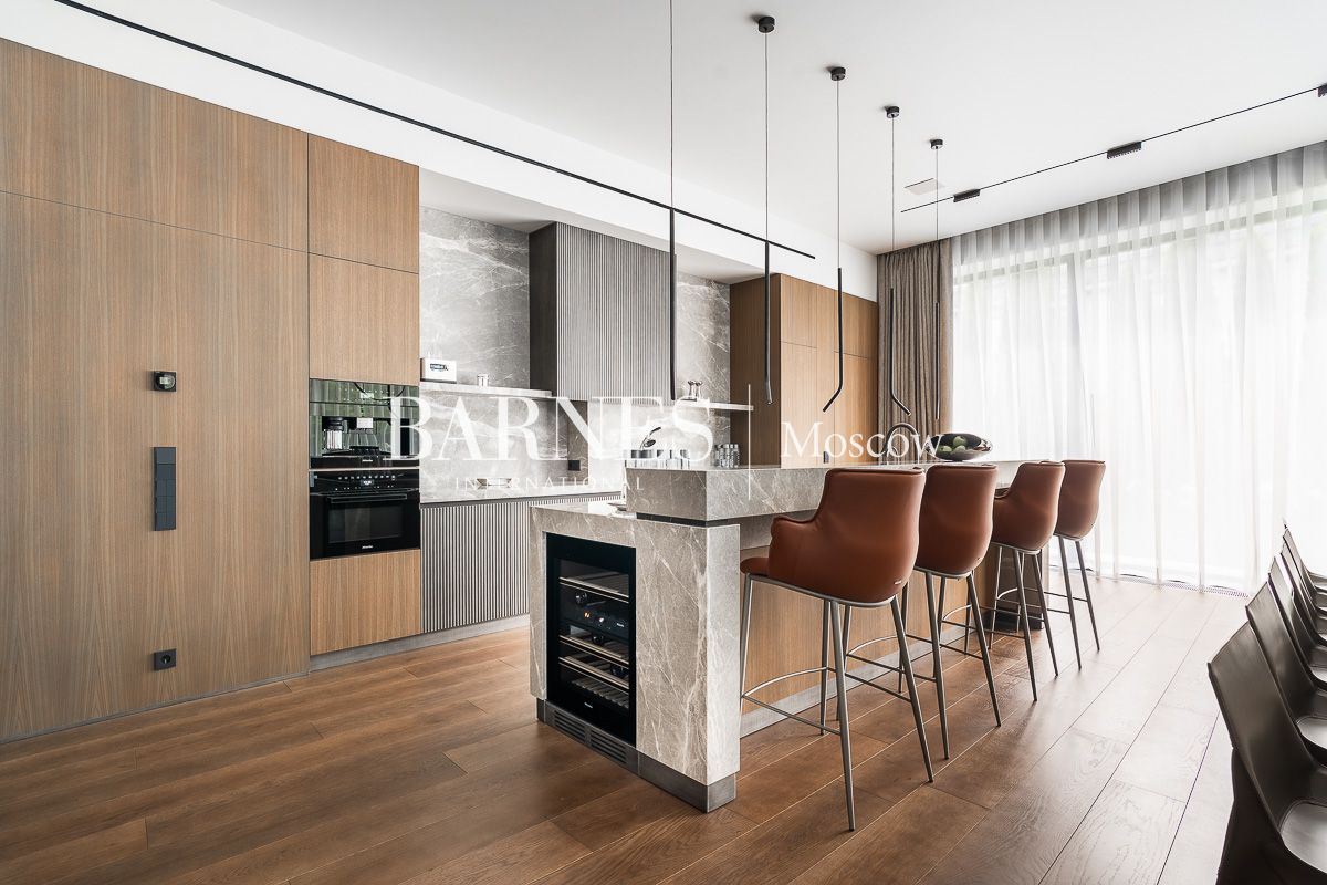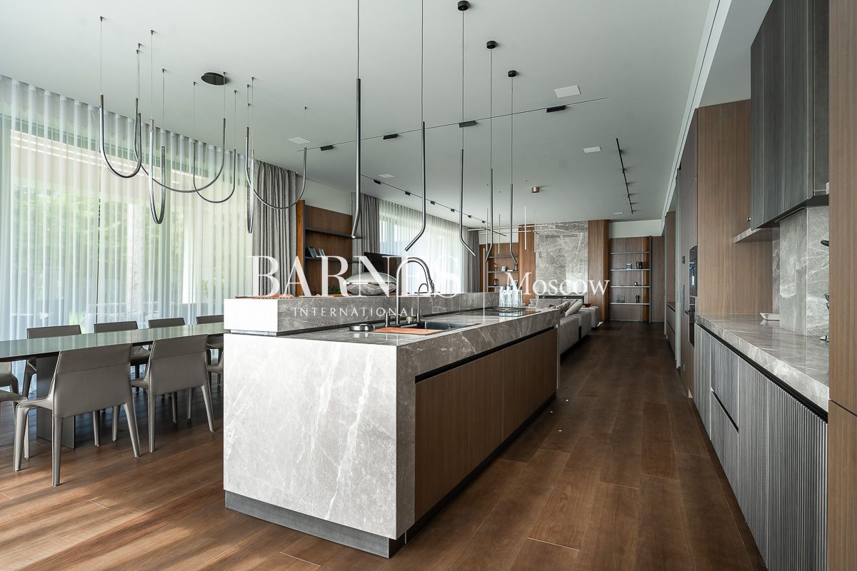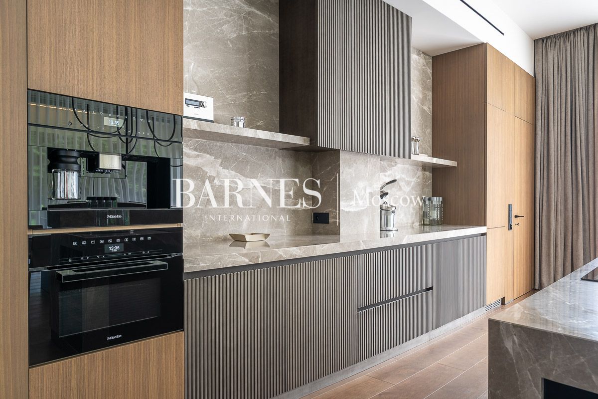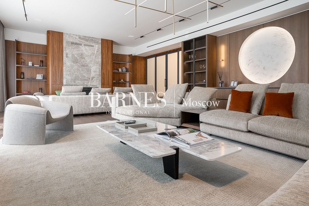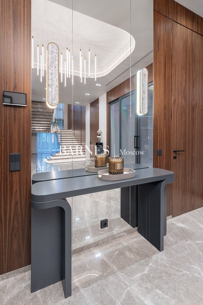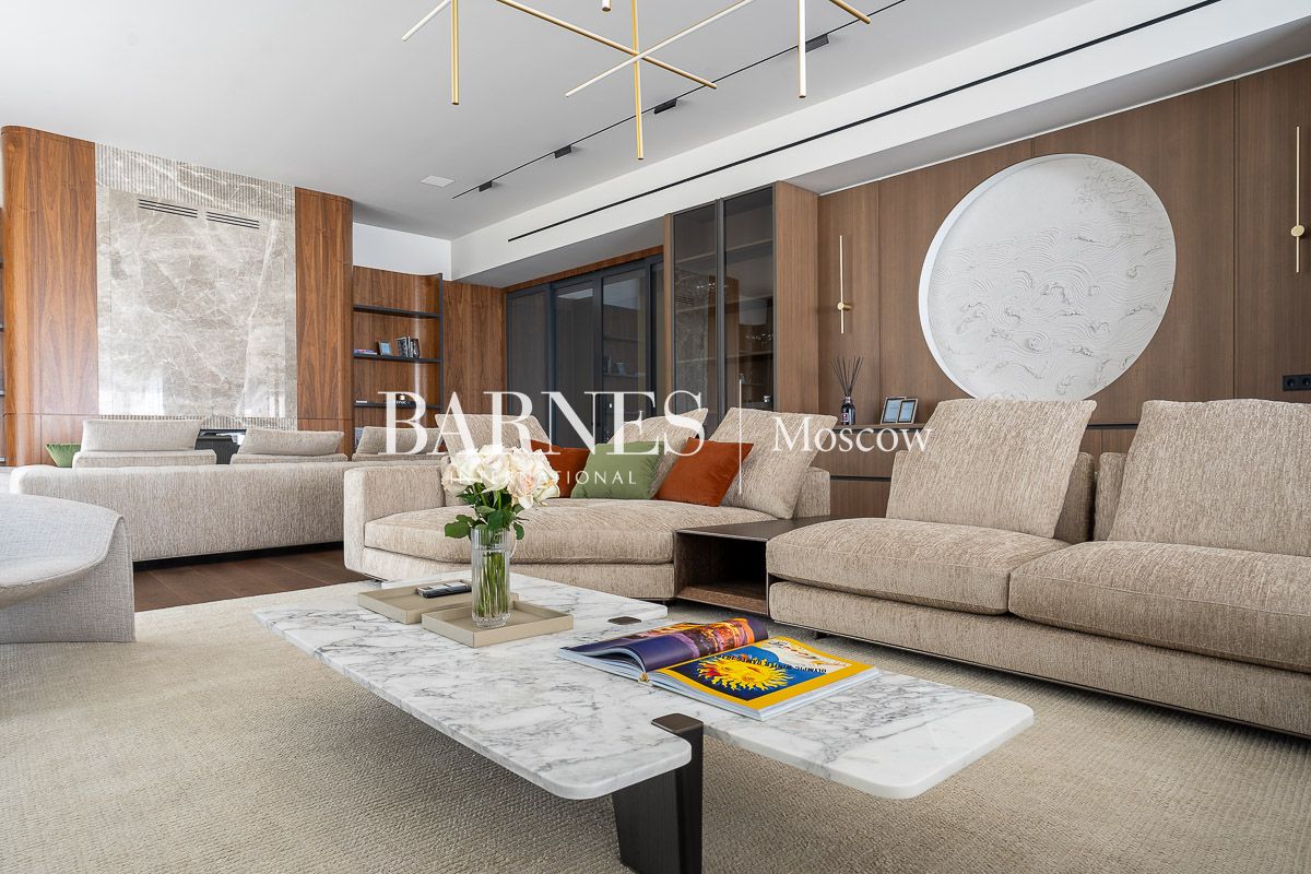 В отделке использованы высококачественные натуральные материалы: мрамор и ценные породы дерева. Интерьер укомплектован мебелью ведущих итальянских брендов: Minotti, Poltrona Frau, Poliform и Porada. Кухня оснащена техникой Miele, а постирочная — профессиональным оборудованием Asko.