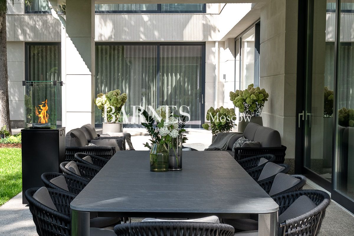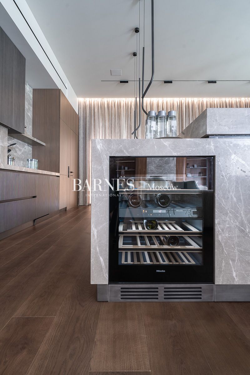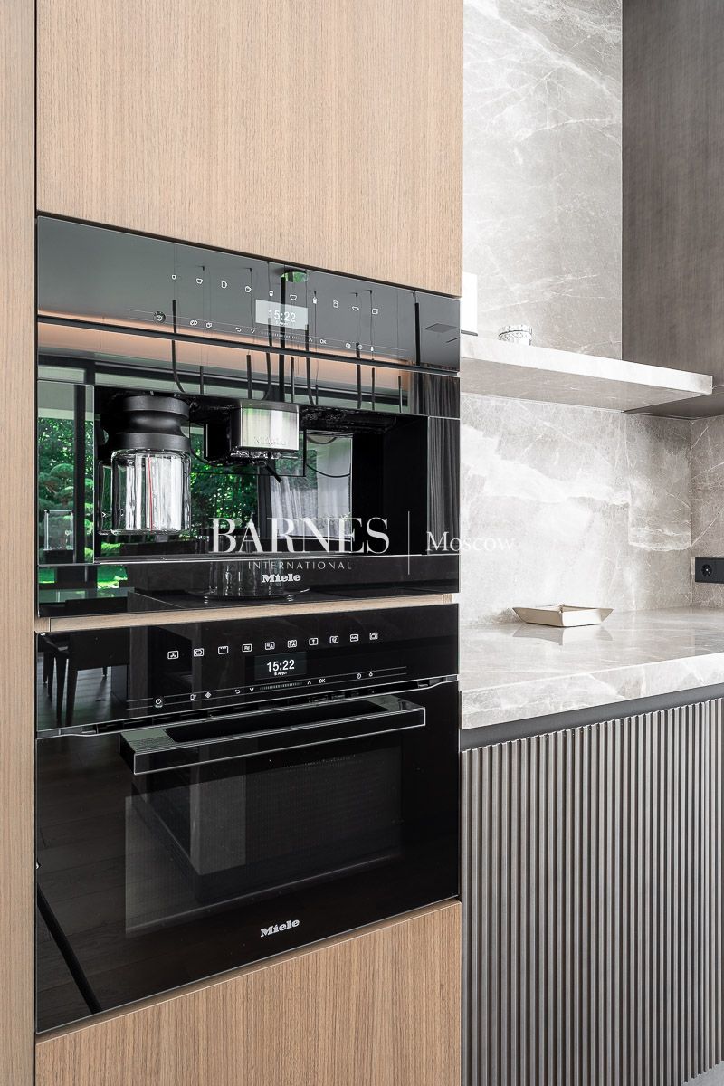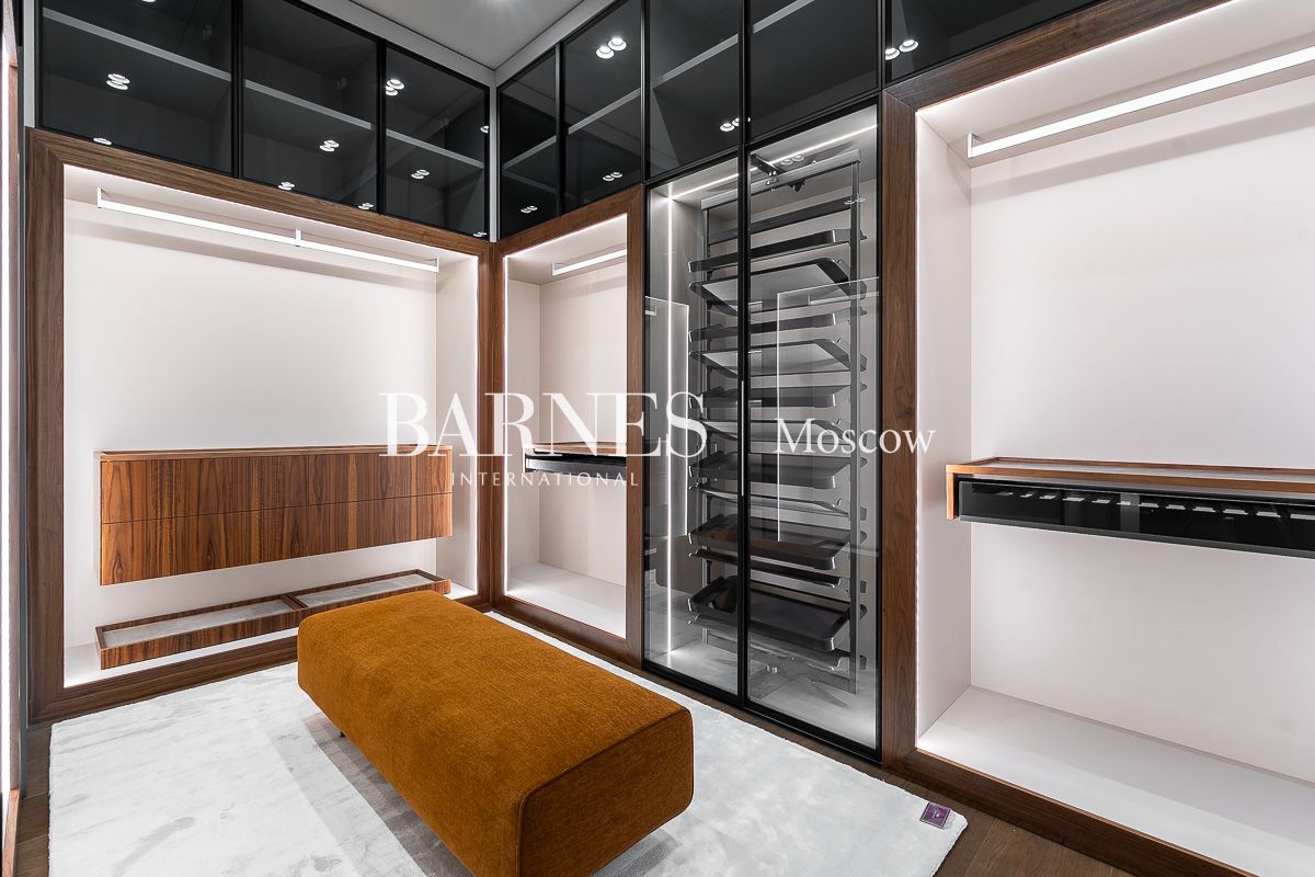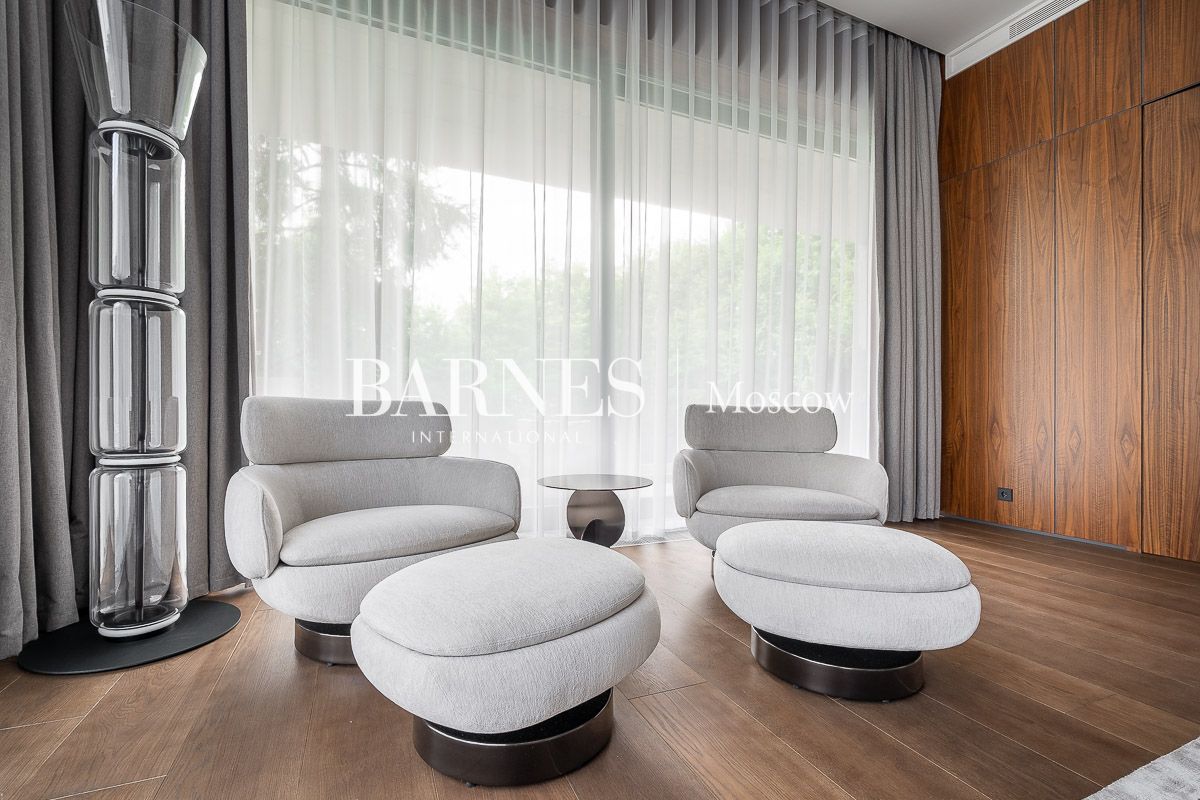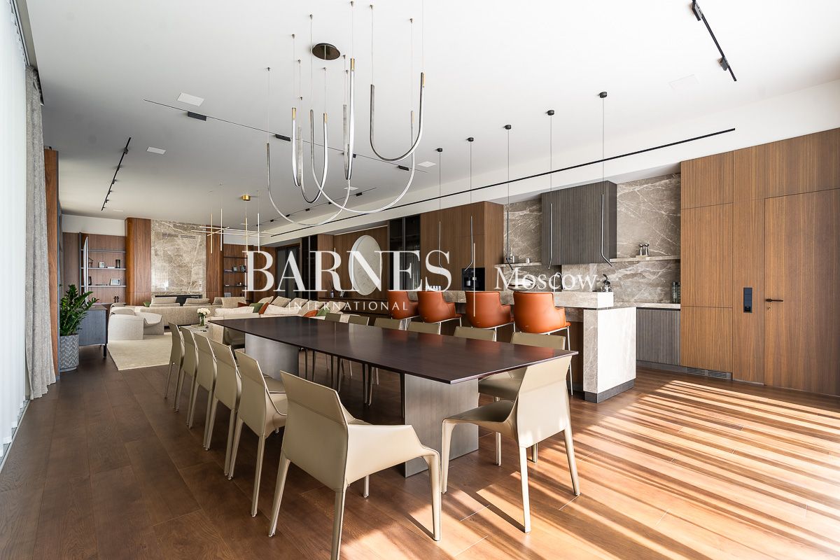 В отделке использованы высококачественные натуральные материалы: мрамор и ценные породы дерева. Интерьер укомплектован мебелью ведущих итальянских брендов: Minotti, Poltrona Frau, Poliform и Porada. Кухня оснащена техникой Miele, а постирочная — профессиональным оборудованием Asko.