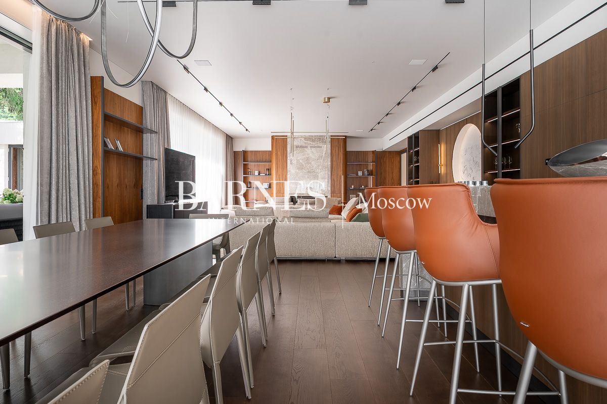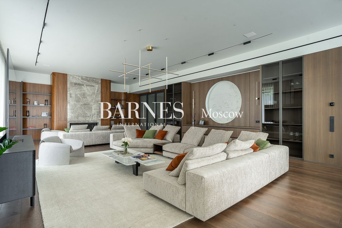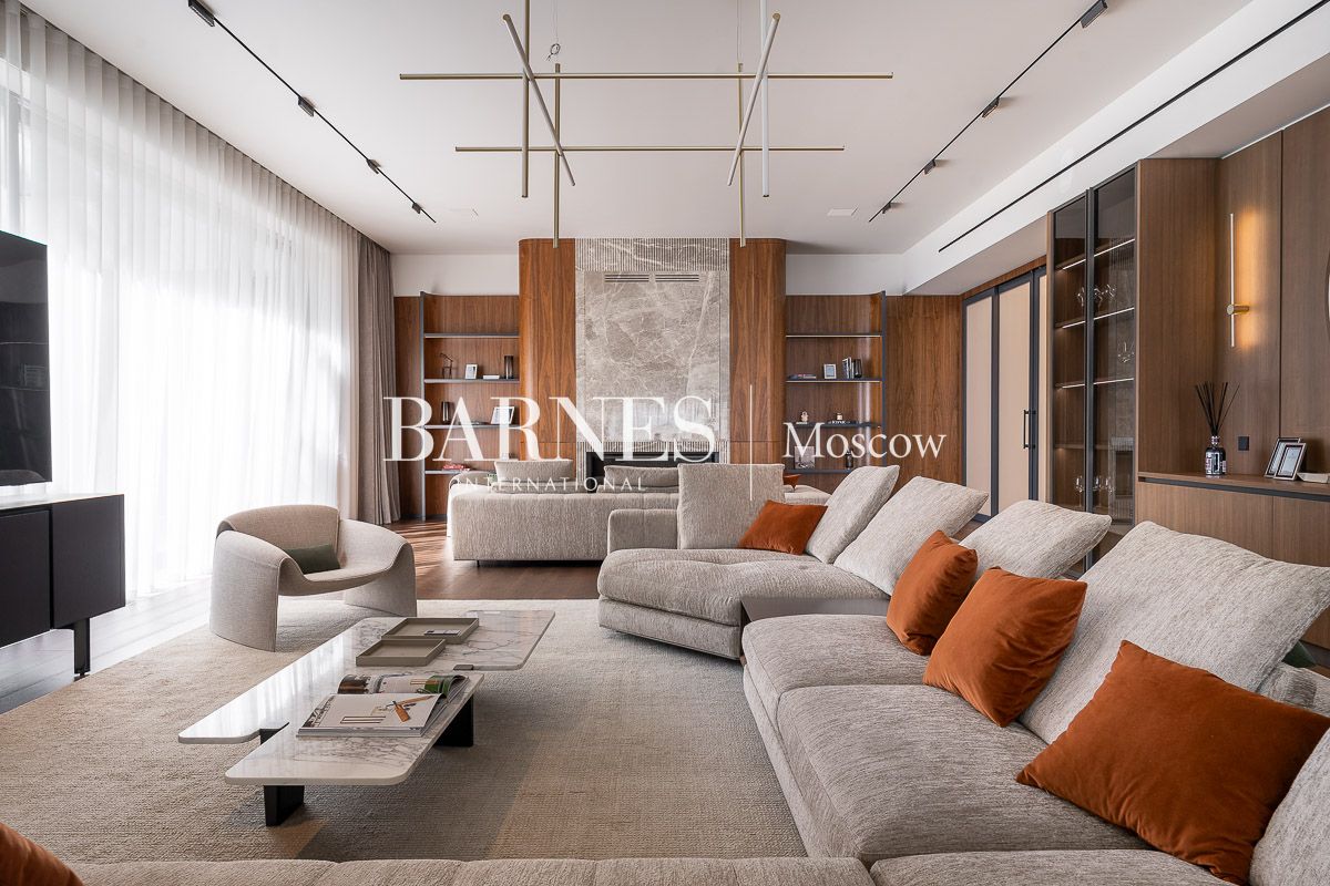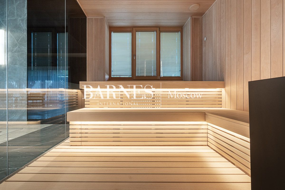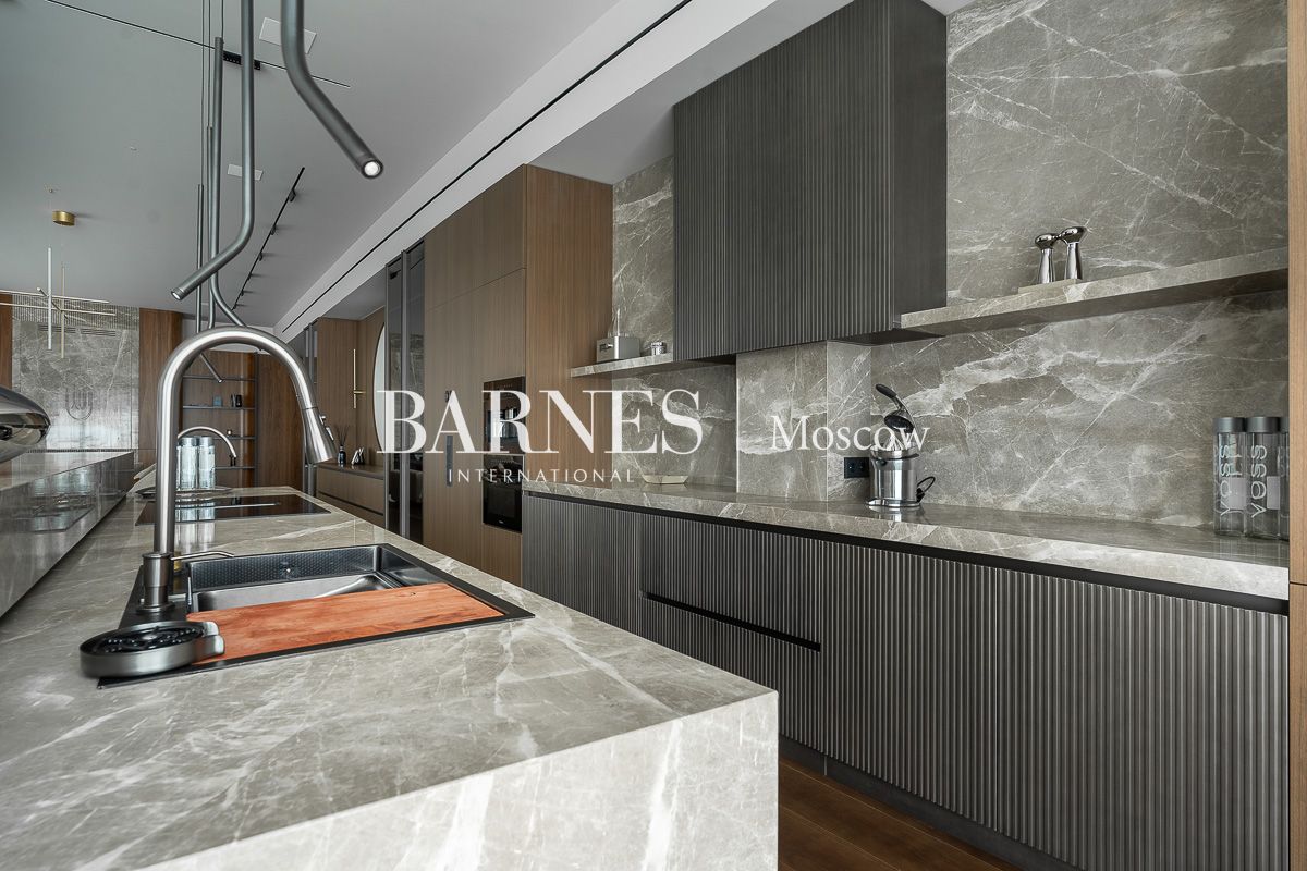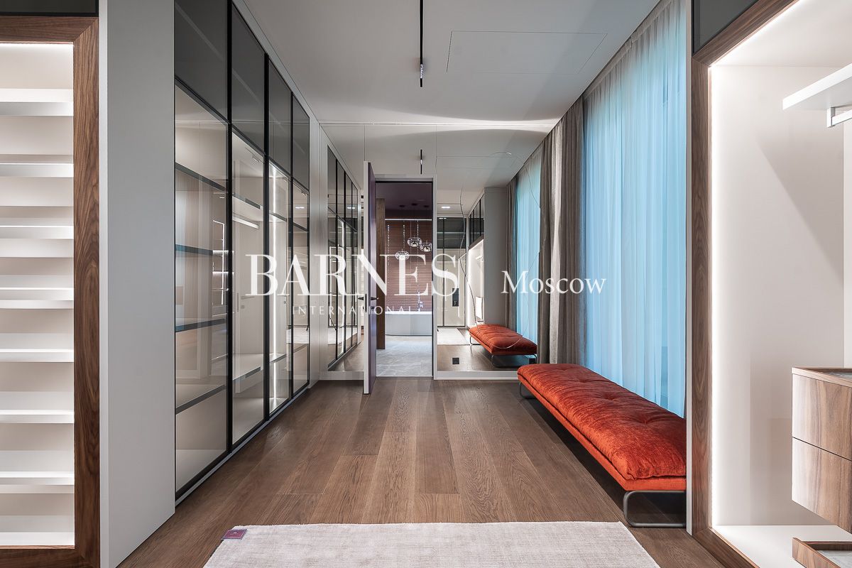В отделке использованы высококачественные натуральные материалы: мрамор и ценные породы дерева. Интерьер укомплектован мебелью ведущих итальянских брендов: Minotti, Poltrona Frau, Poliform и Porada. Кухня оснащена техникой Miele, а постирочная — профессиональным оборудованием Asko.