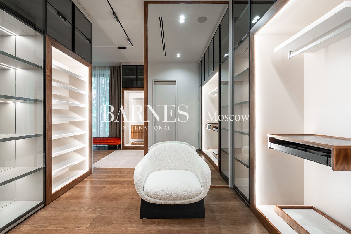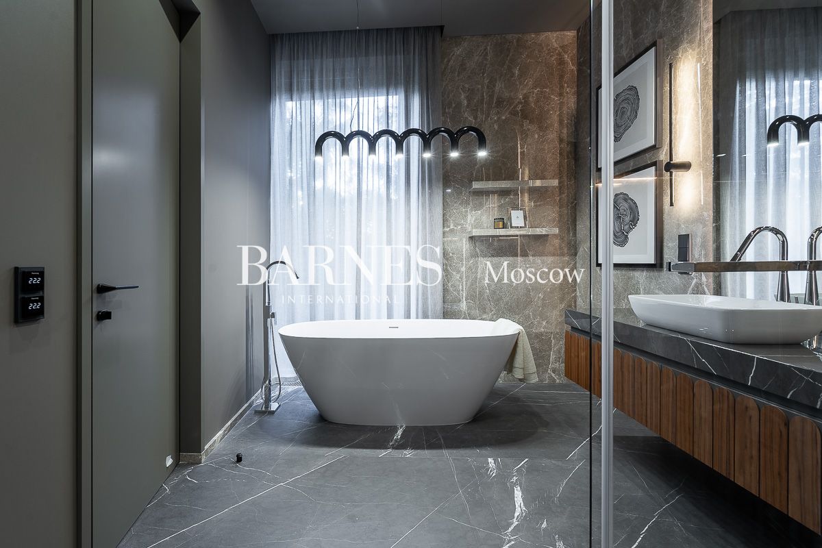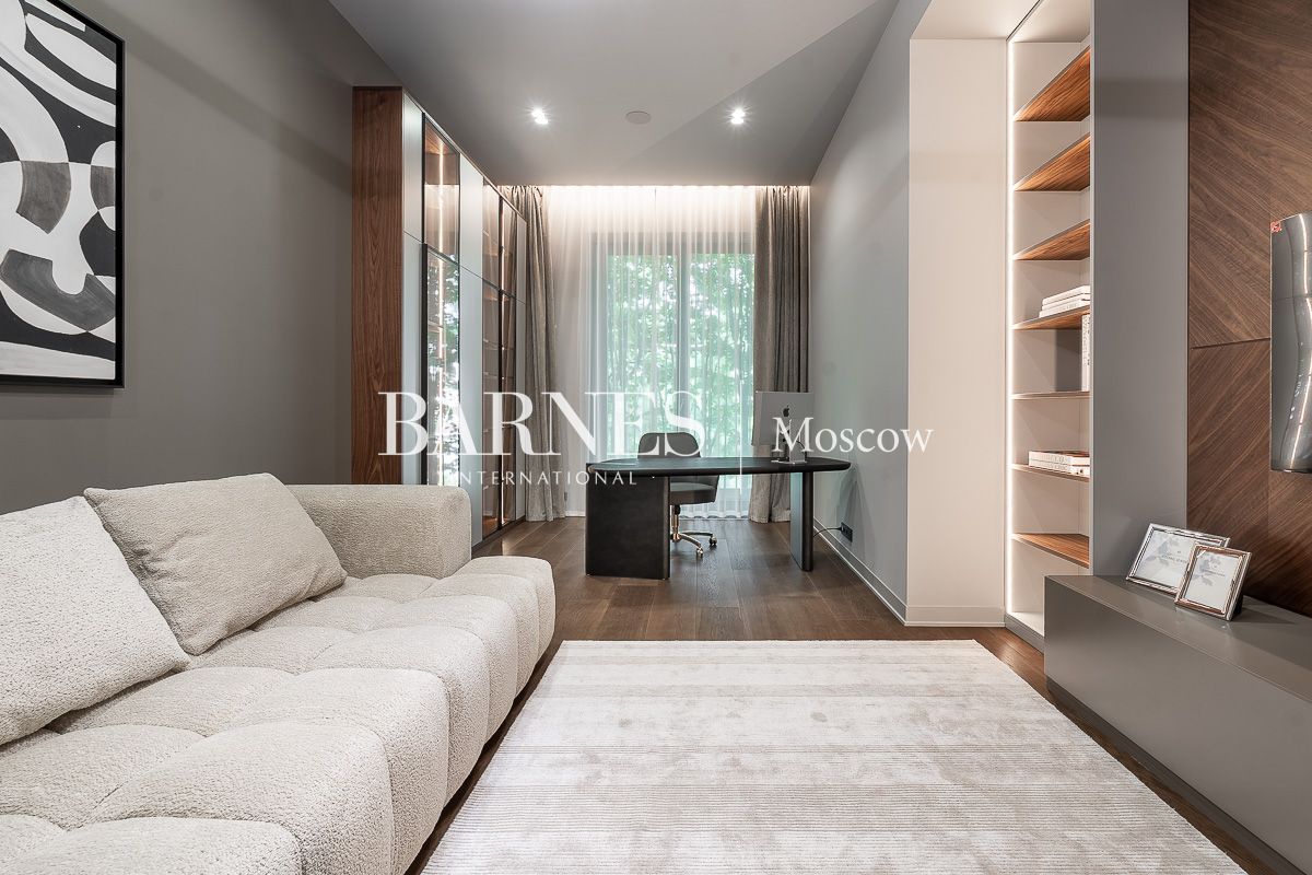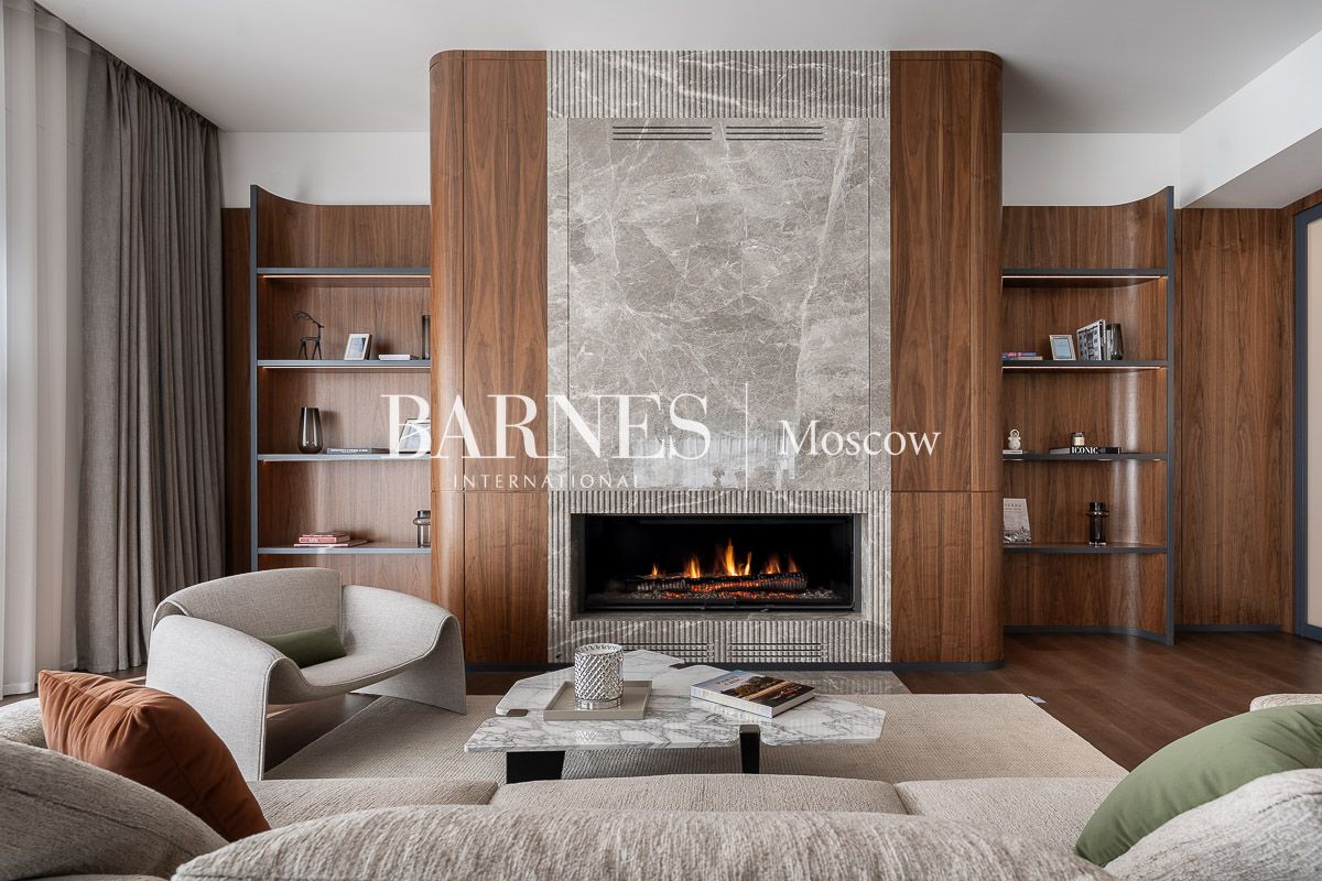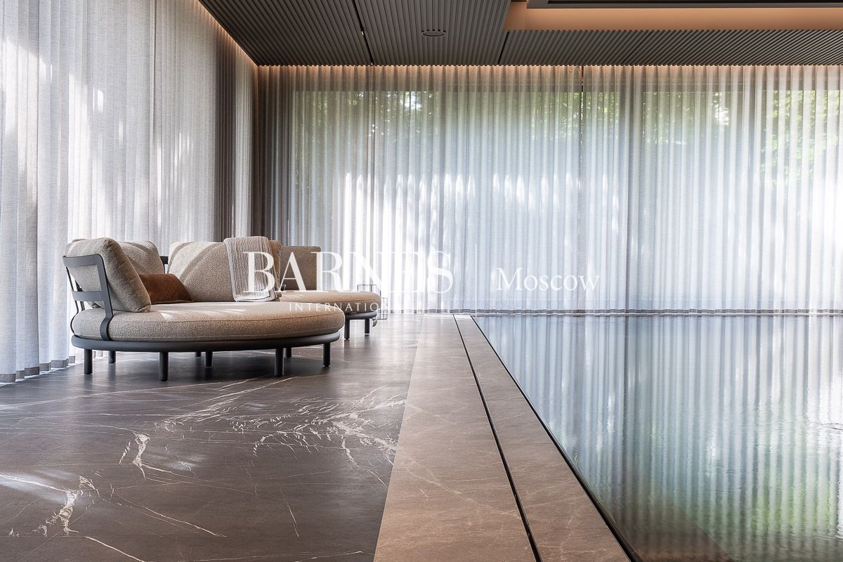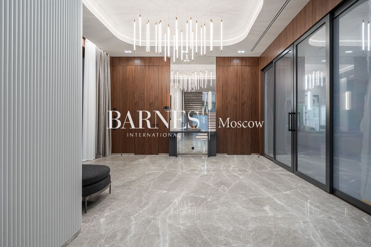 В отделке использованы высококачественные натуральные материалы: мрамор и ценные породы дерева. Интерьер укомплектован мебелью ведущих итальянских брендов: Minotti, Poltrona Frau, Poliform и Porada. Кухня оснащена техникой Miele, а постирочная — профессиональным оборудованием Asko.
