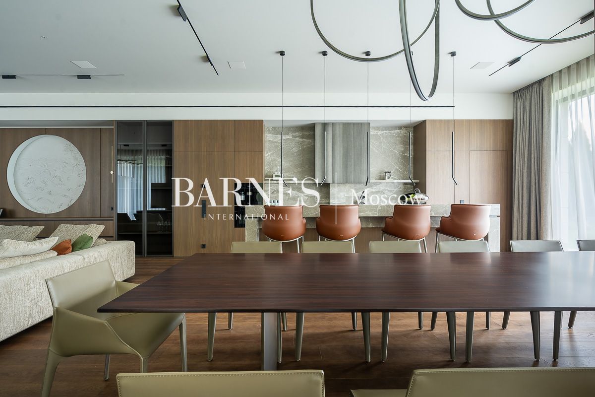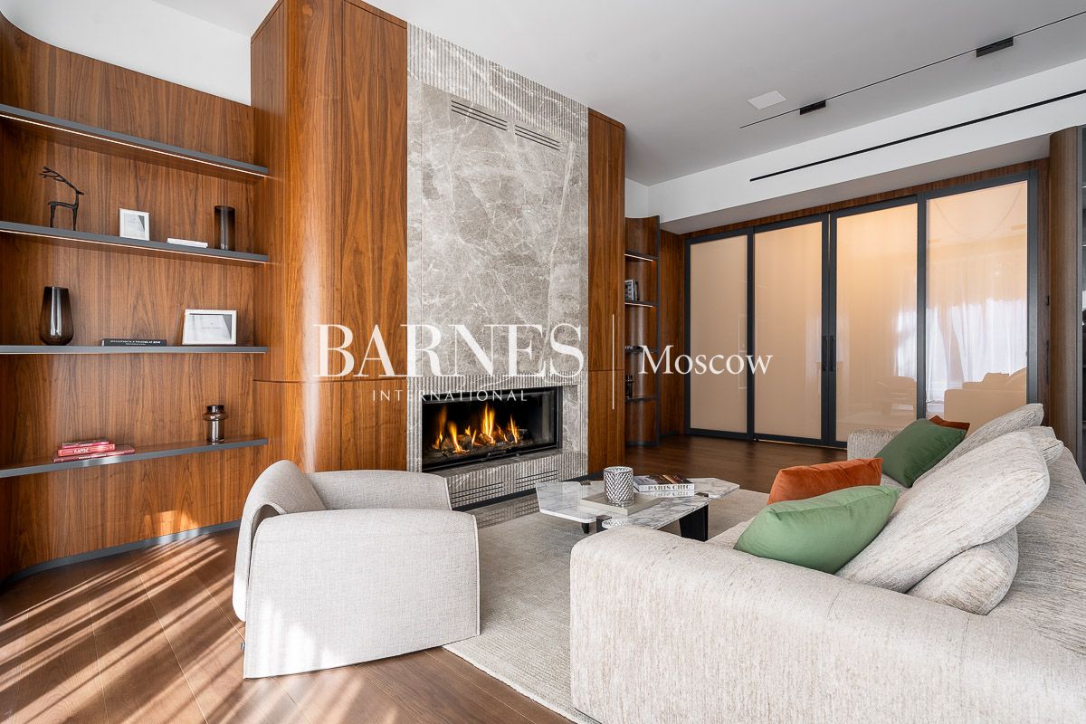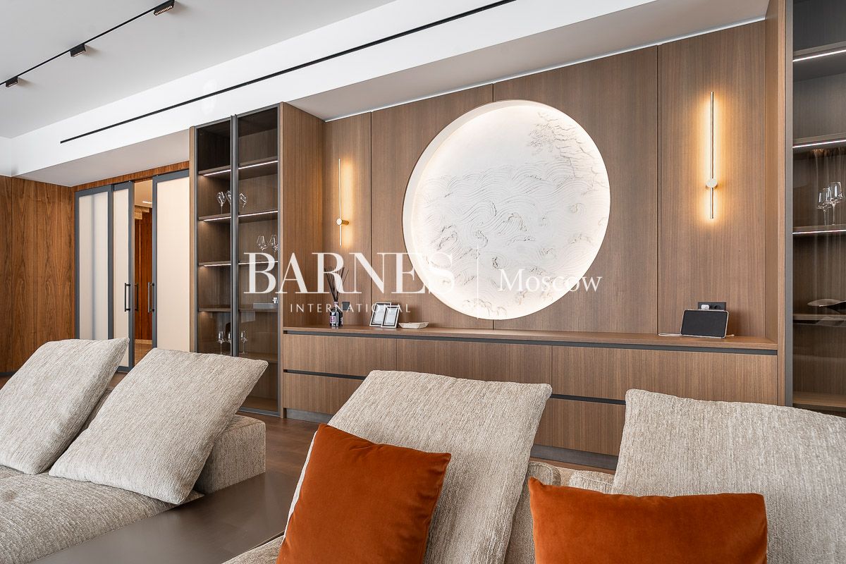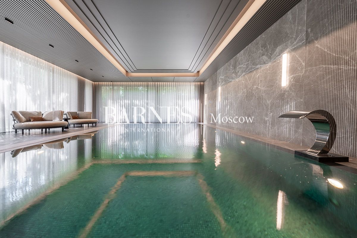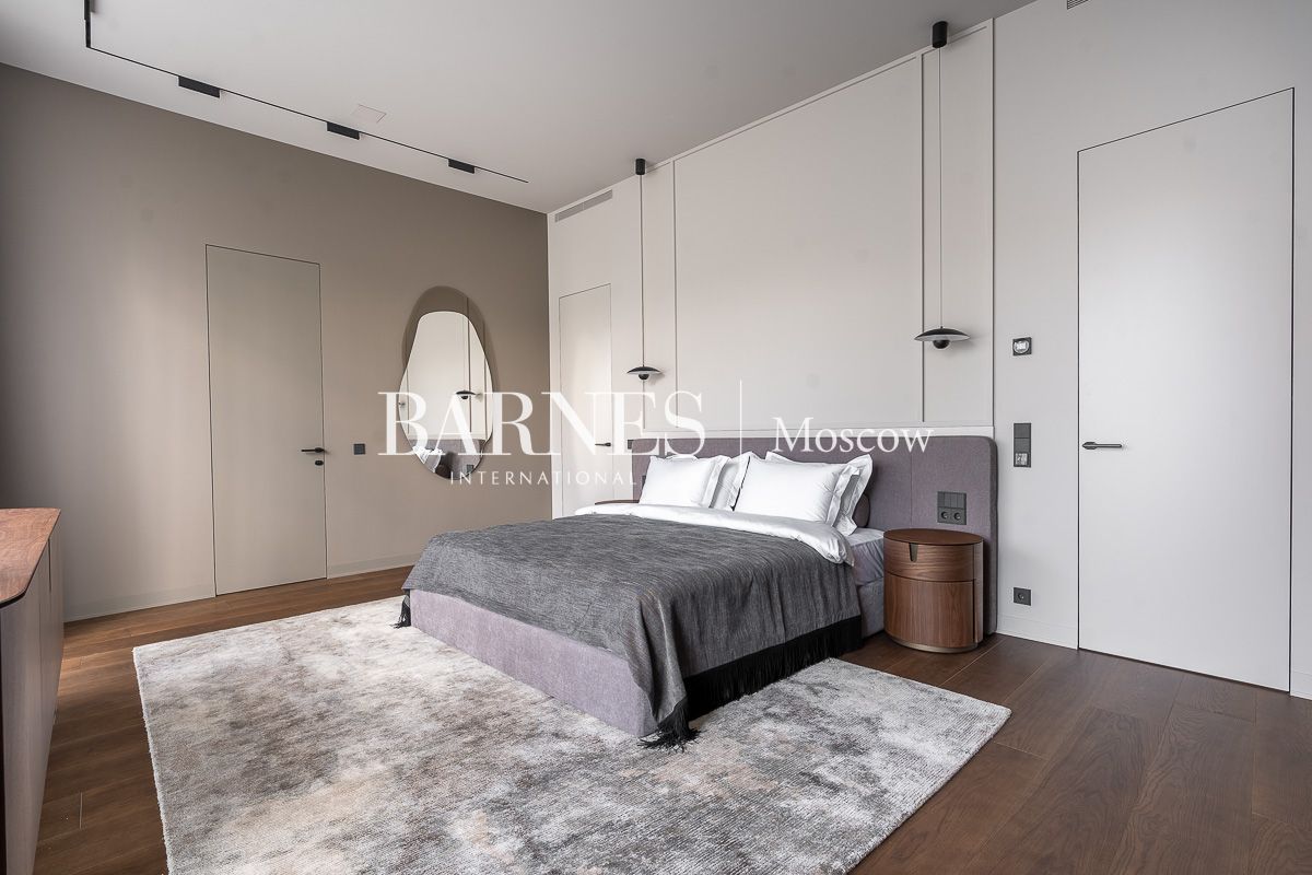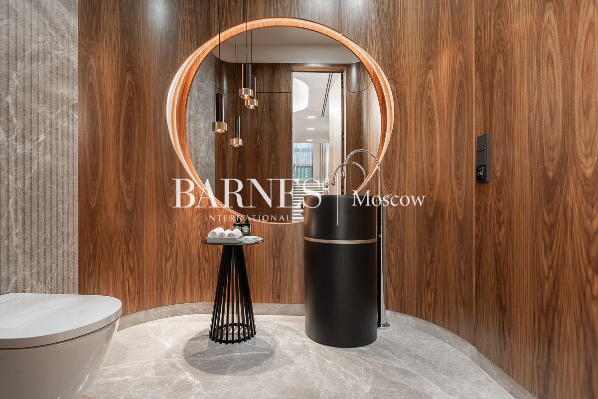 В отделке использованы высококачественные натуральные материалы: мрамор и ценные породы дерева. Интерьер укомплектован мебелью ведущих итальянских брендов: Minotti, Poltrona Frau, Poliform и Porada. Кухня оснащена техникой Miele, а постирочная — профессиональным оборудованием Asko.